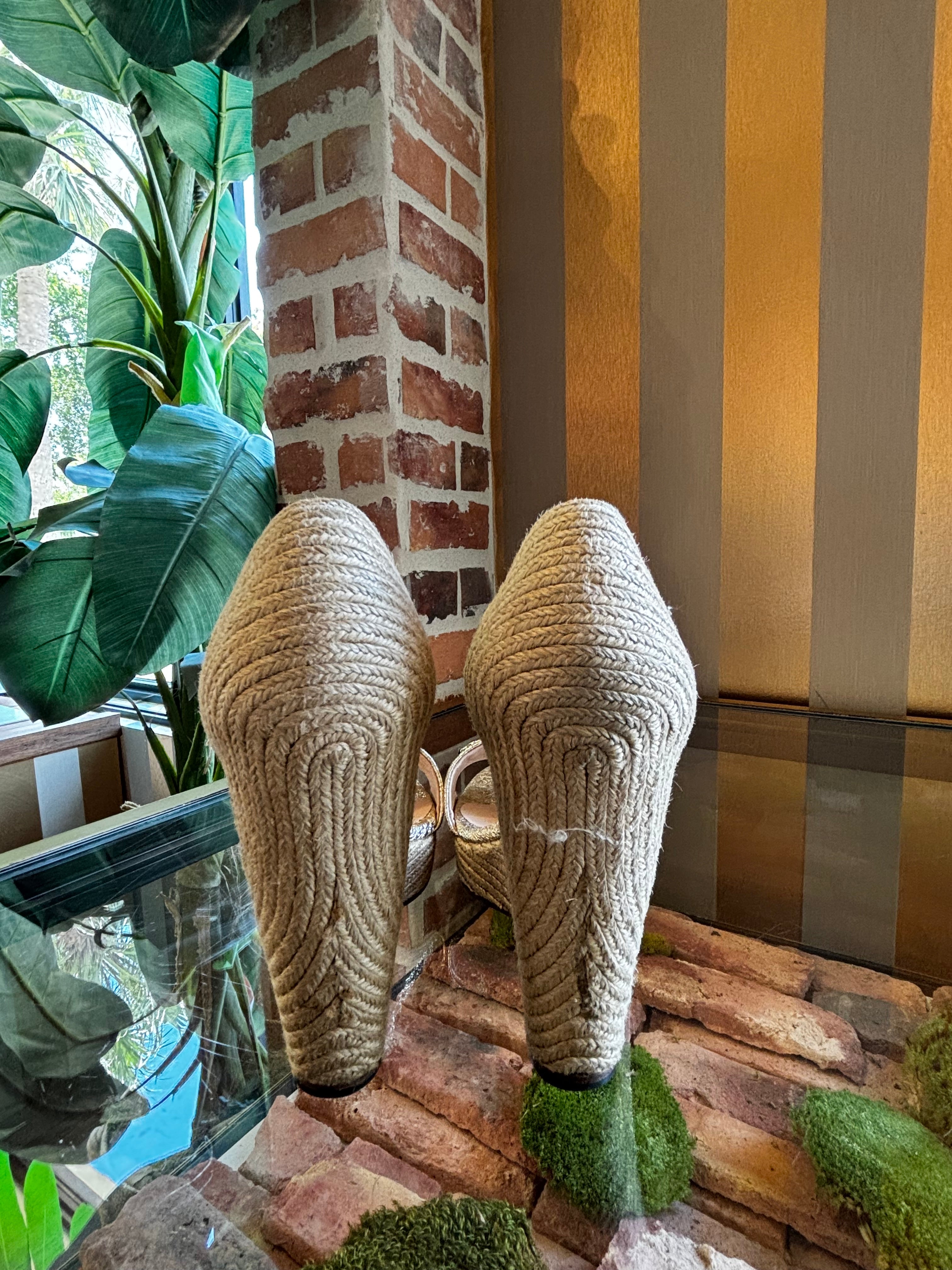 Elevate your style with the GUCCI Gold Crackled Leather Carolina Espadrilles Wedges. Crafted from luxurious crackled gold leather, these wedges blend timeless elegance with modern flair. The espadrille design offers comfortable height and a chic silhouette, perfect for sophisticated occasions or refined everyday wear. A statement piece that effortlessly enhances any ensemble with a touch of glamour. Overall in Very Good Condition. B+
