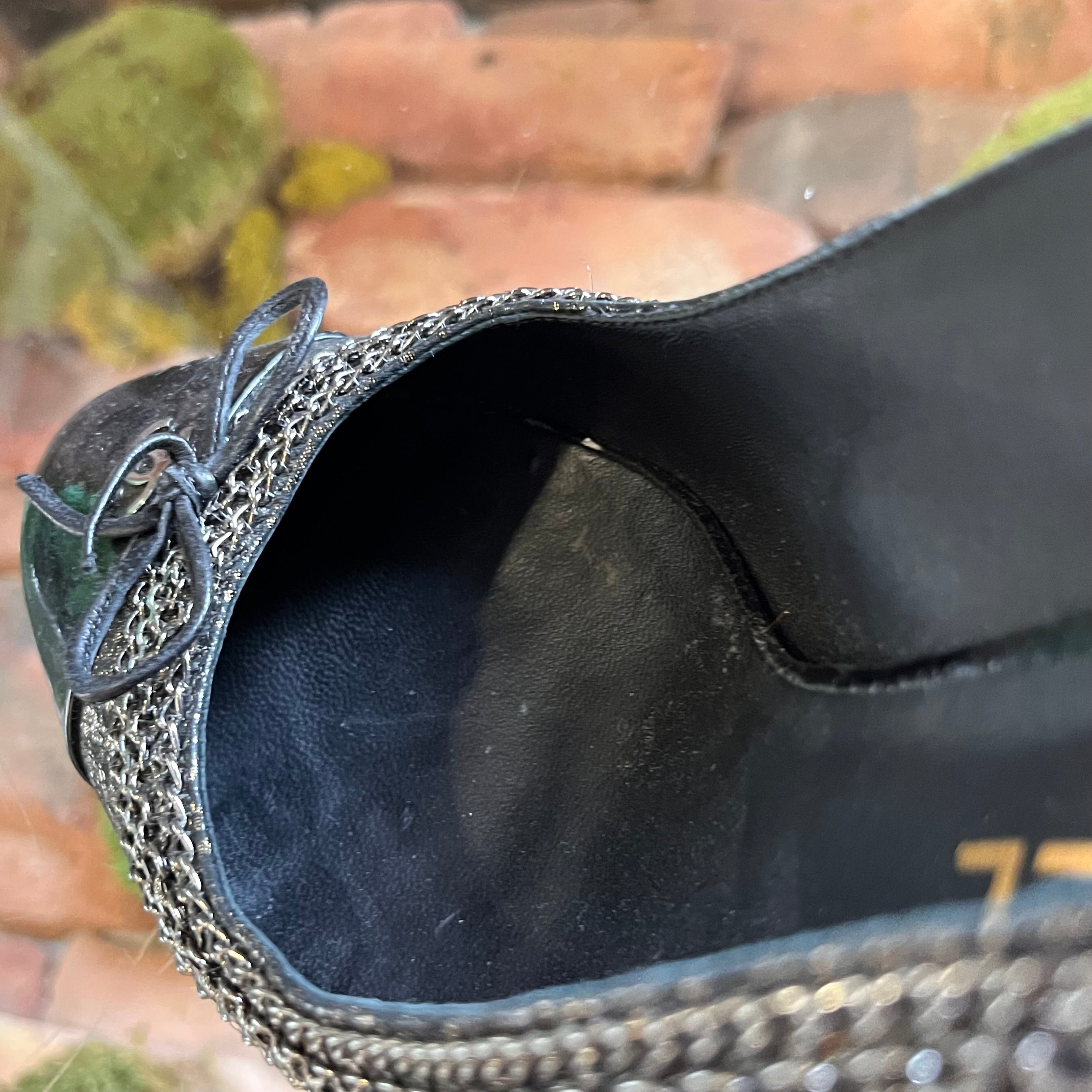 • Exterior: The soles are worn consistently with previous moderate use. The patent leather has developed cloudiness, scuffing, glazing wear, misshapenness and marks. They remain vibrant and in very good condition.