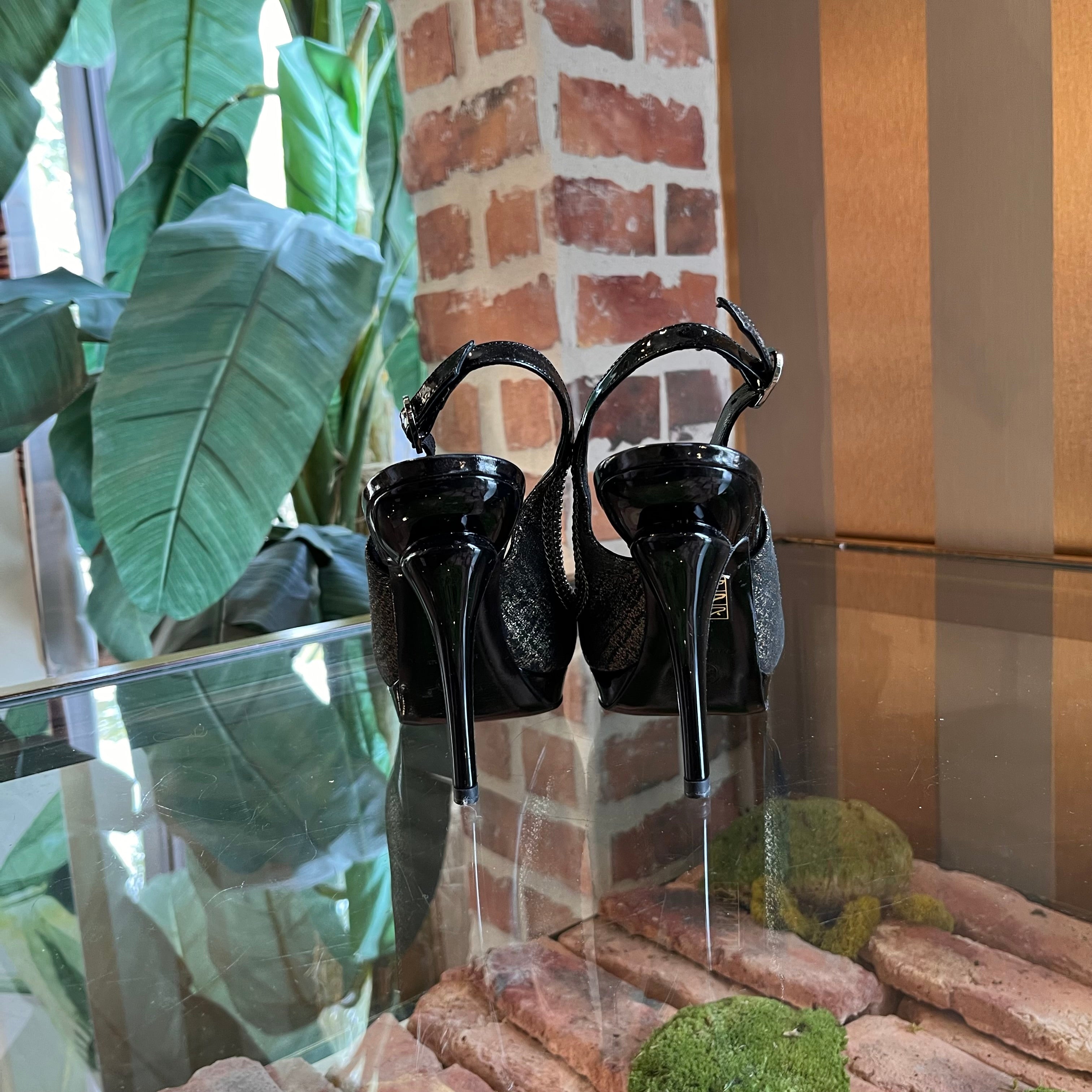 CHANEL Black Patent Leather Chain Cap-Toe Slingback Heels SZ37.5(7.5US)