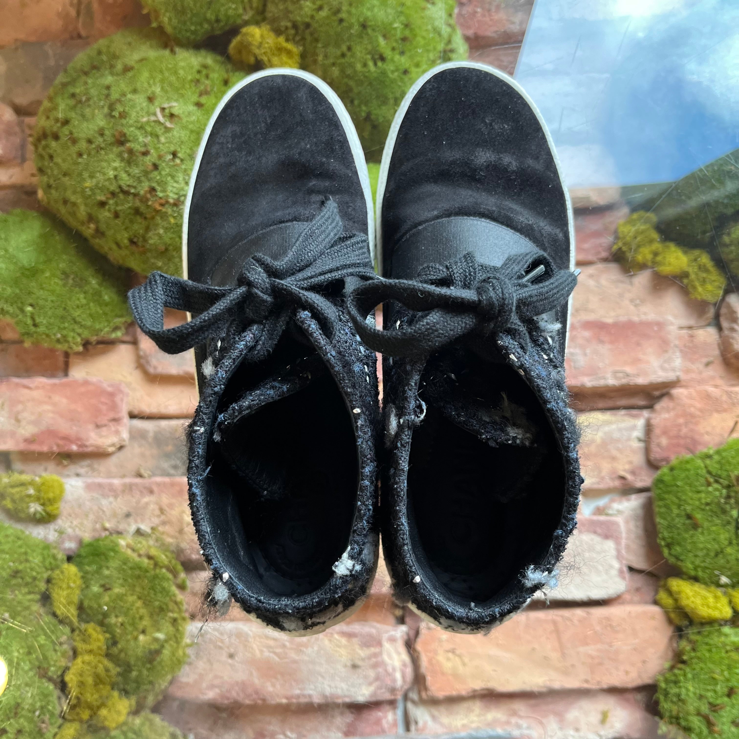 • Exterior: The soles are worn consistently with previous moderate use. The suede displays moderate to heavy rubbing. The midsoles displays gentle soiling with markings while the tweed has developed fraying and loose threads. They remain vibrant and in very good condition.