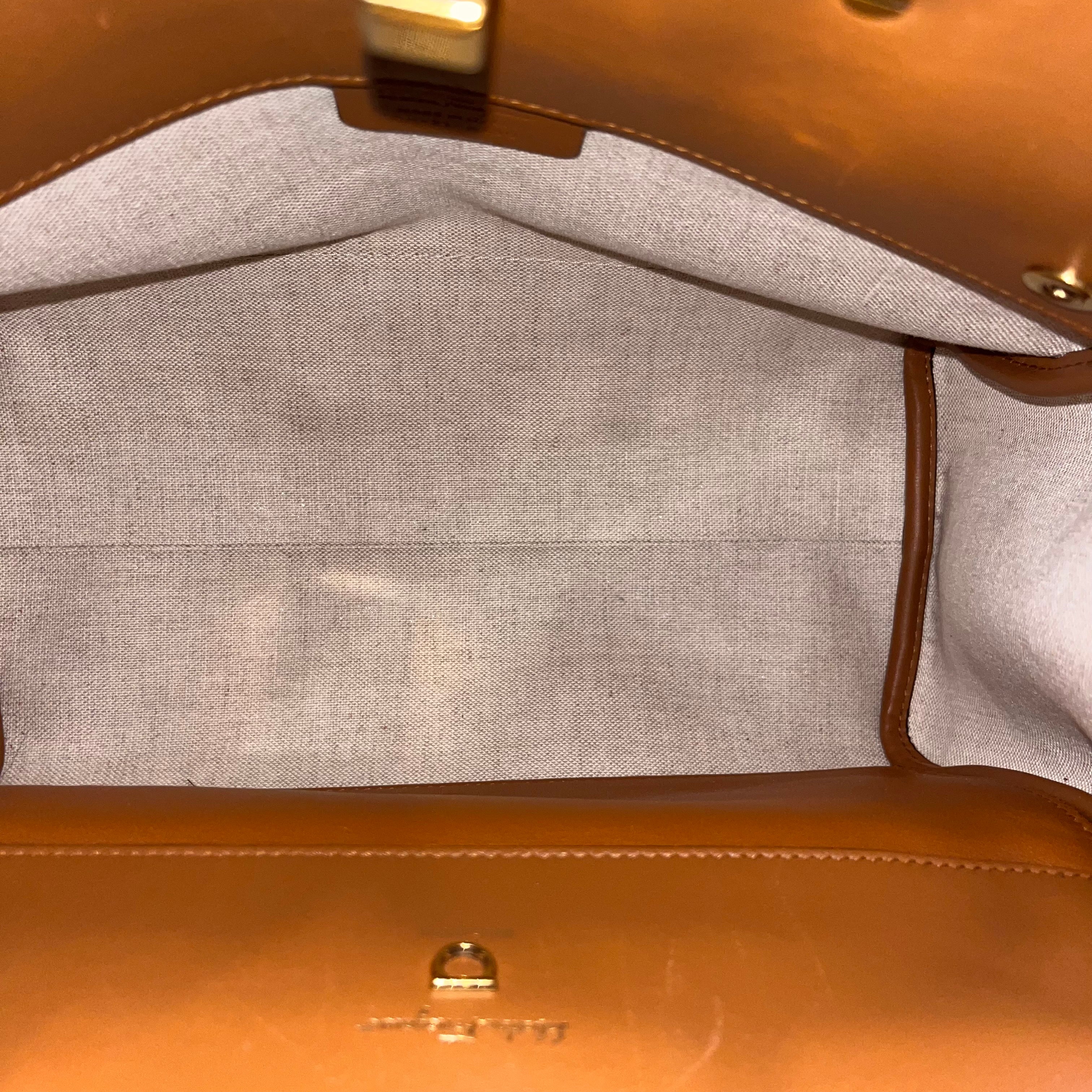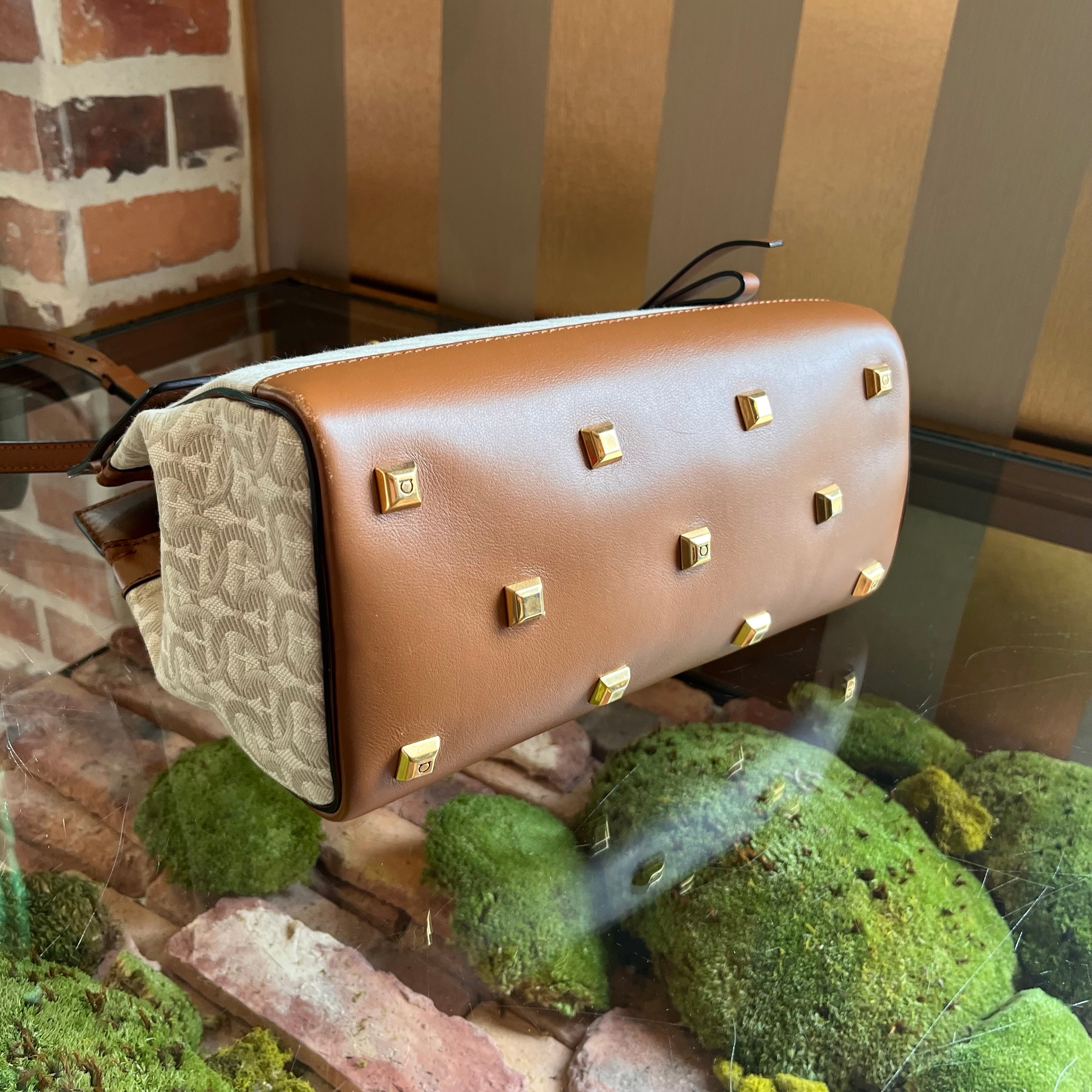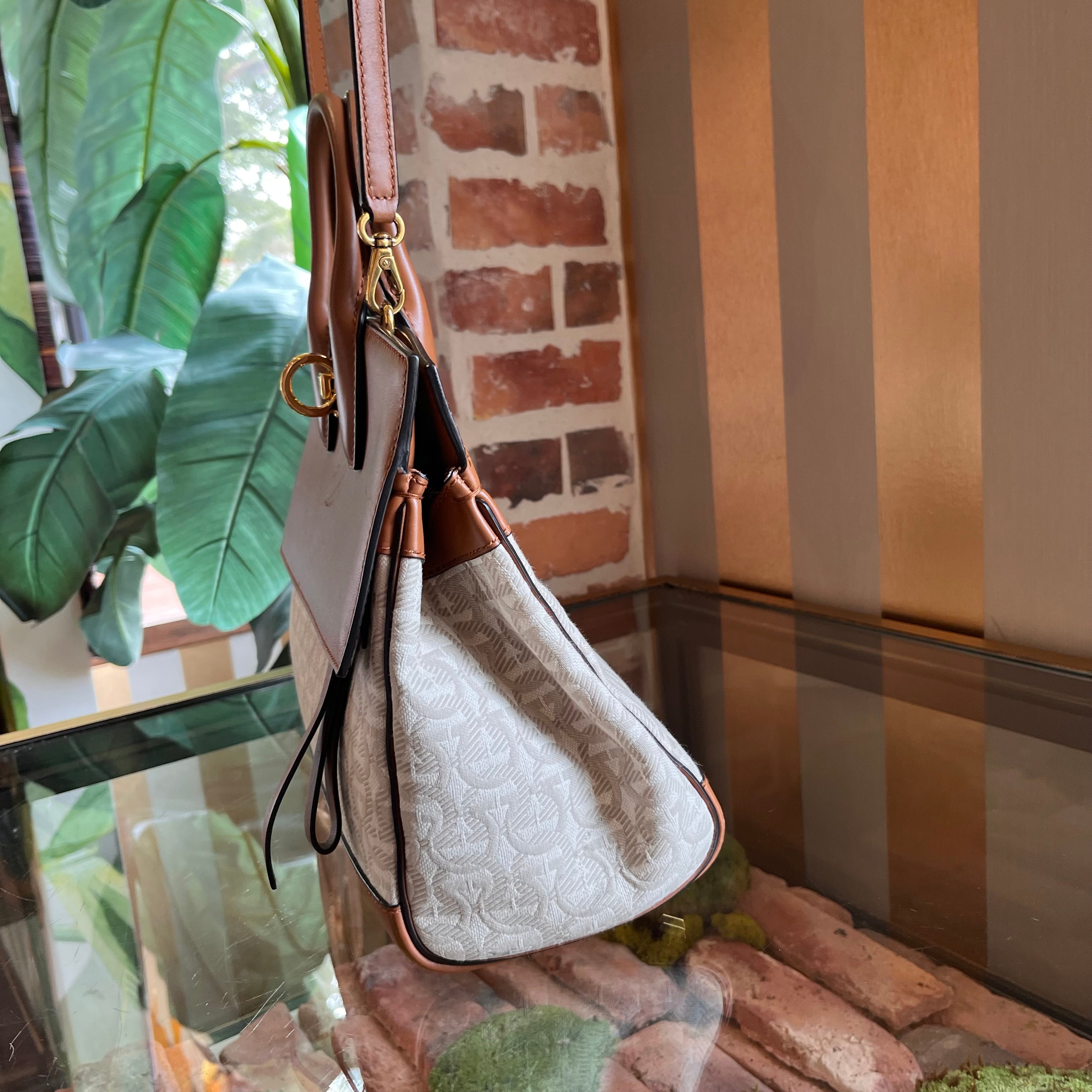 FERRAGAMO The Studio Medium Beige Brown Canvas Calfskin Gancini Tote Bag