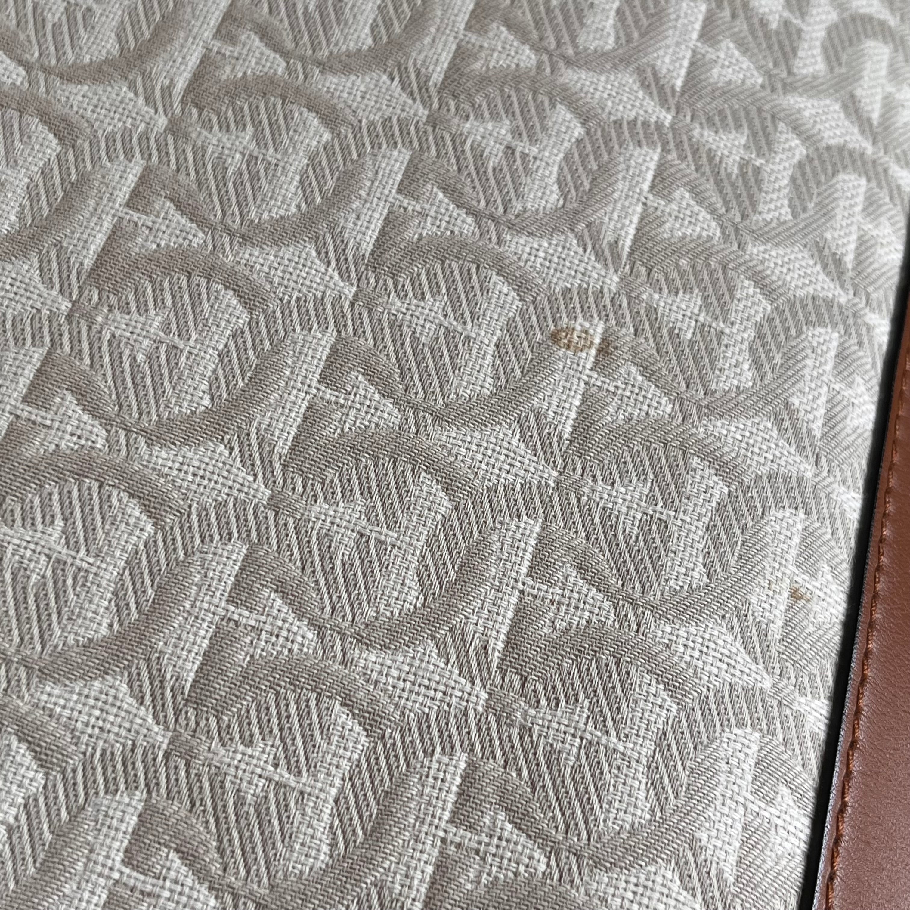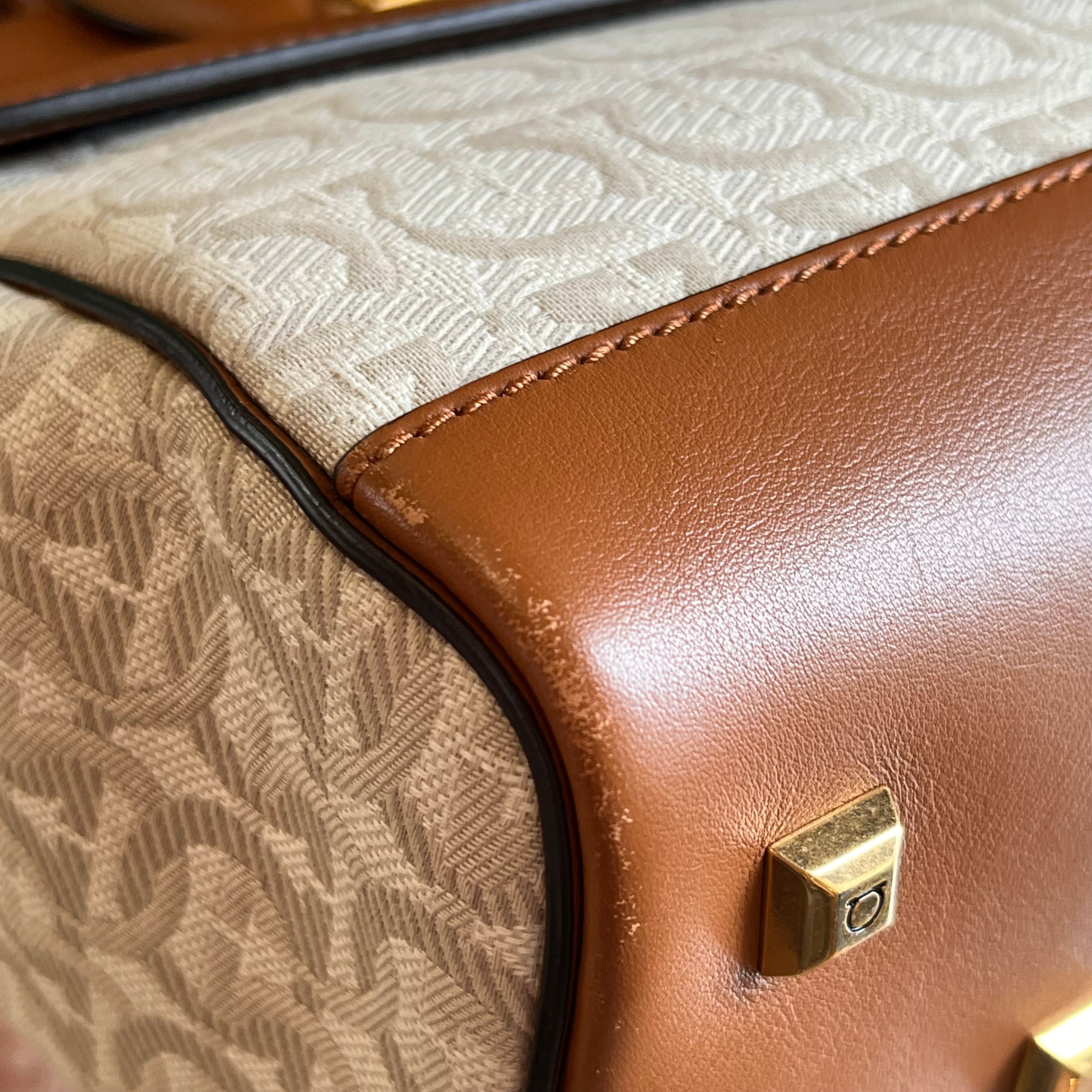- Exterior: The exterior is gorgeous and supple. The leather trim displays scratches, scuffing, rubbing, gentle darkening and indentations. The canvas has small gentle stains that could possibly be cleaned if desired after purchase although it is wearable without. Overall it's in very good condition.