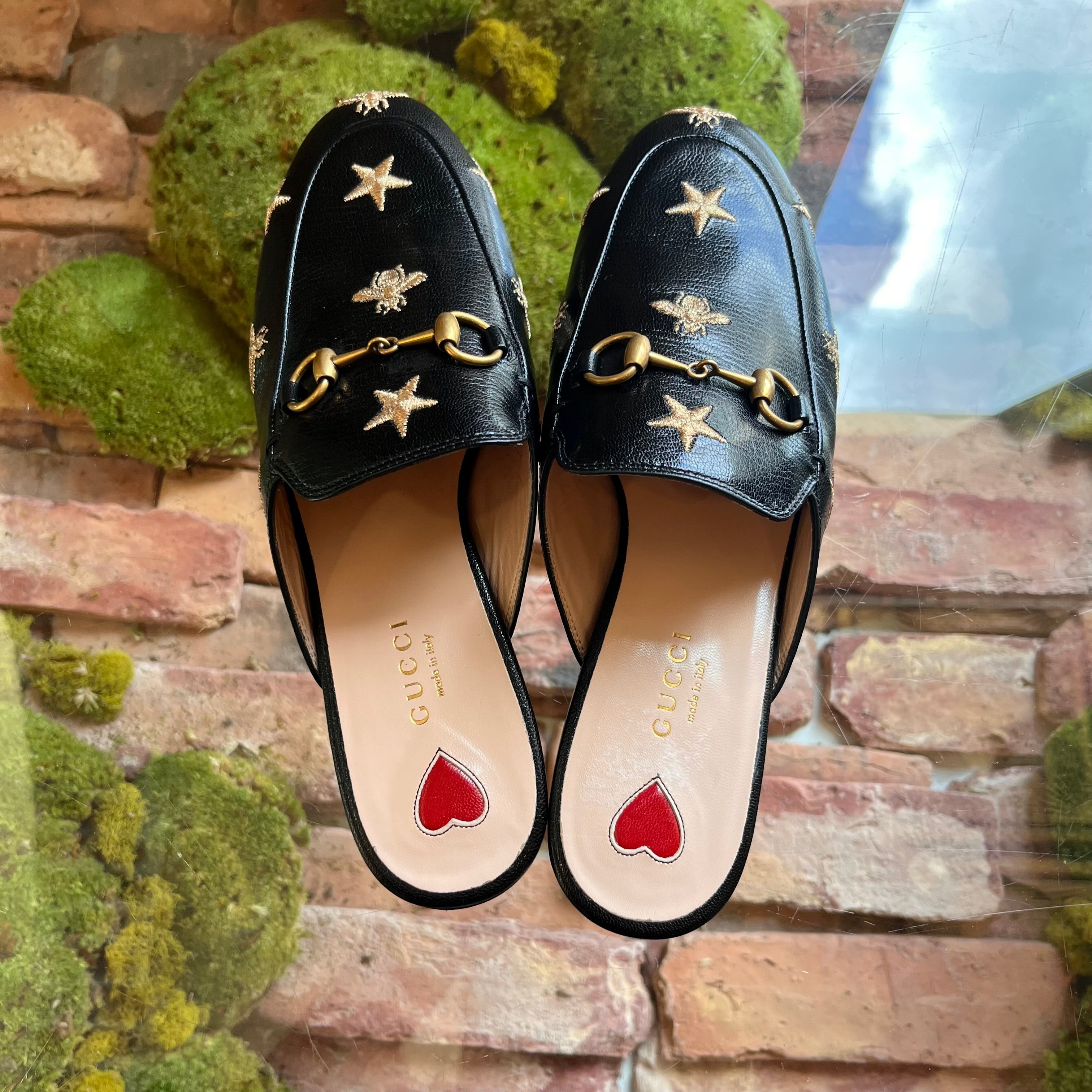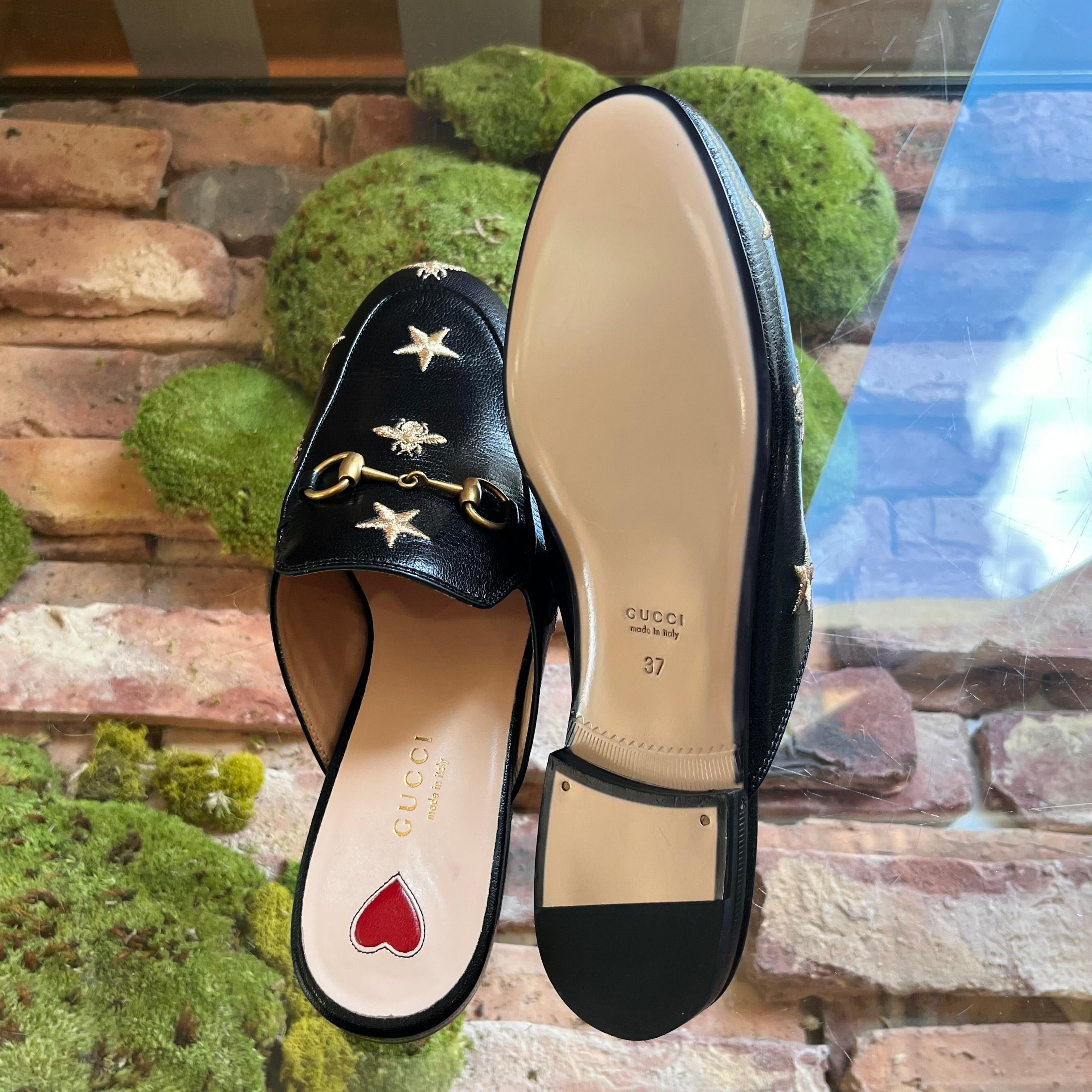 GUCCI Princetown Leather Bee Embroidered Mule Flats SZ37(7US)