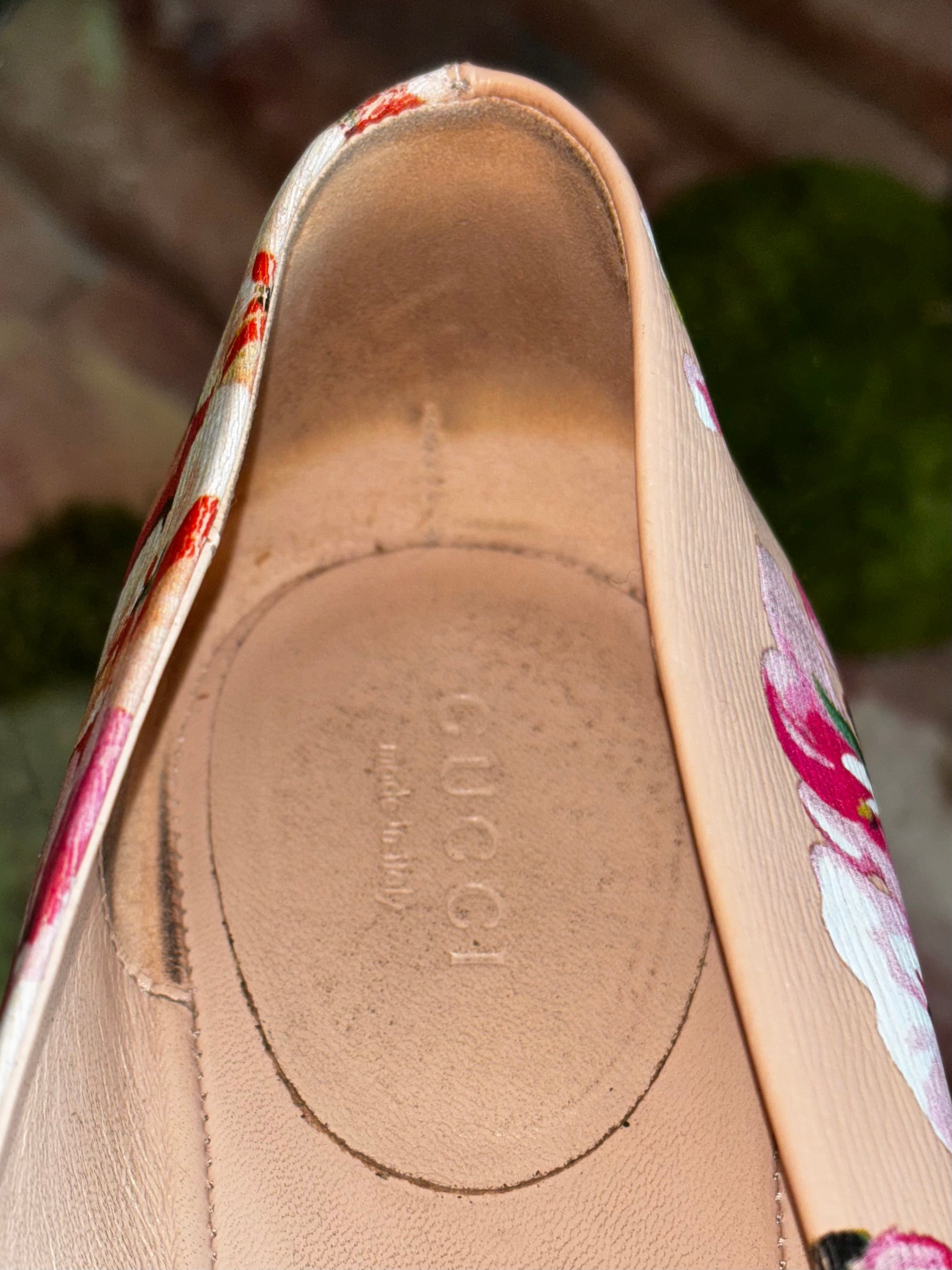 Elevate your elegance with the GUCCI Blooms Mary Jane Ballet Flats, featuring a delicate floral print that adds a refined touch to classic ballet styling. Crafted for comfort and grace, these flats blend timeless design with a sophisticated pattern, perfect for enhancing both casual and dressy ensembles. Overall in Very Good Condition. B+