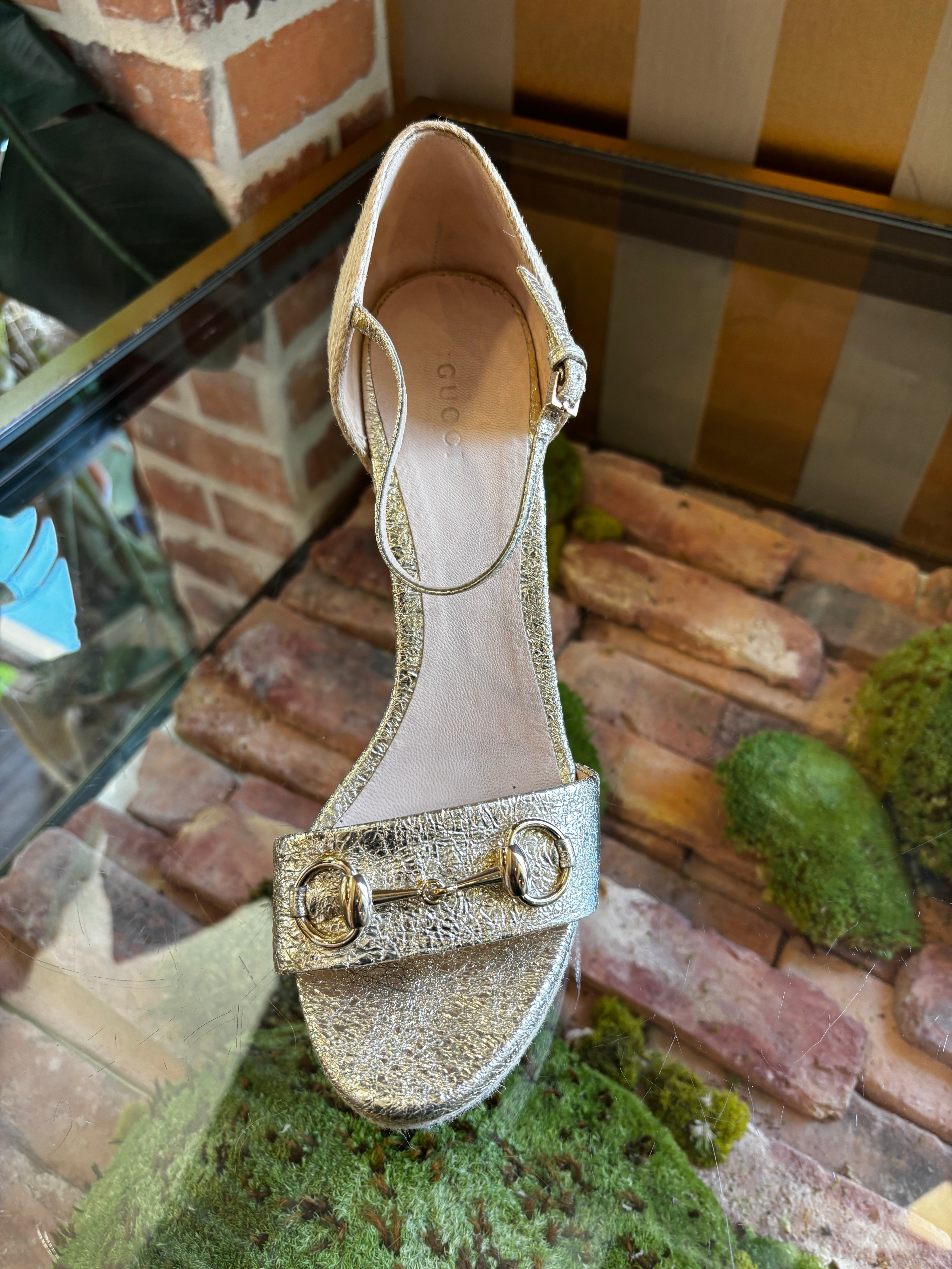 GUCCI Gold Crackled Leather Carolina Espadrilles Wedges