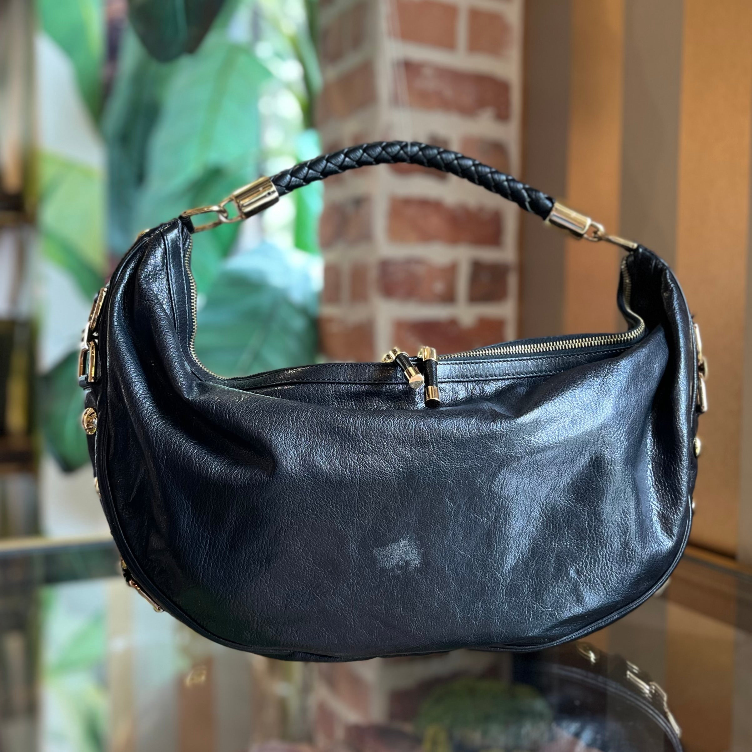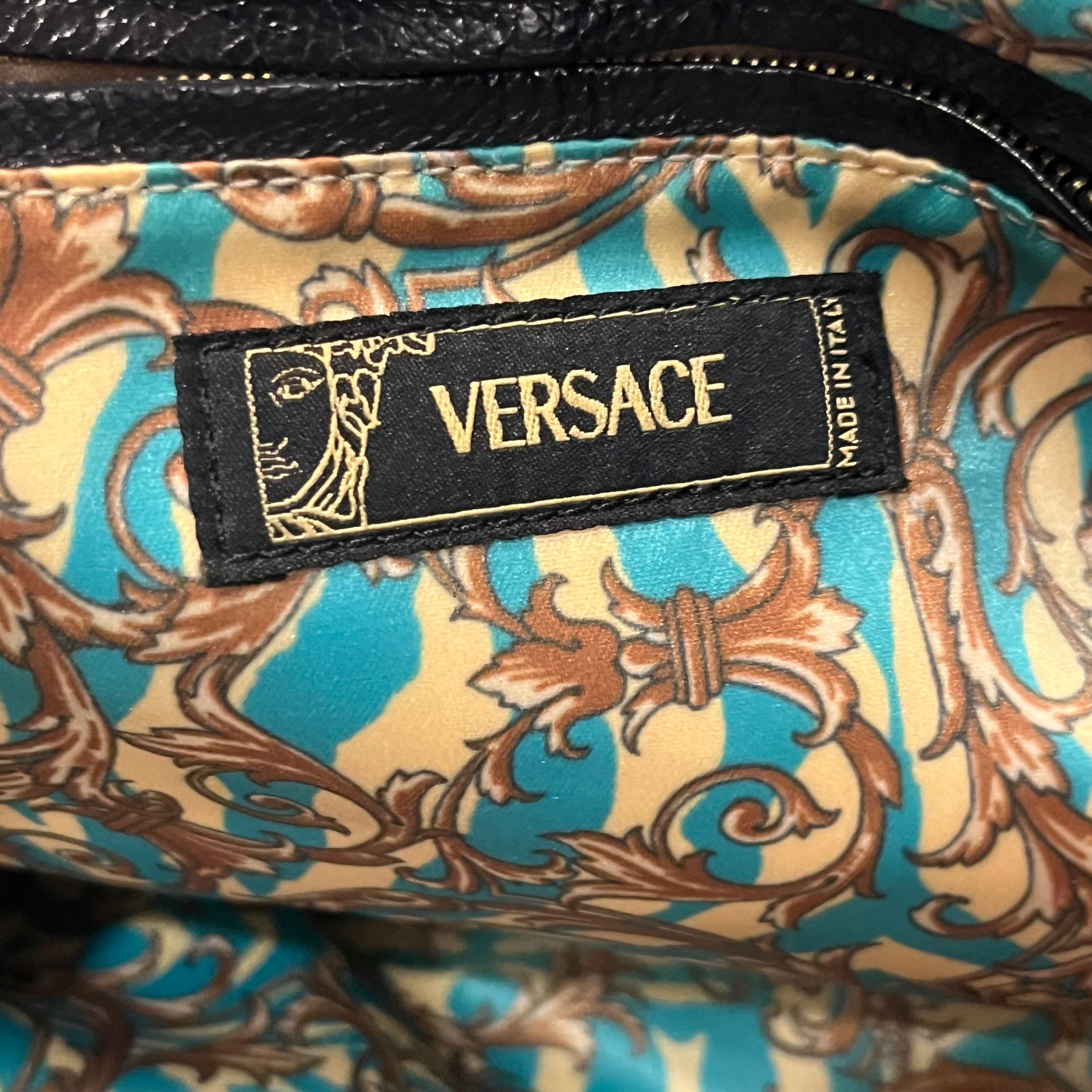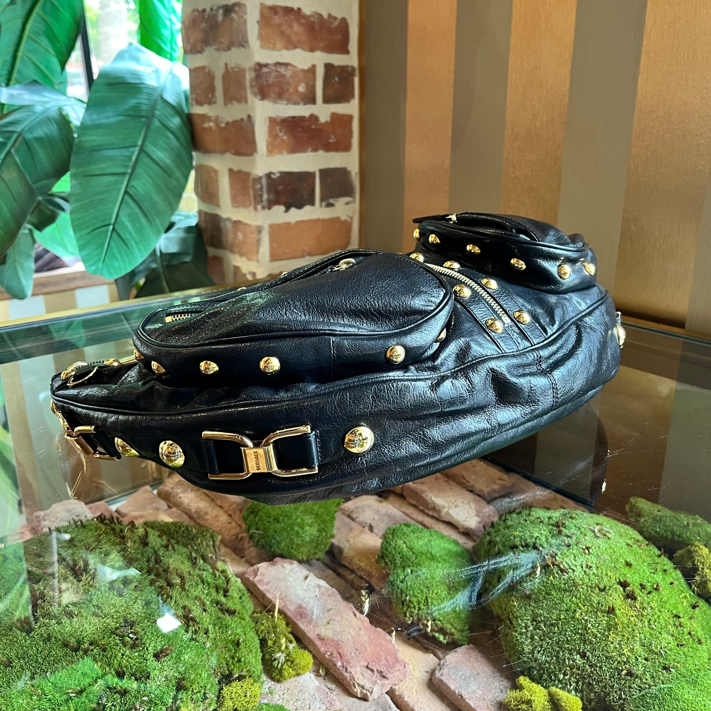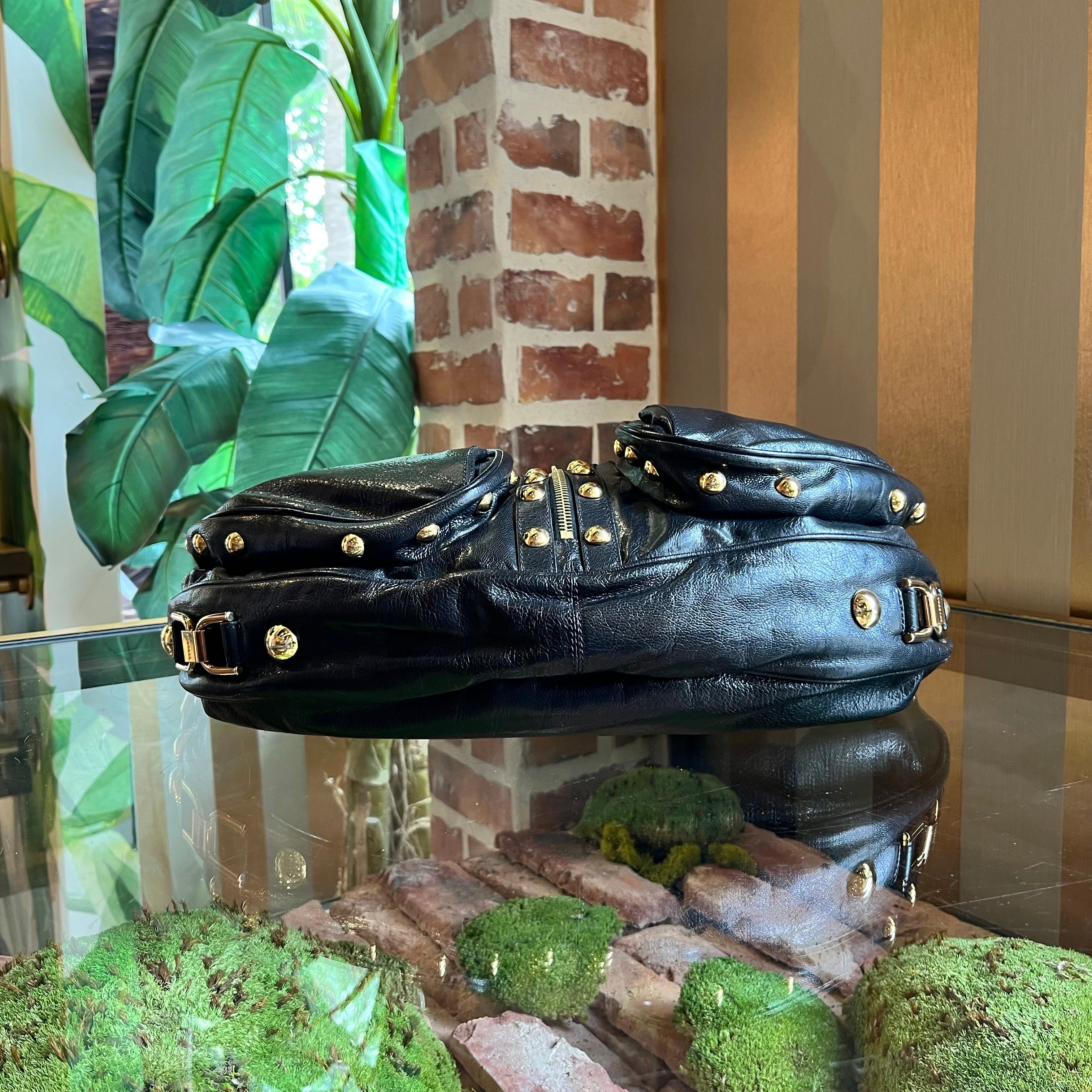 VERSACE Repeat Black Patent Leather Studded Shoulder Bag