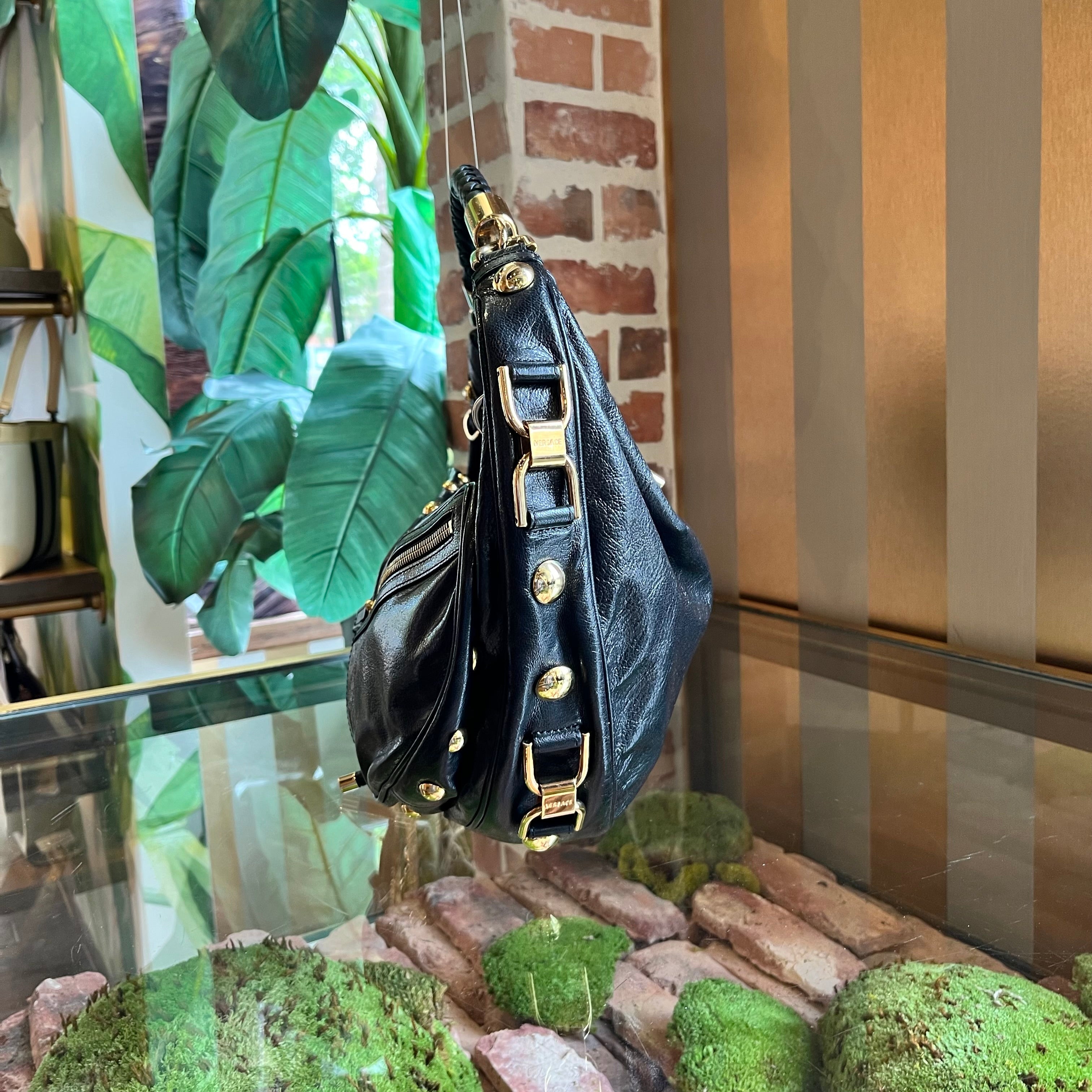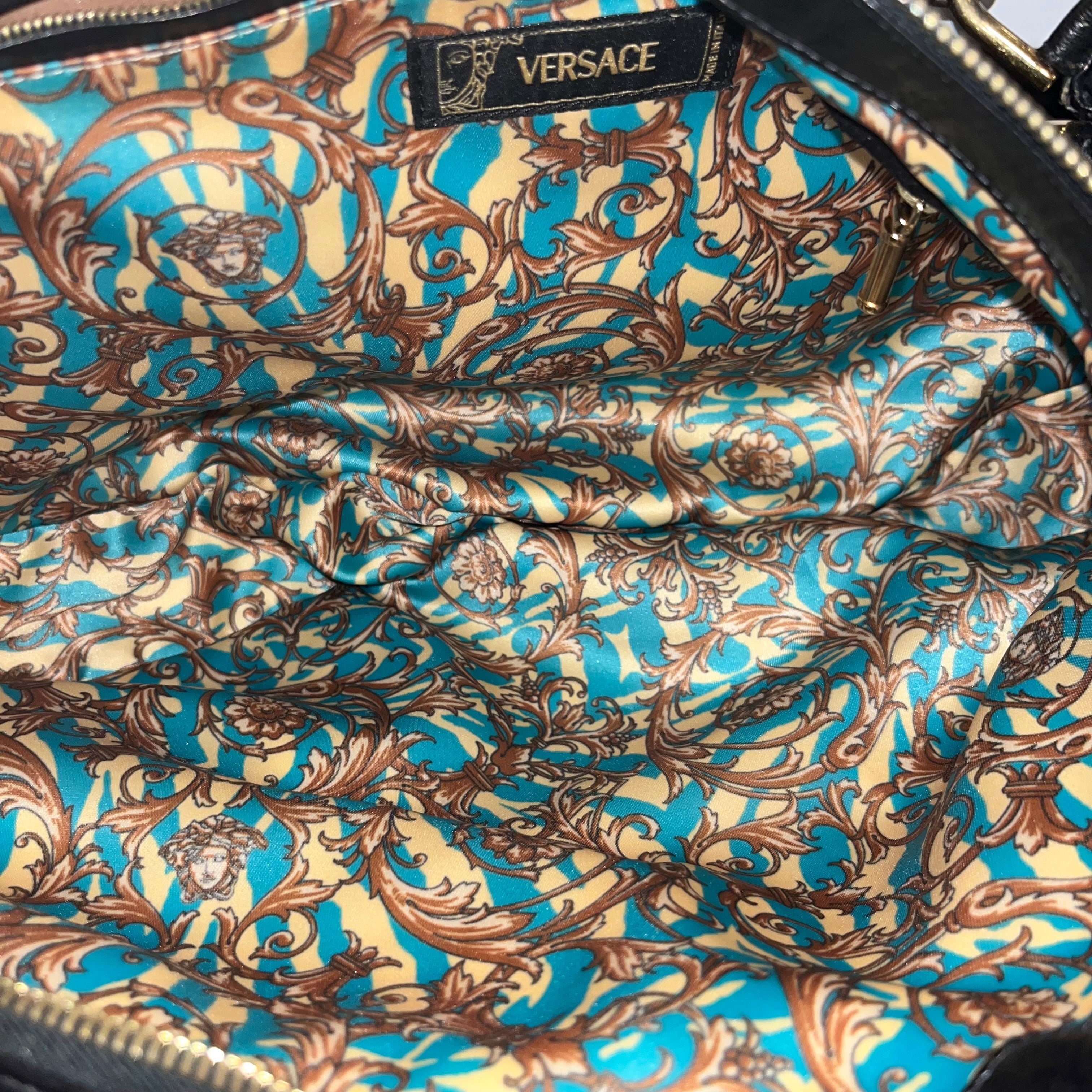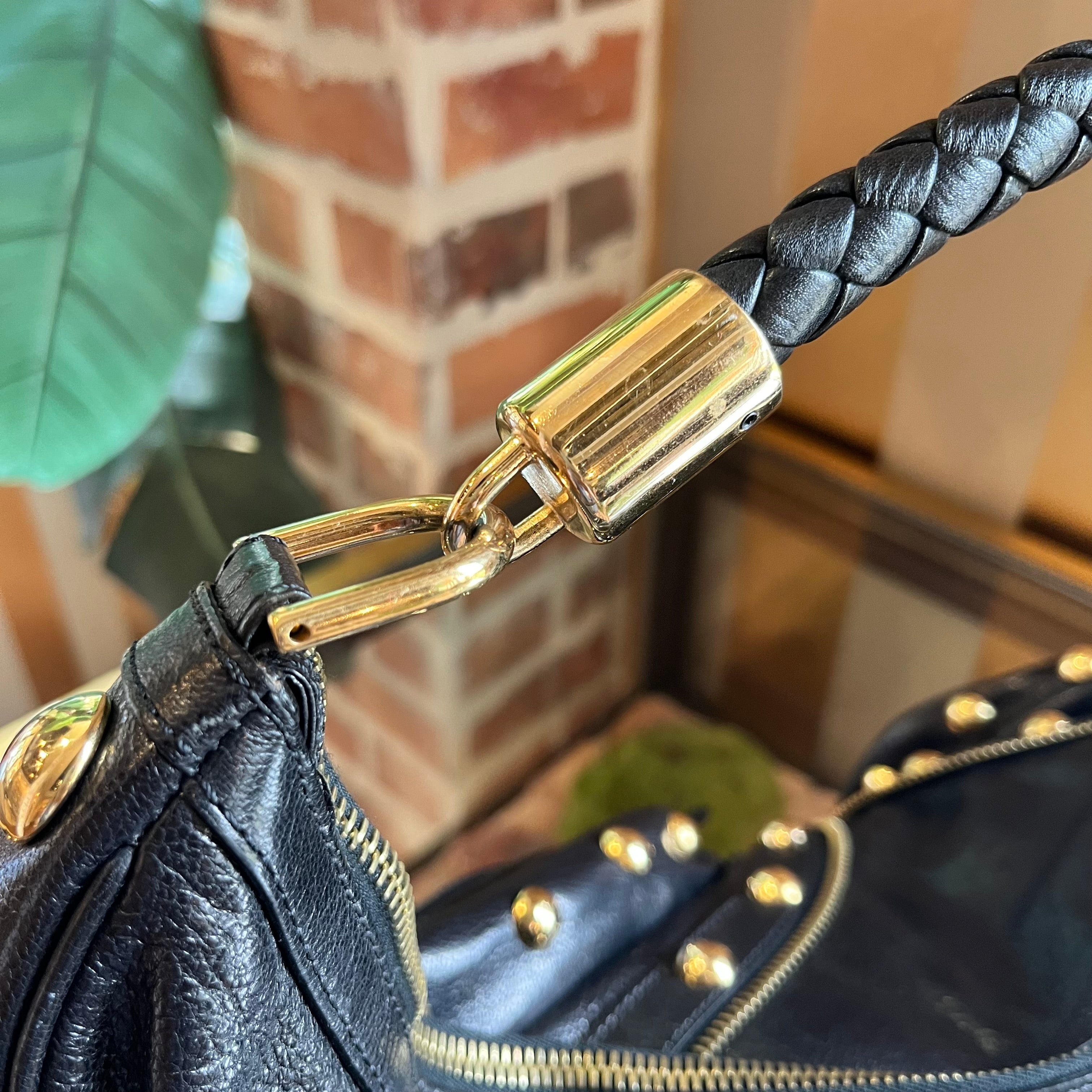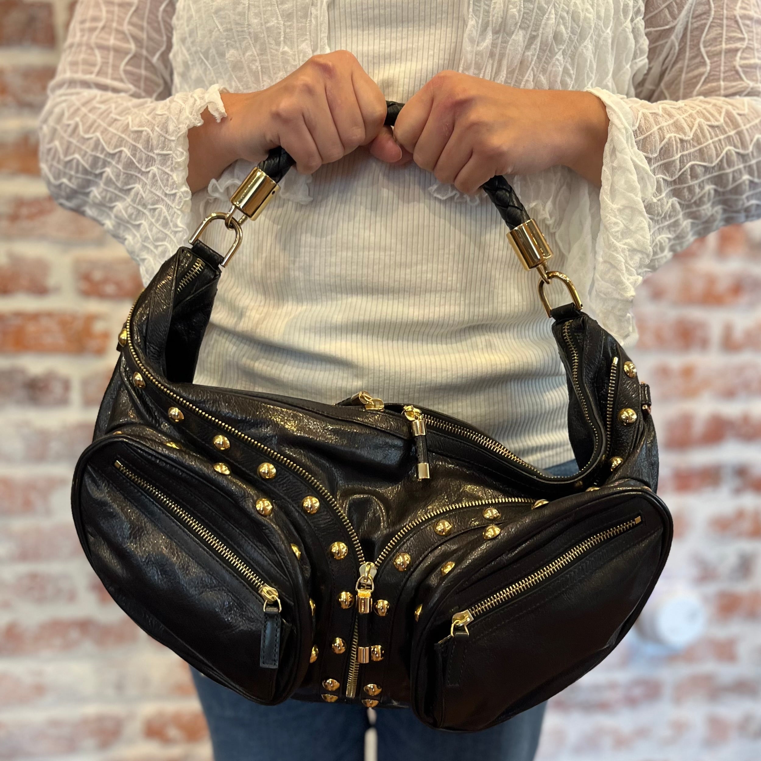 VERSACE Repeat Black Patent Leather Studded Shoulder Bag