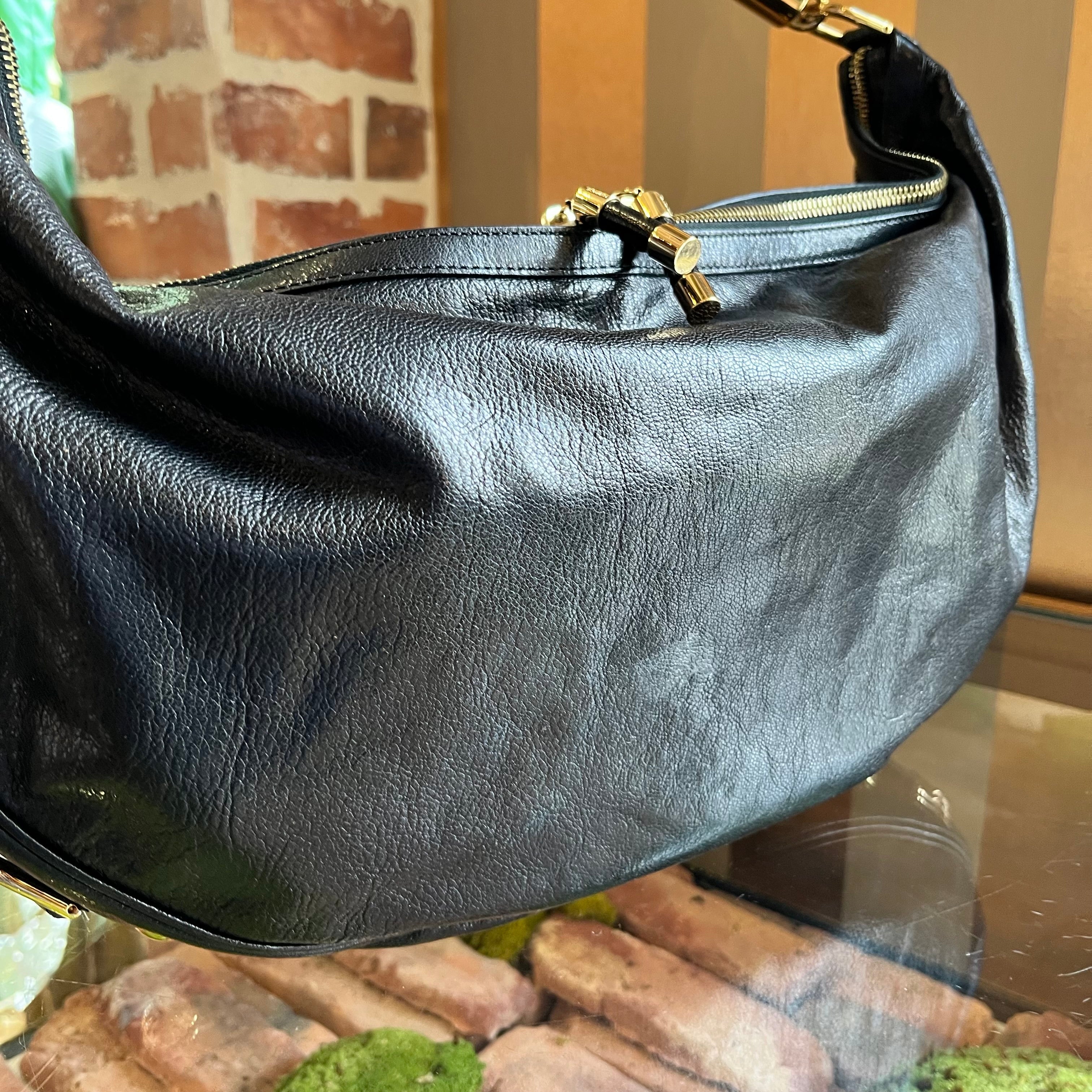 • Exterior: The leather is gorgeous and shiny. On the back of the bag there is a scuff/rubbed area appearing as a white mark in the photos. Overall it's in very good condition.