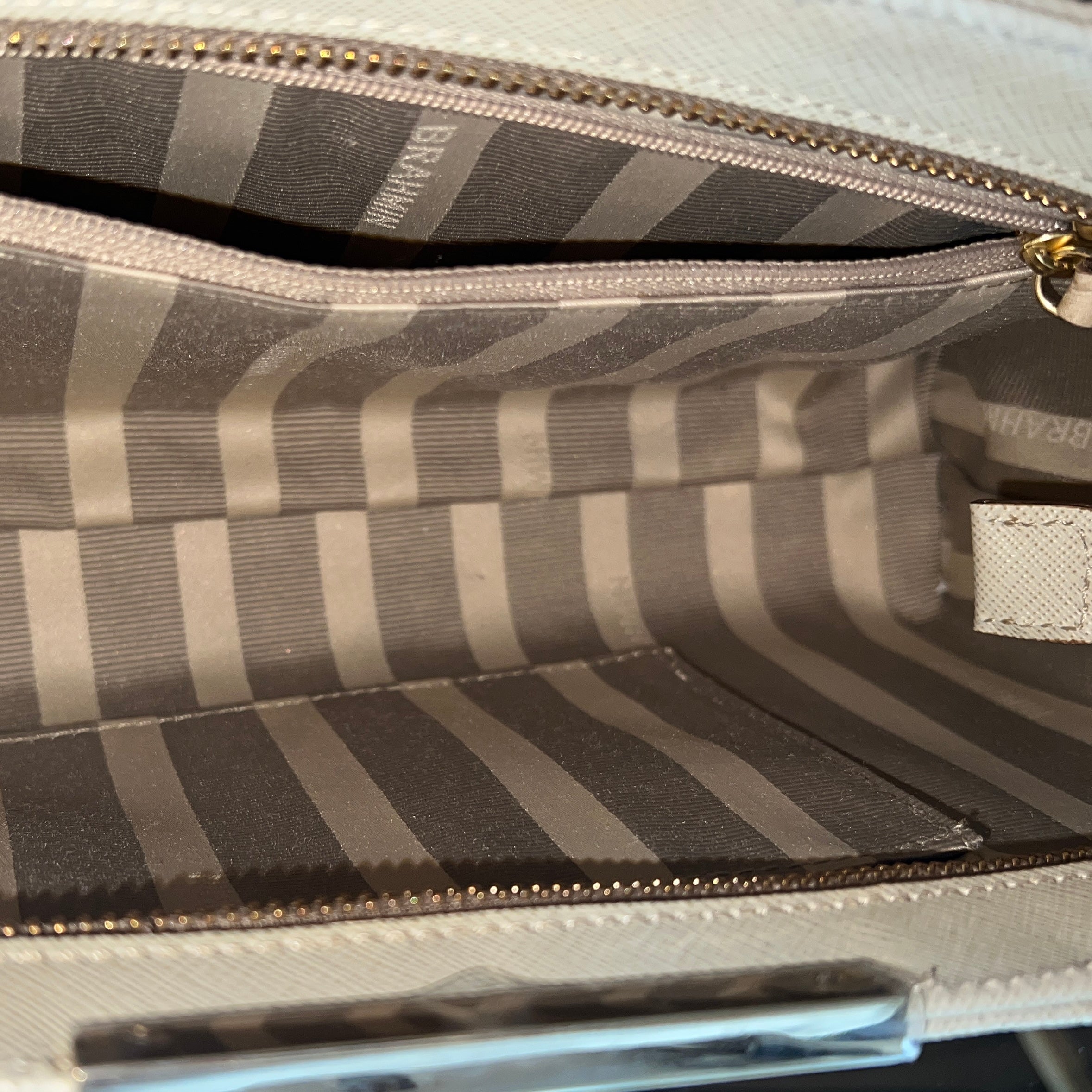 - Hardware: Gold-tone accents with Brahmin logo plate