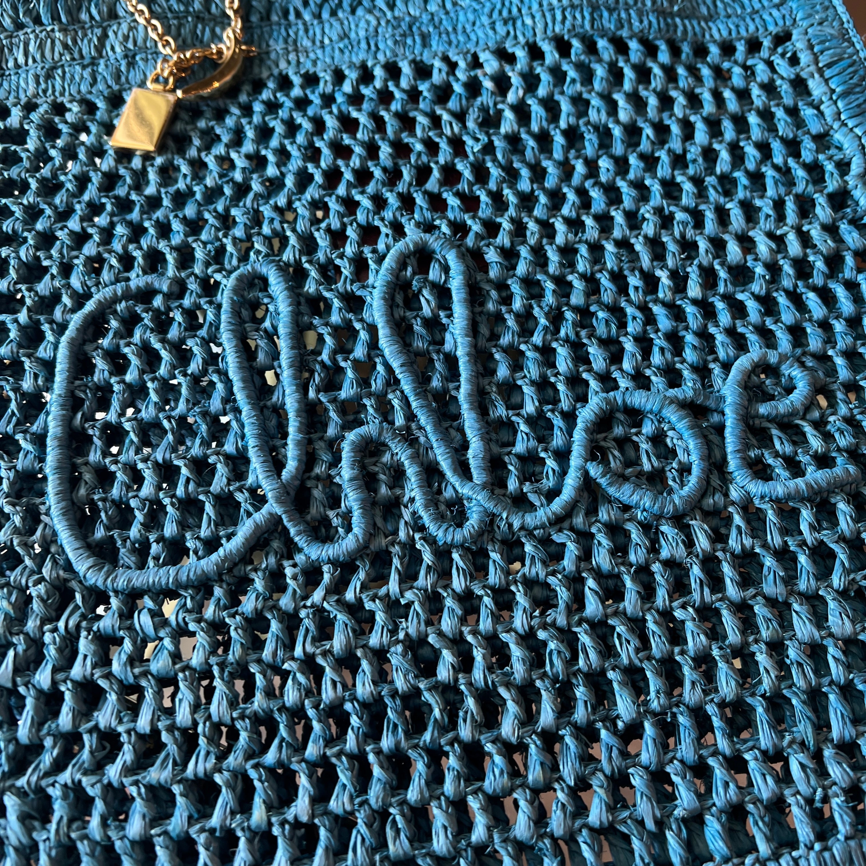 - Chloé's "Summer" tote bag, crafted from raffia-like crochet fabric, features a playful banana chain charm and tonal logo lettering