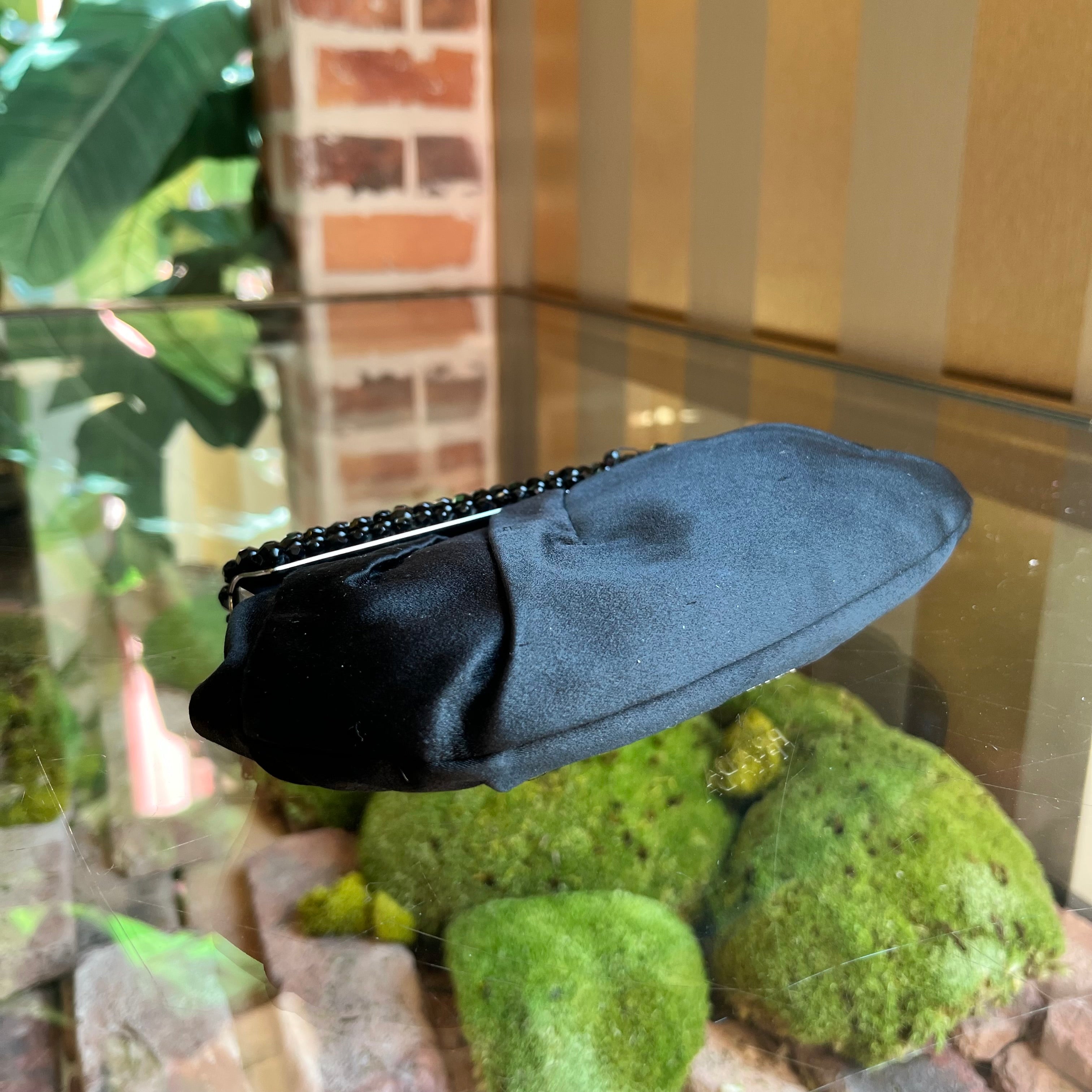 - Exterior: The satin remains vibrant and beautiful, with light rubbing and a couple of gentle runs that add subtle character. The beaded frame closure shows loose threads, beading, and a few missing beads (see photos), yet it remains fully functional as is—ready to bring its timeless charm to any occasion.