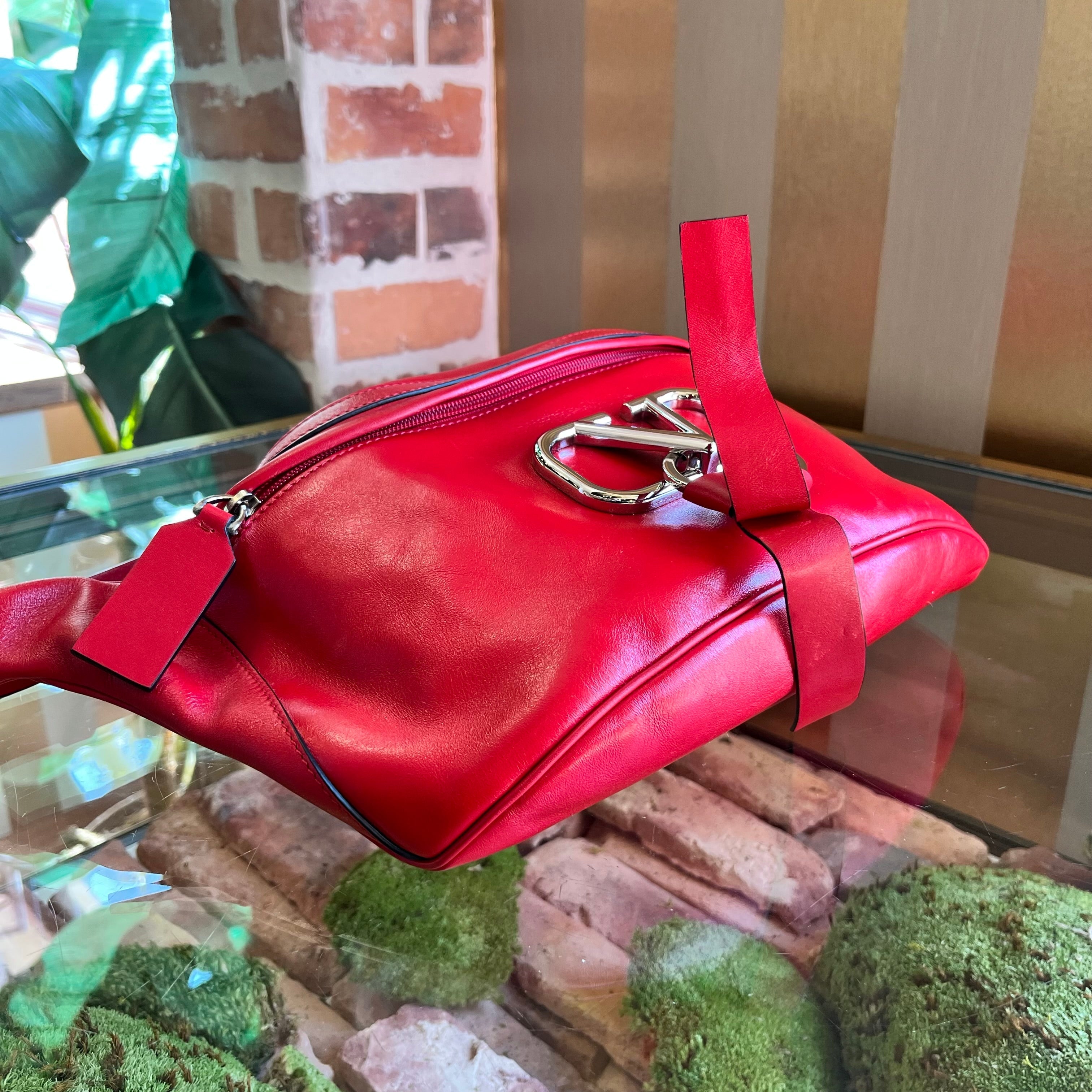 A bold fusion of streetwise edge and Italian glamour, this belt bag features Valentino's signature VRing hardware against glossy leather for head-turning luminosity. The oversized silhouette and adjustable strap offer hands-free versatility, while the high-shine finish ensures it transitions effortlessly from day to night—proof that practicality can pack a couture punch. B+ Very Good Condition