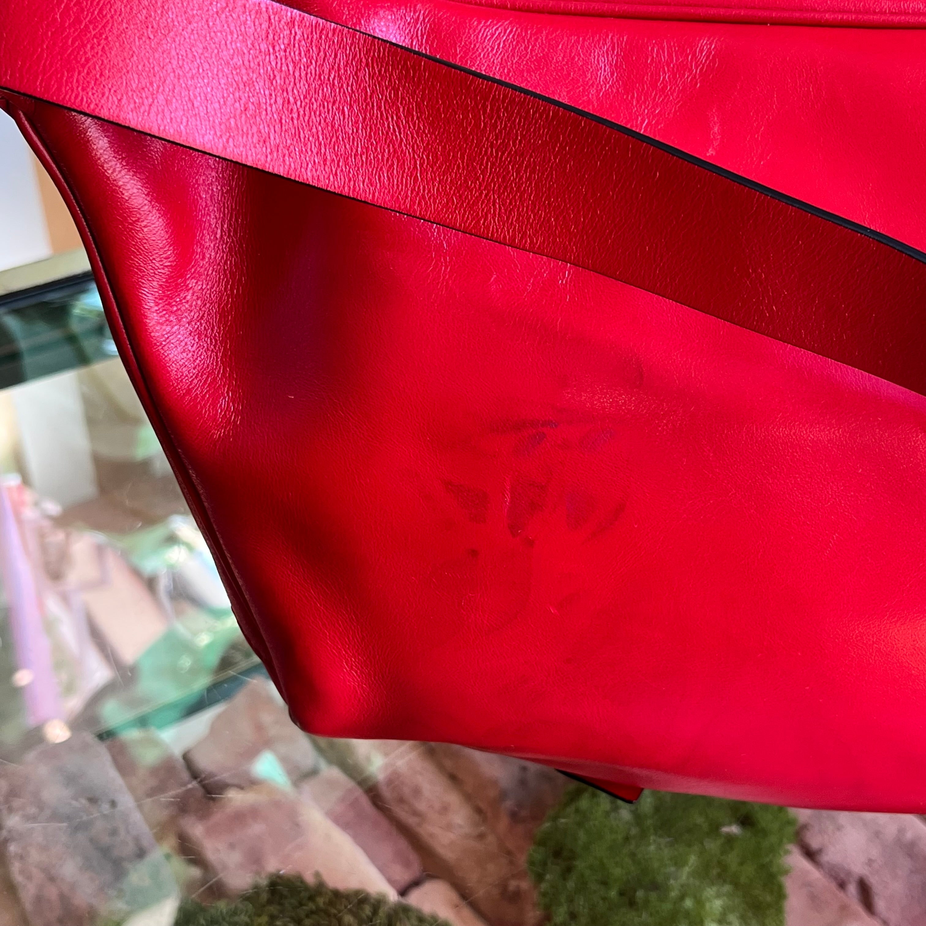 • Exterior: The leather is gorgeous and supple with discoloration, creasing, misshapenness and scratches.