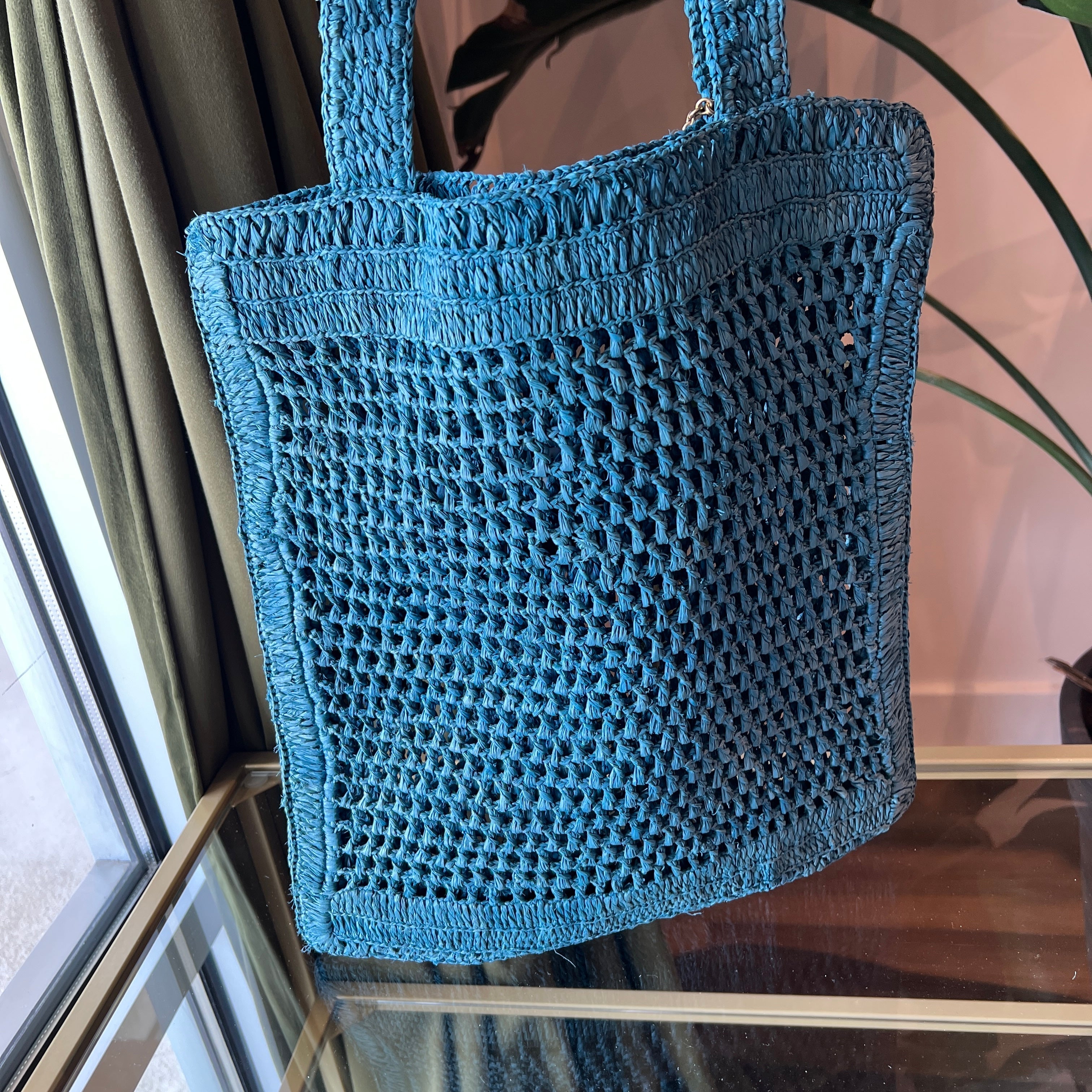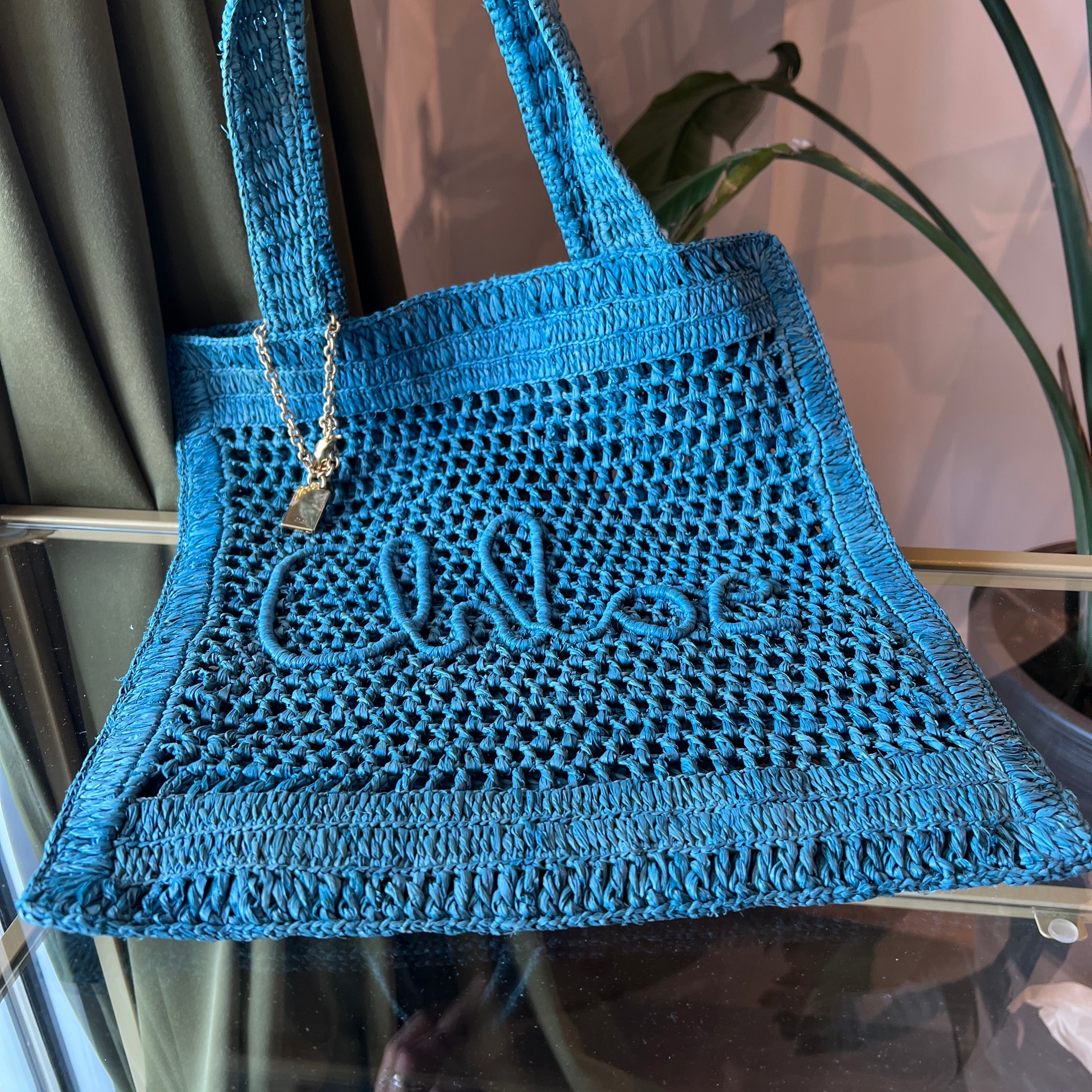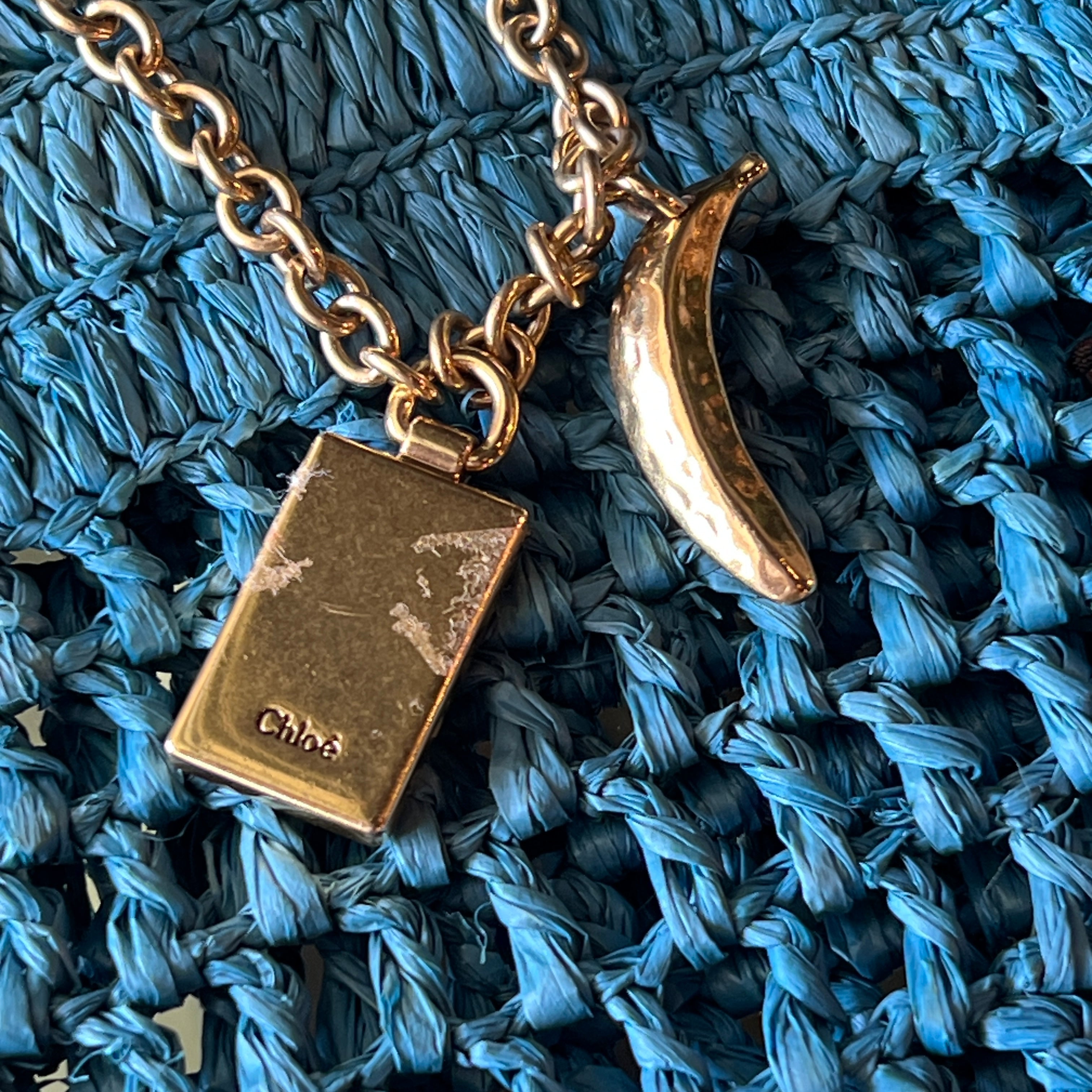 - Chloé's "Summer" tote bag, crafted from raffia-like crochet fabric, features a playful banana chain charm and tonal logo lettering