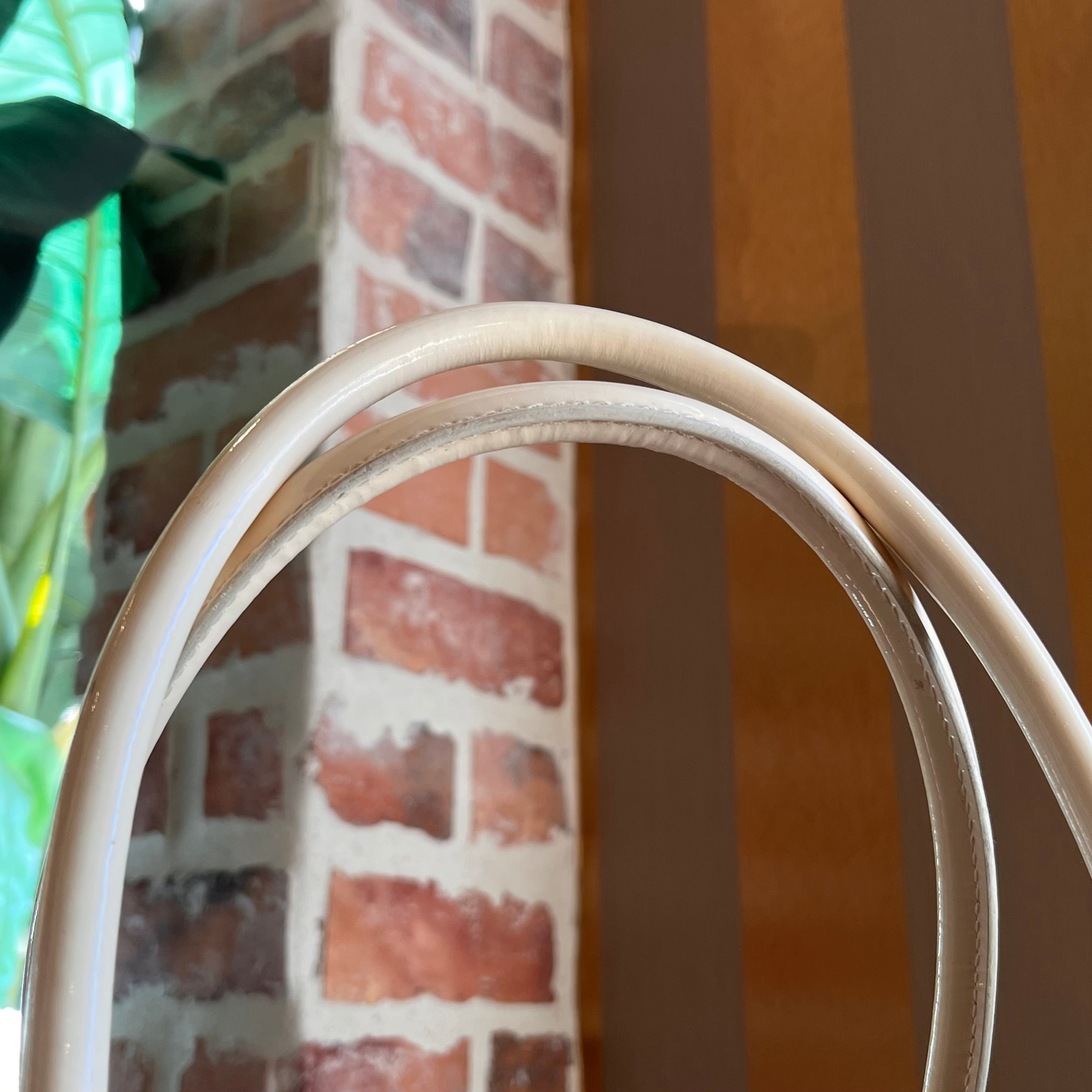 - Exterior: The patent leather is bright and shiny. It has developed transfer marks, scratches and scuffing. Overall it's in good condition. It remains sturdy and structured.