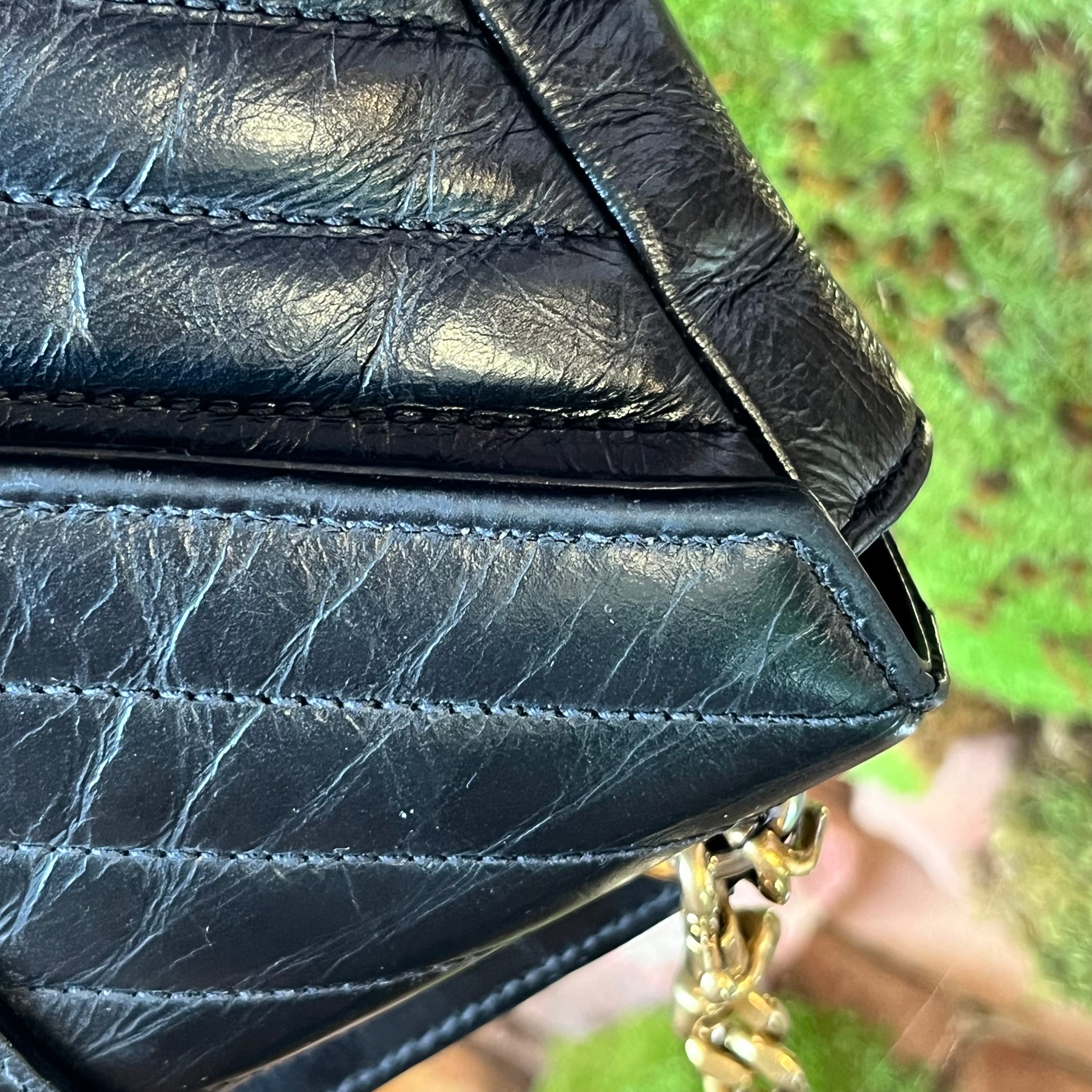 Elevate your style with the SAINT LAURENT College Mini Shoulder Bag, crafted from luxurious shiny crackled leather. Its compact silhouette blends elegance and modern edge, perfect for carrying essentials with a refined touch. The shoulder strap offers comfortable wear, while the distinctive texture adds a unique statement to any outfit. A timeless accessory designed to enhance your sophisticated look. B+ Very Good Condition