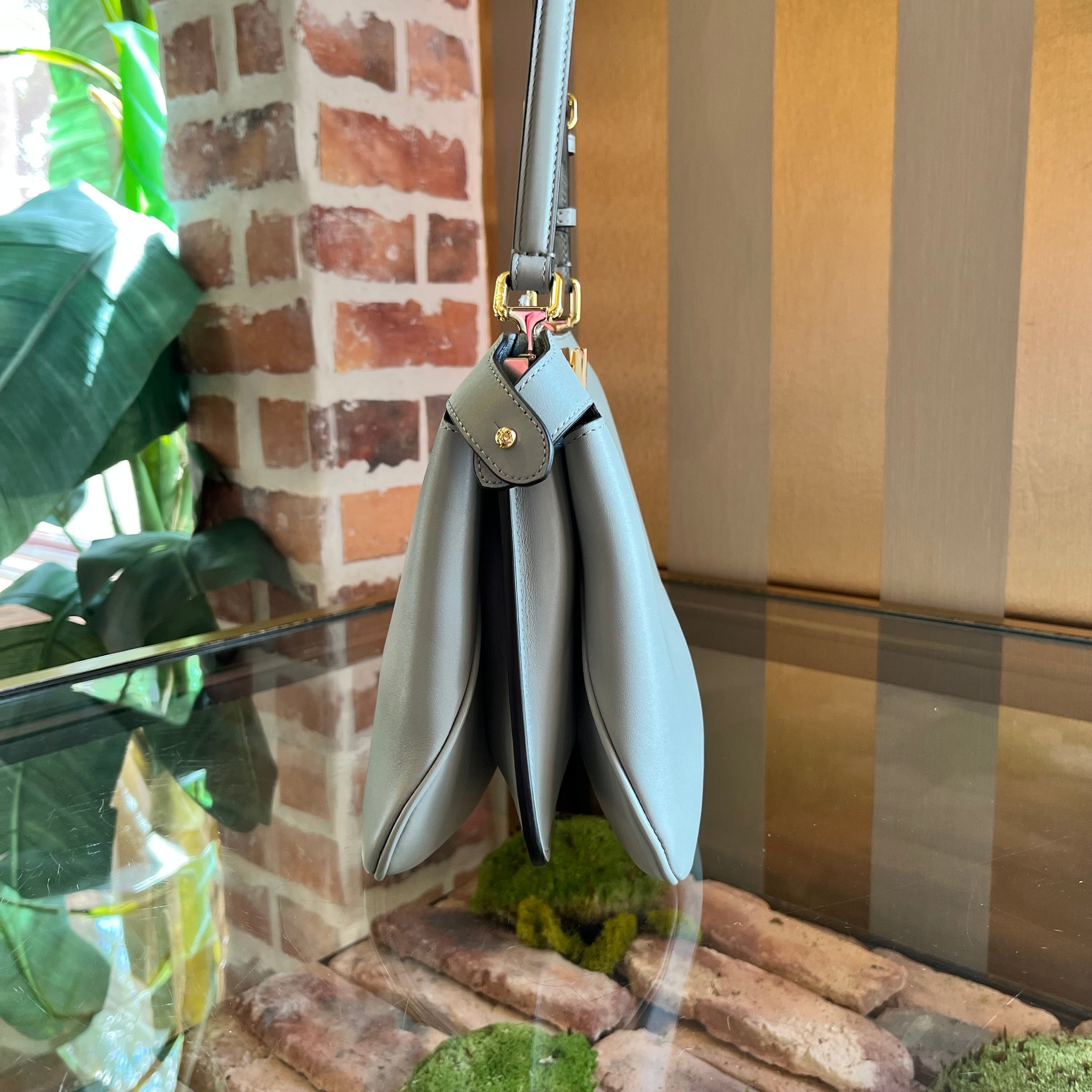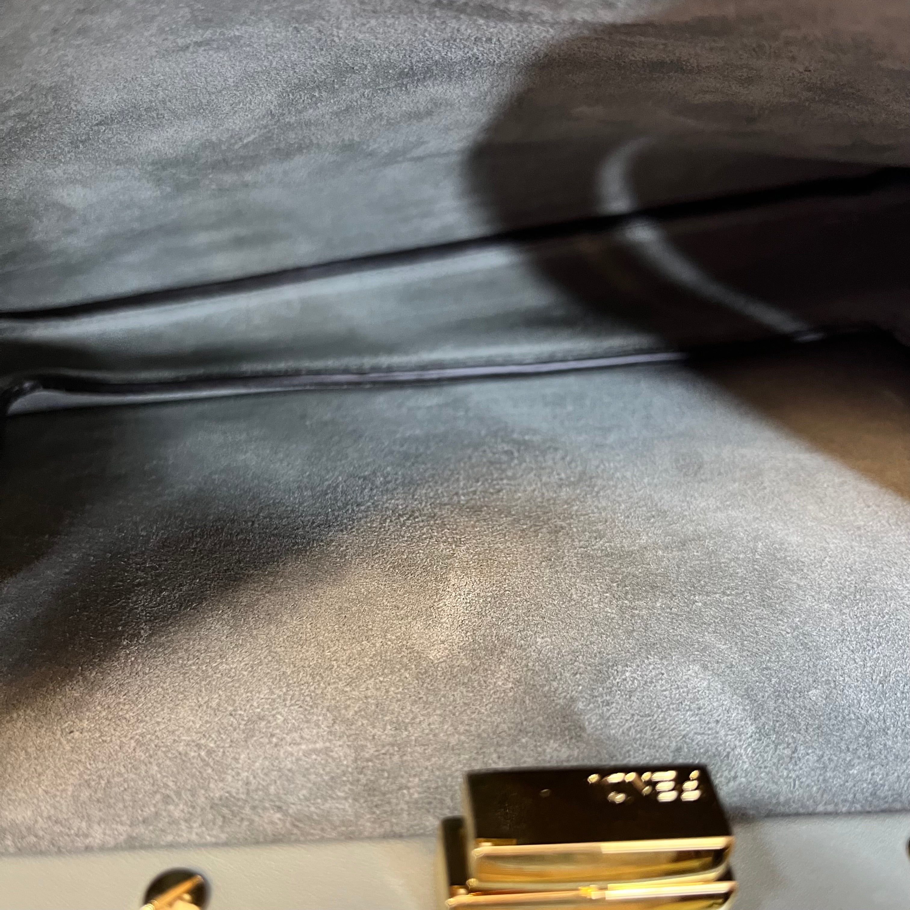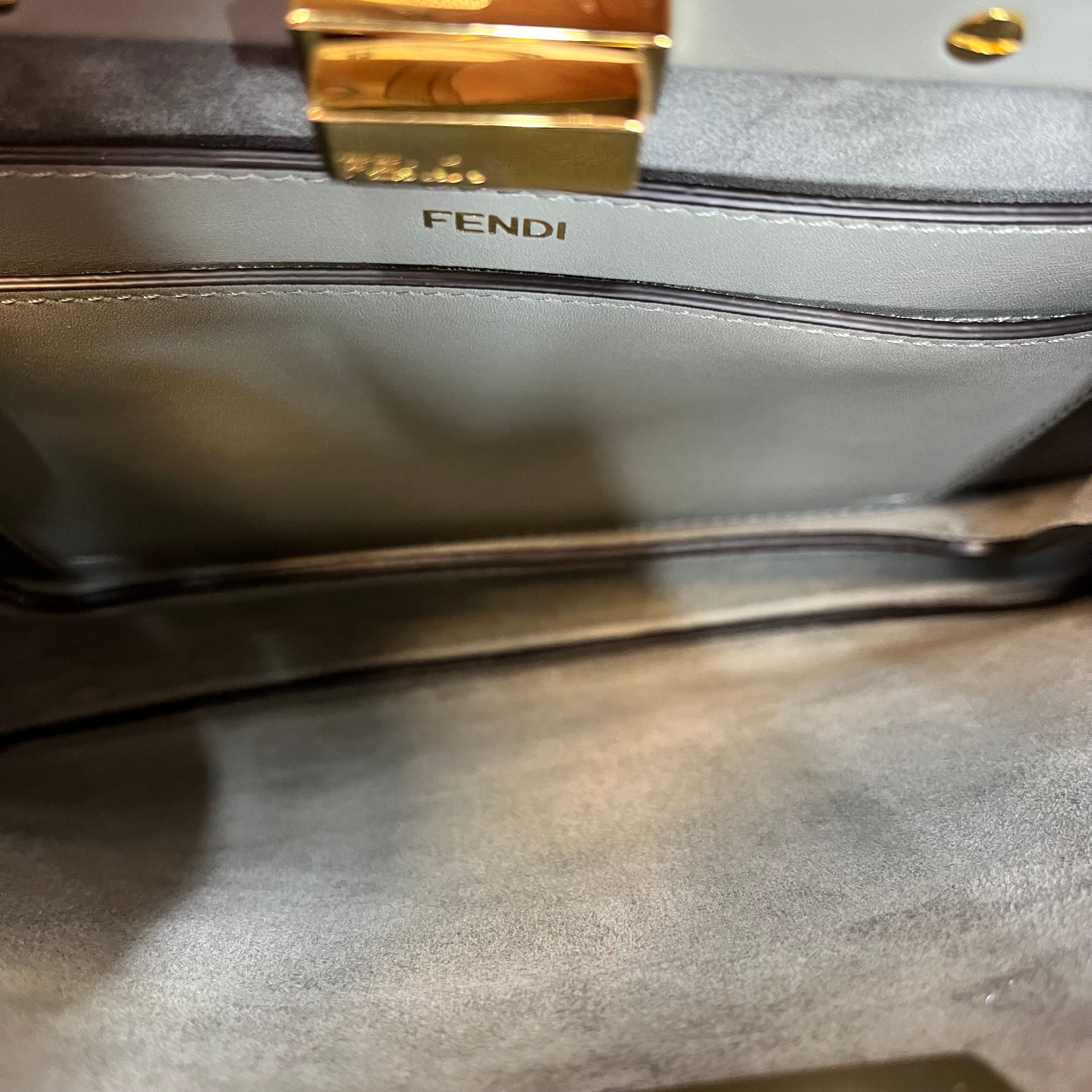 This Fendi Peekaboo Small Soft Tote is crafted from supple calfskin leather, featuring a structured silhouette with a top handle and a detachable shoulder strap for versatile carrying options. Its signature twist-lock closure opens to reveal a dual-compartment interior, showcasing Fendi's impeccable craftsmanship and timeless elegance. A- Great Condition