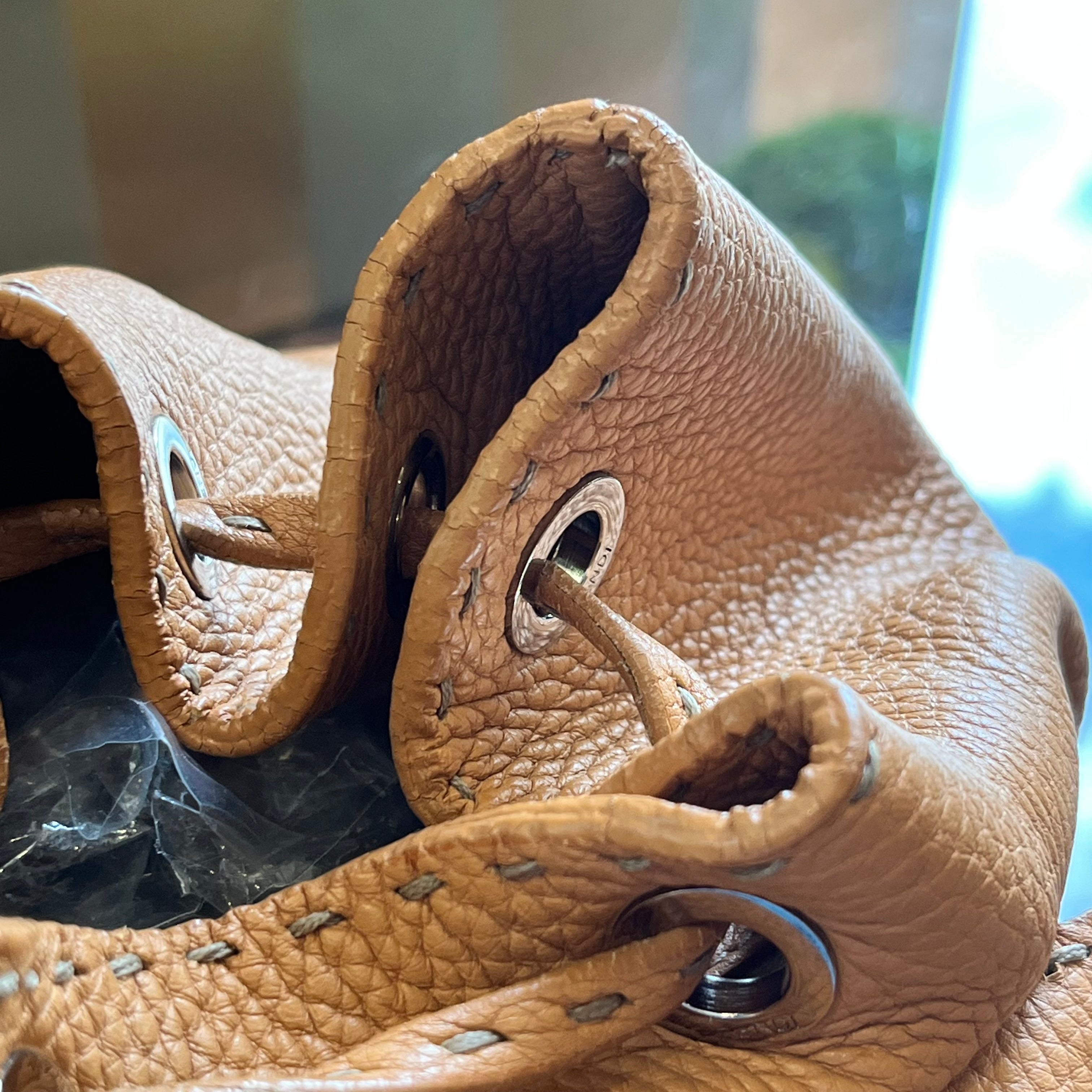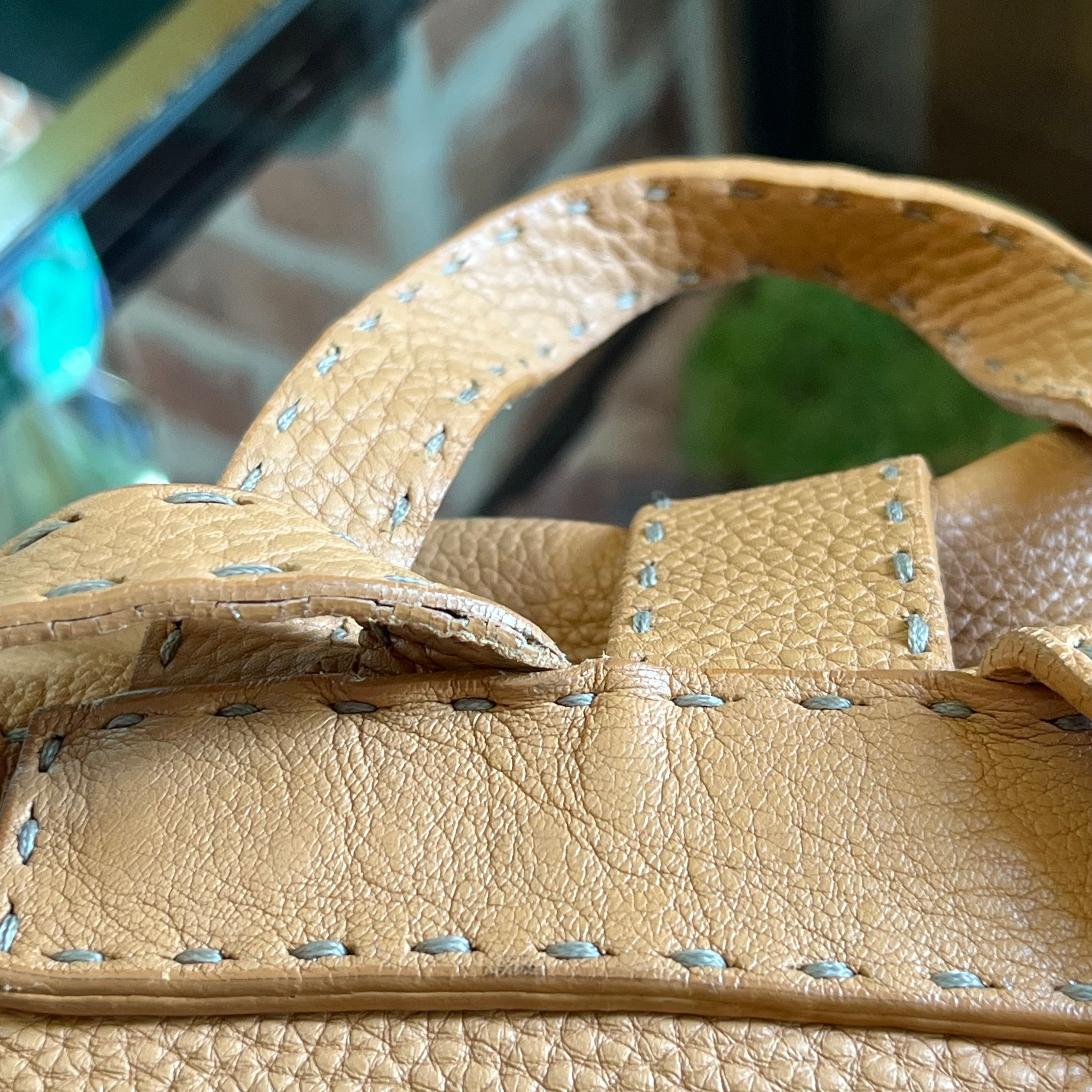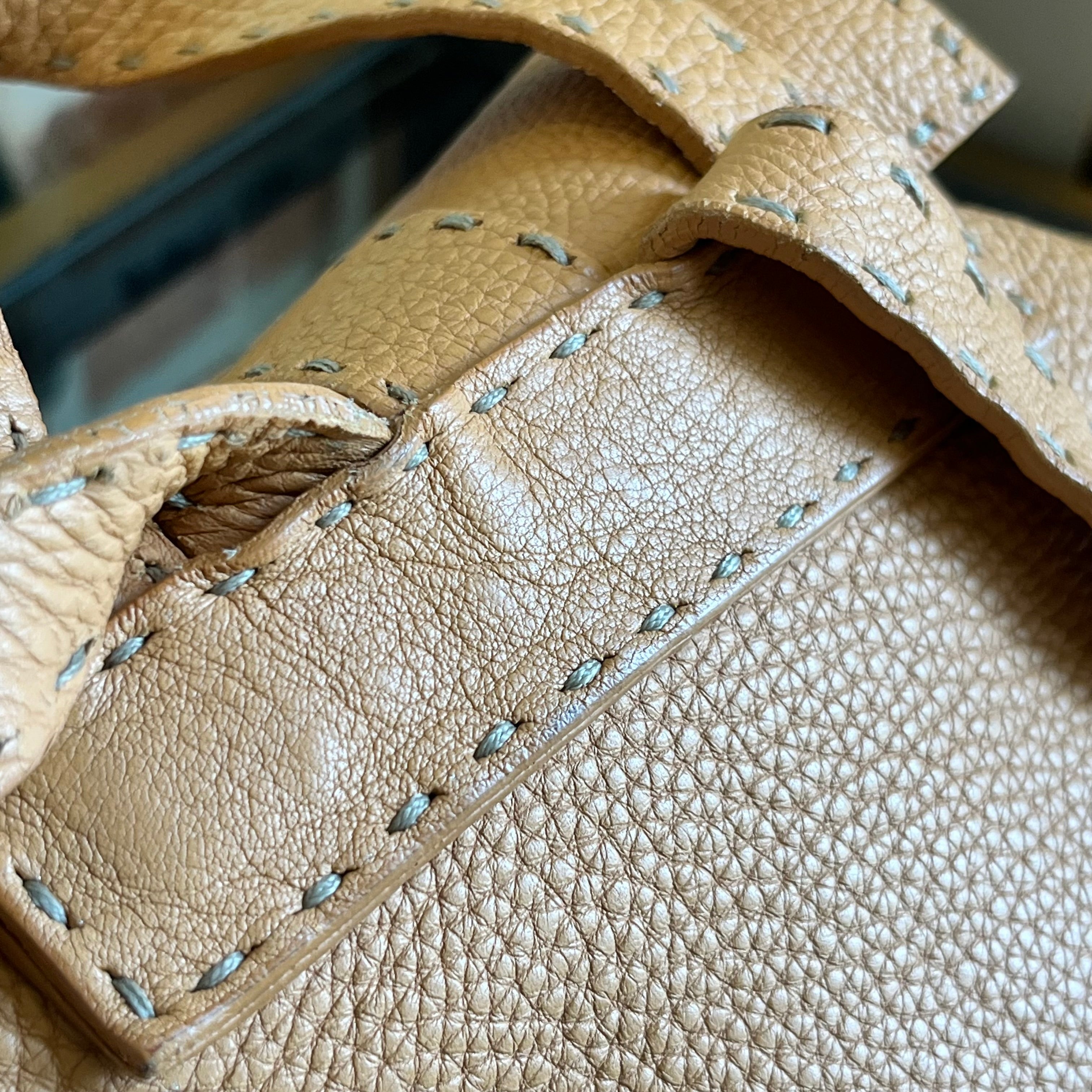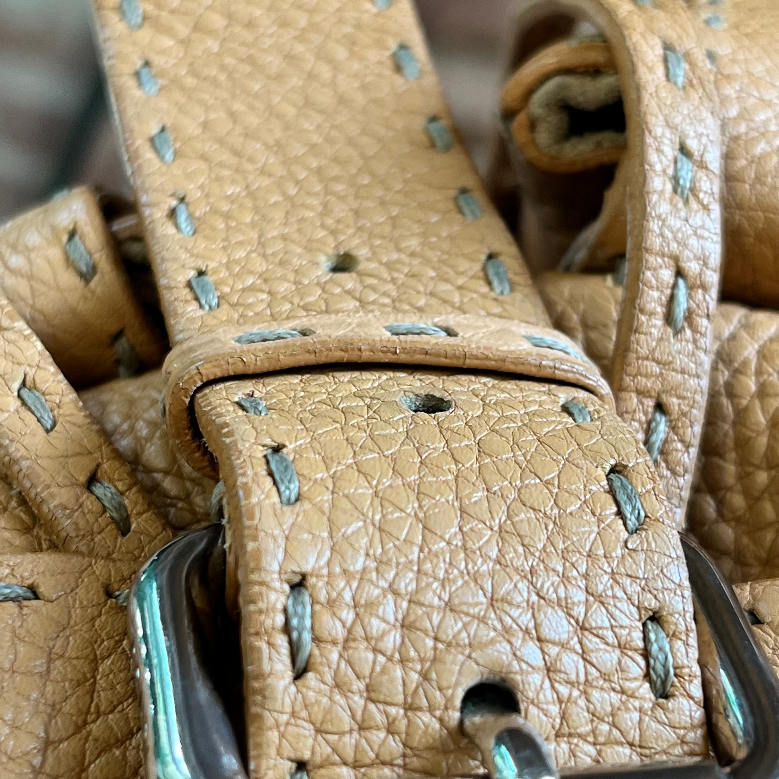 A refined backpack in Fendi's luxurious Selleria calfskin leather, known for its buttery texture and artisanal stitching. The structured silhouette features adjustable straps and multiple compartments for organized storage, while the subtle branding exudes understated elegance. Perfect for those who appreciate Italian craftsmanship with everyday functionality. B+ Very Good Condition