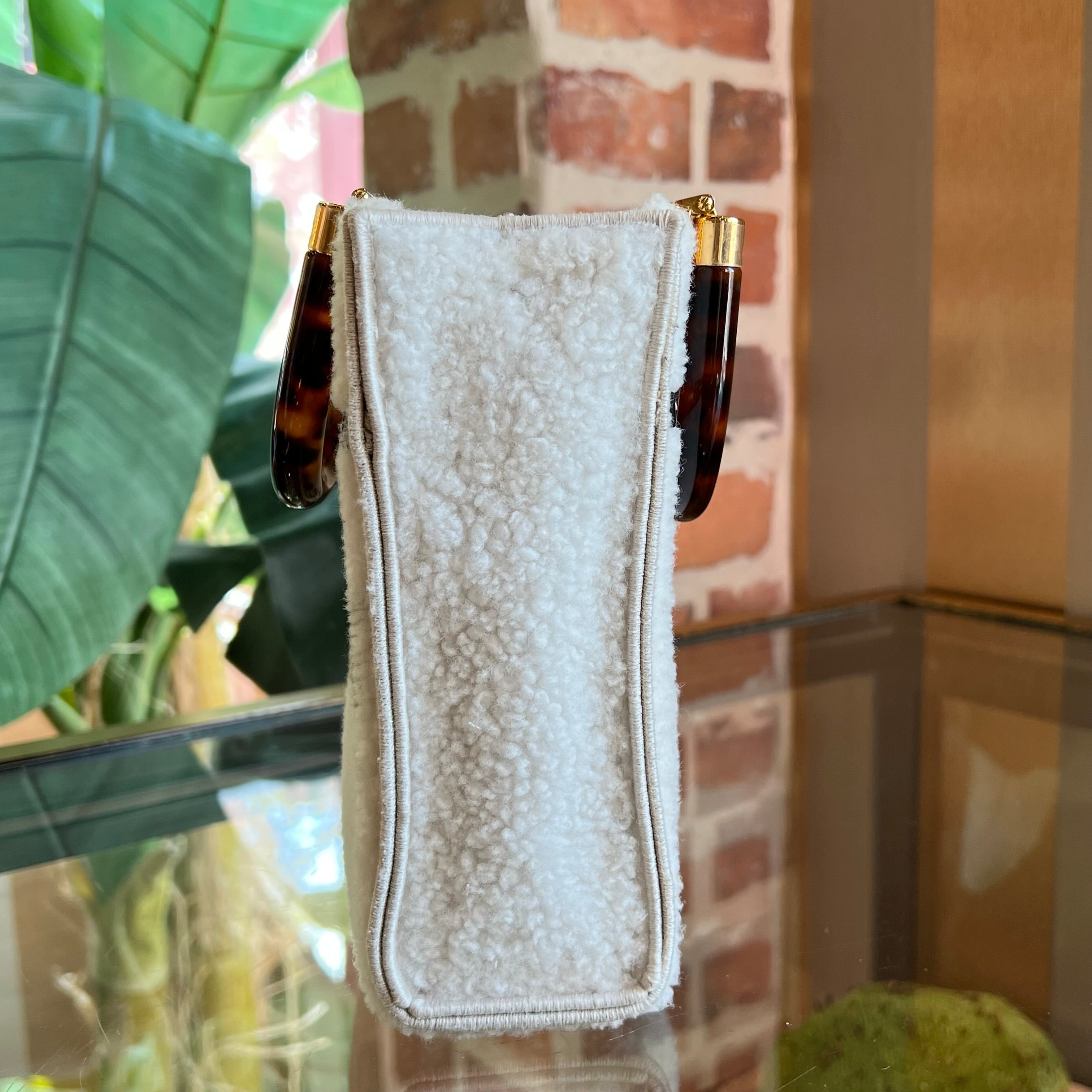 A cozy yet chic statement piece, this mini tote bag combines plush white and taupe shearling with smooth Vitello King leather, accented by Fendi's iconic plexiglass logo for a modern touch. Its compact design and luxurious textures make it a perfect blend of warmth and high-fashion sophistication, ideal for elevating your cold-weather style. B+ Very Good Condition