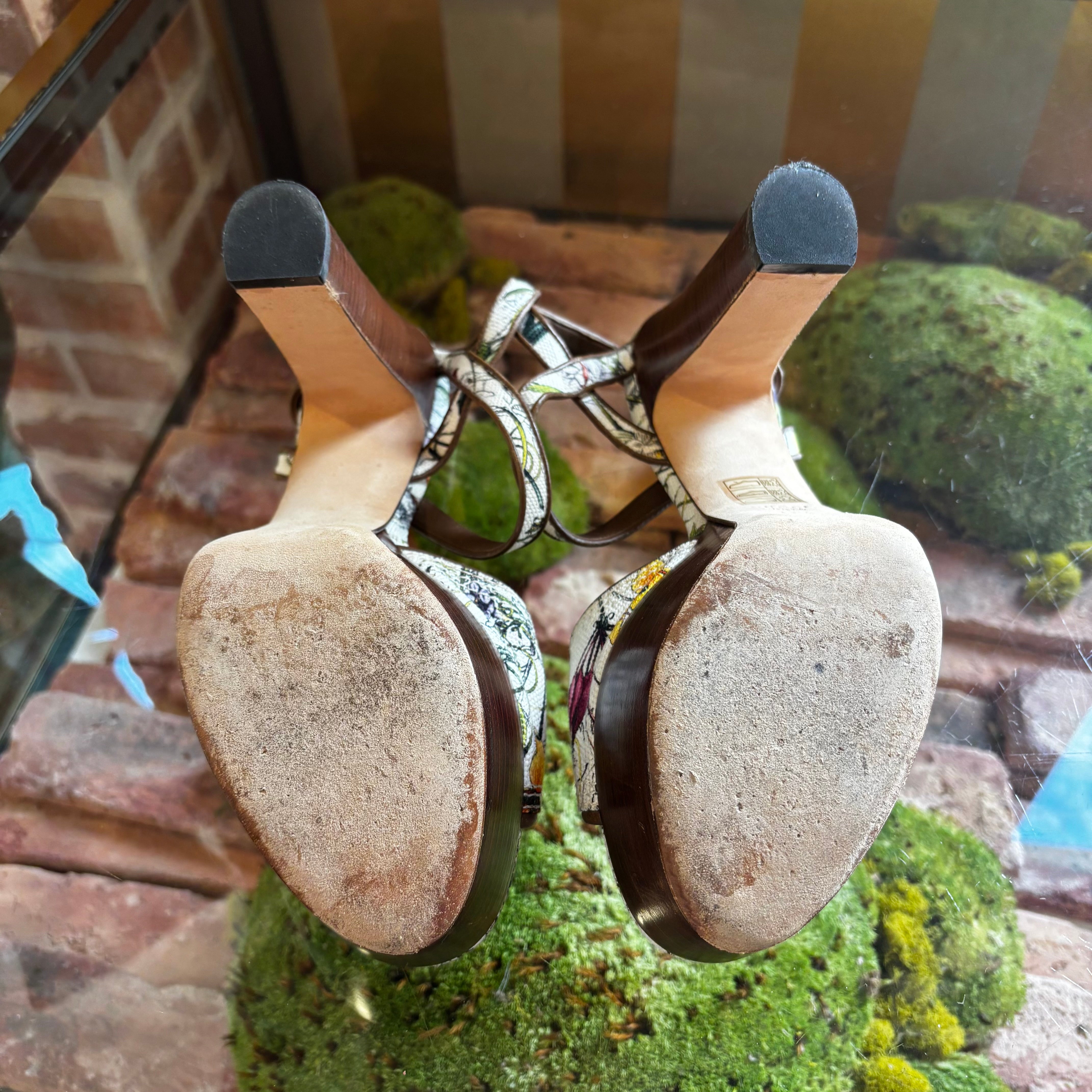 - Design: Open-toe platform heels featuring Gucci’s iconic Flora print