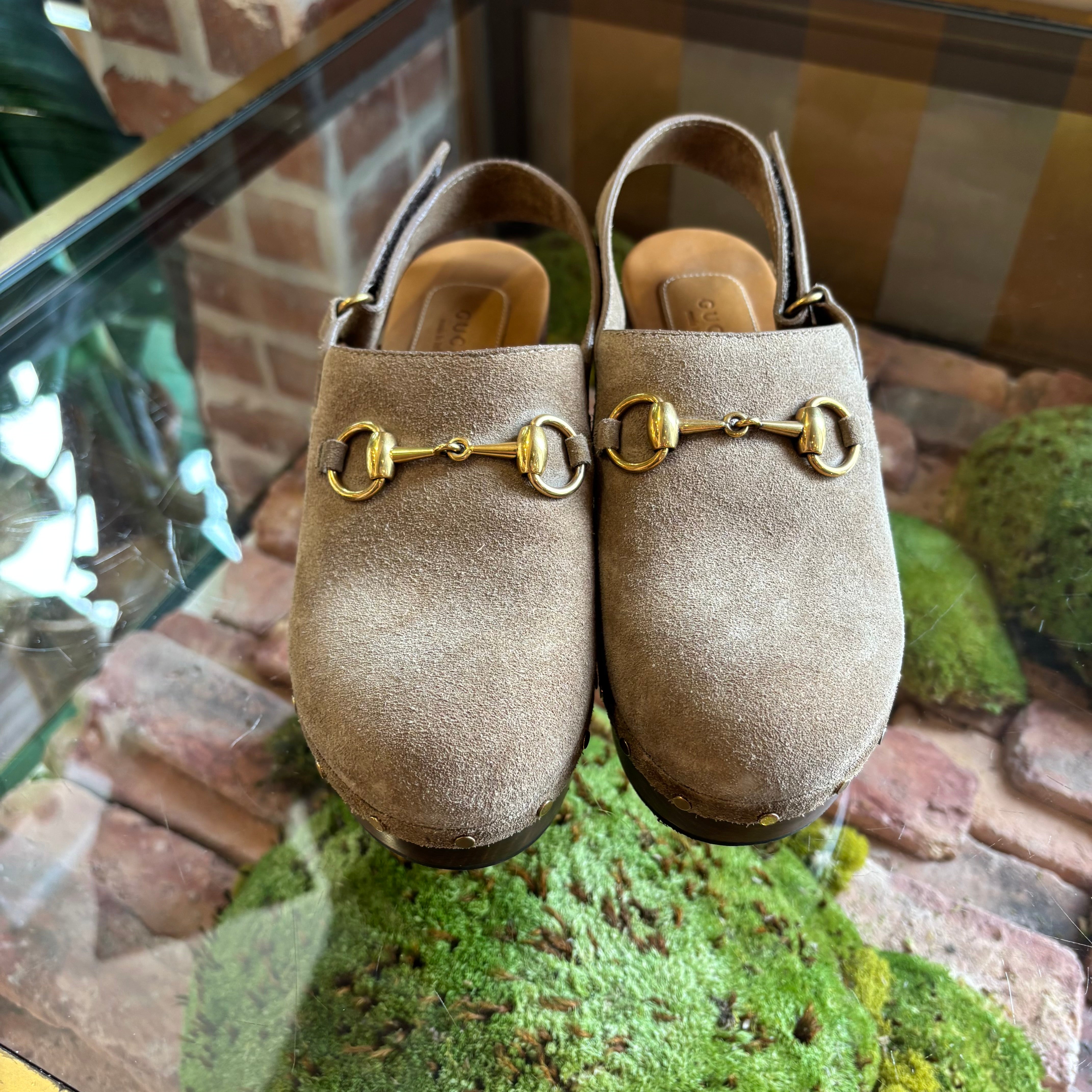 GUCCI Tan Suede Horsebit Clogs 36 Second-Hand Collections