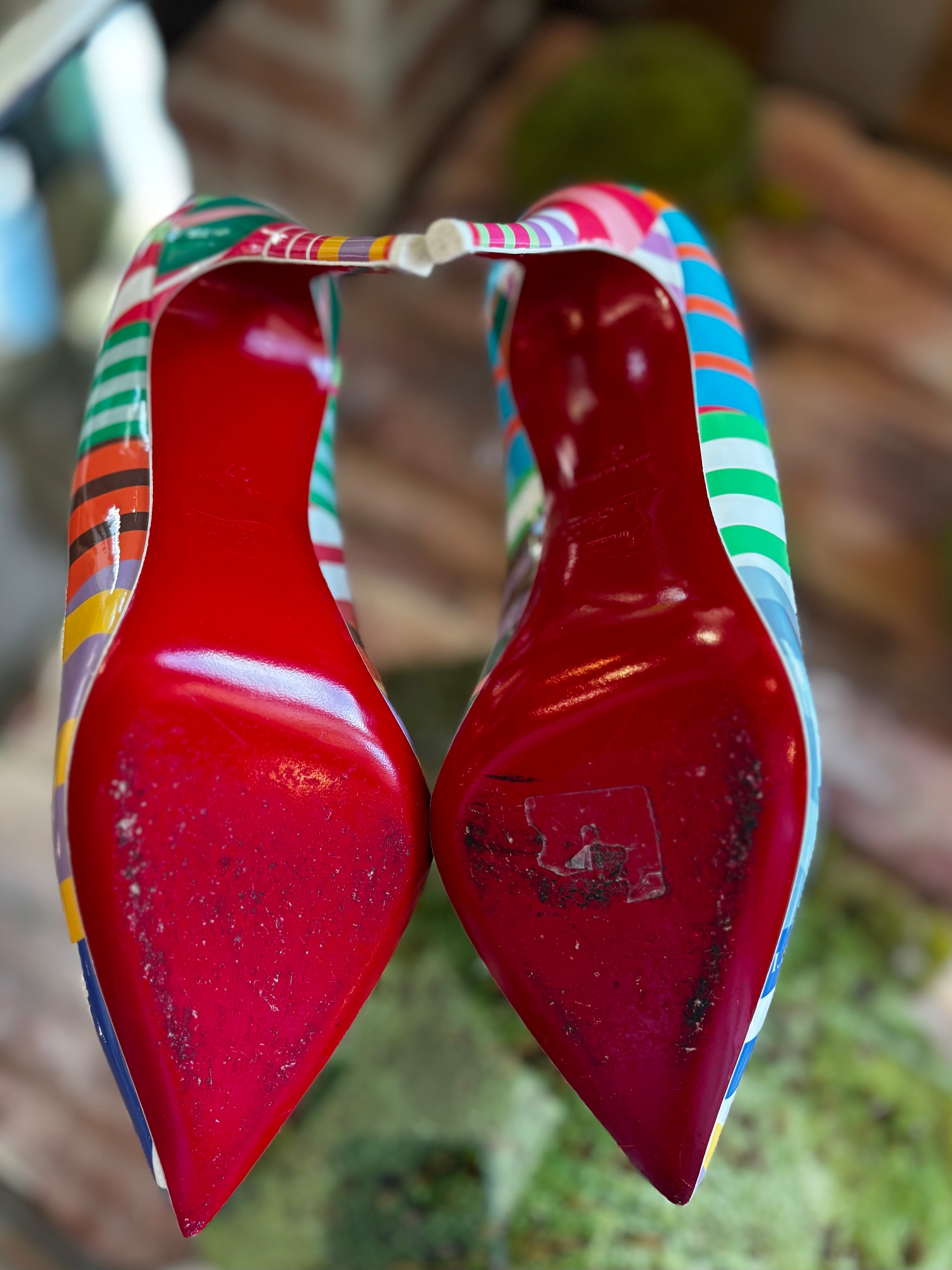 These striking heels combine bold design with luxurious craftsmanship, perfect for making a statement at any poolside event. Their distinctive silhouette and signature red sole embody sophistication and glamour, ensuring you stand out with effortless elegance. Ideal for those who appreciate high fashion and unique footwear, these heels bring a touch of refined allure to your warm-weather wardrobe. Overall in Very Good Condition. B+