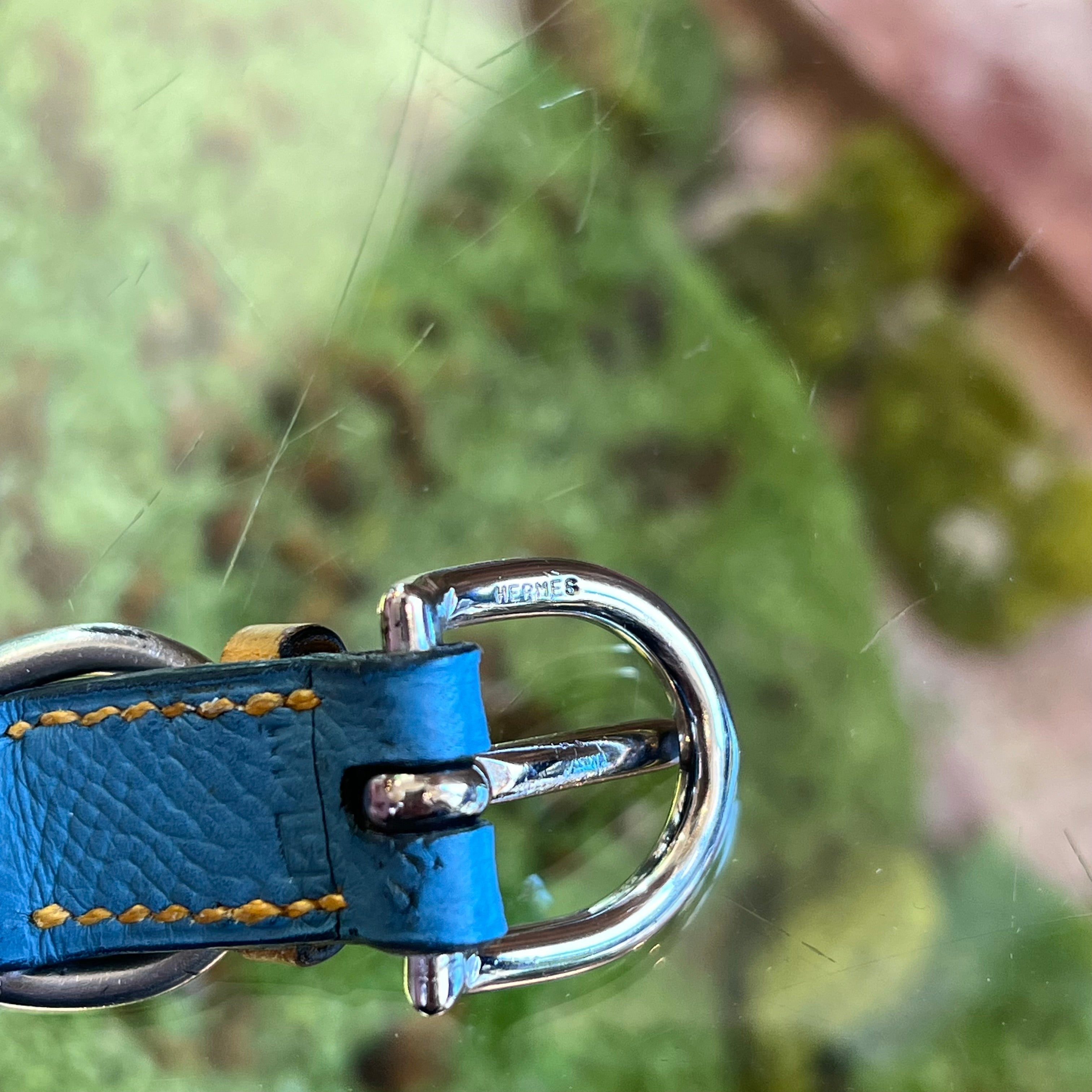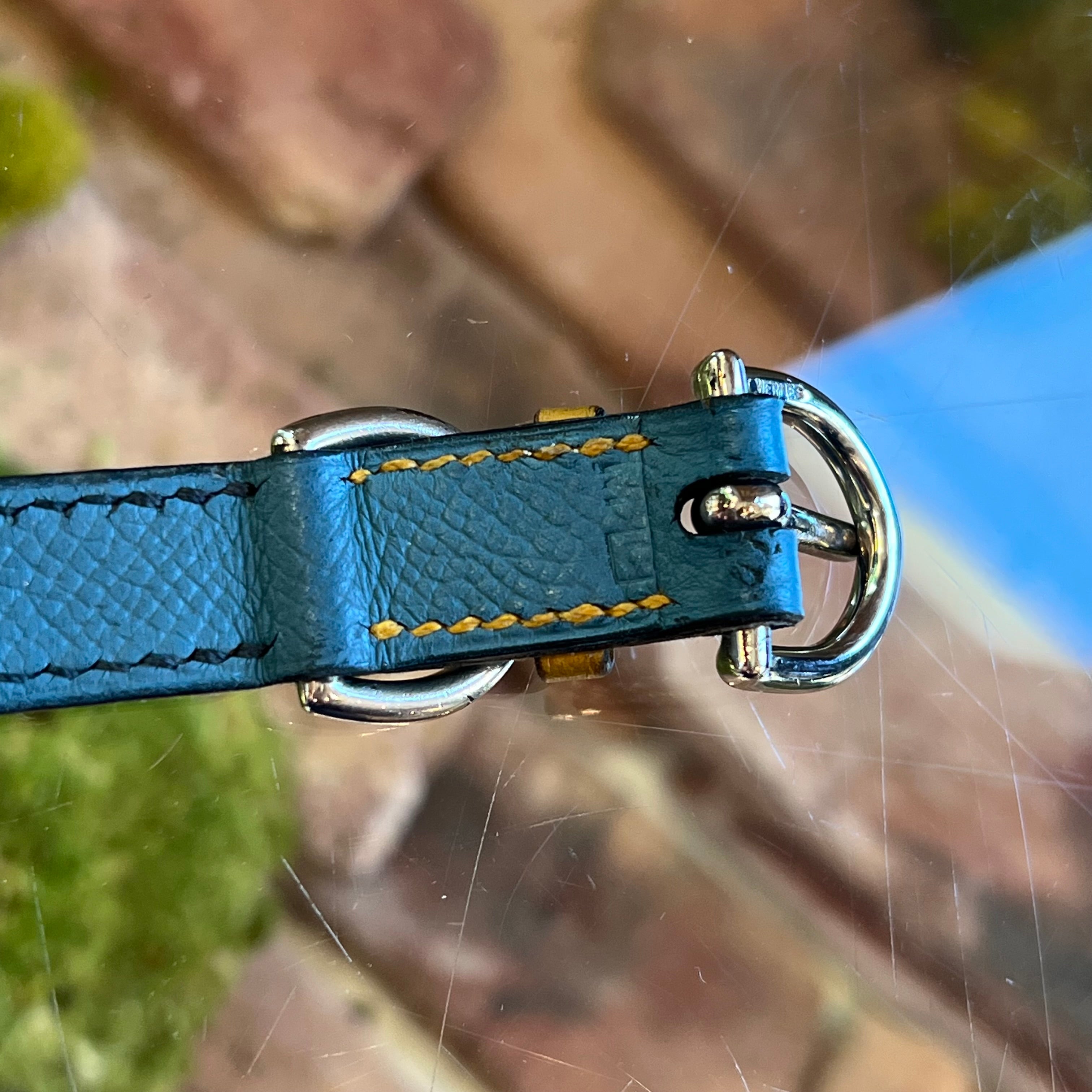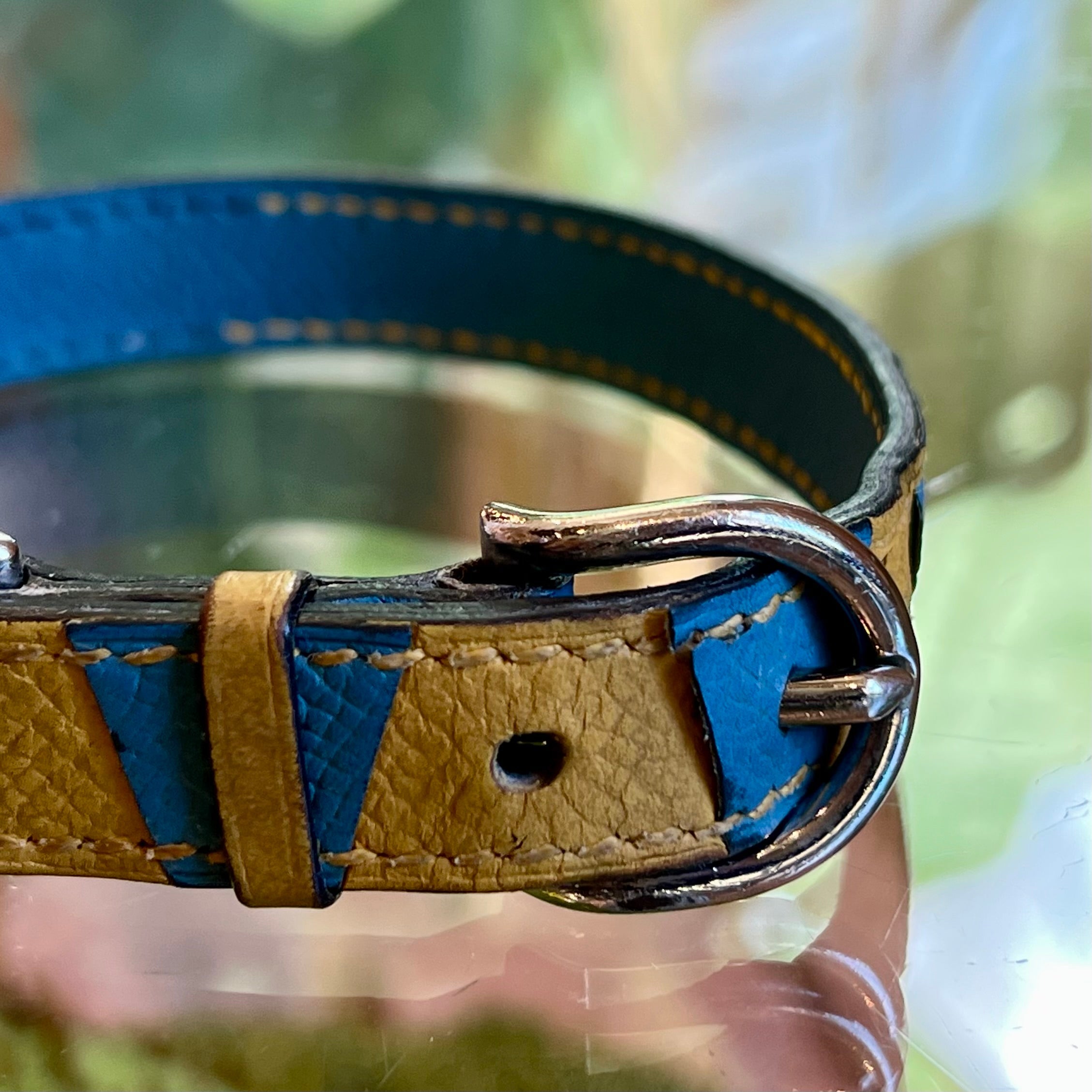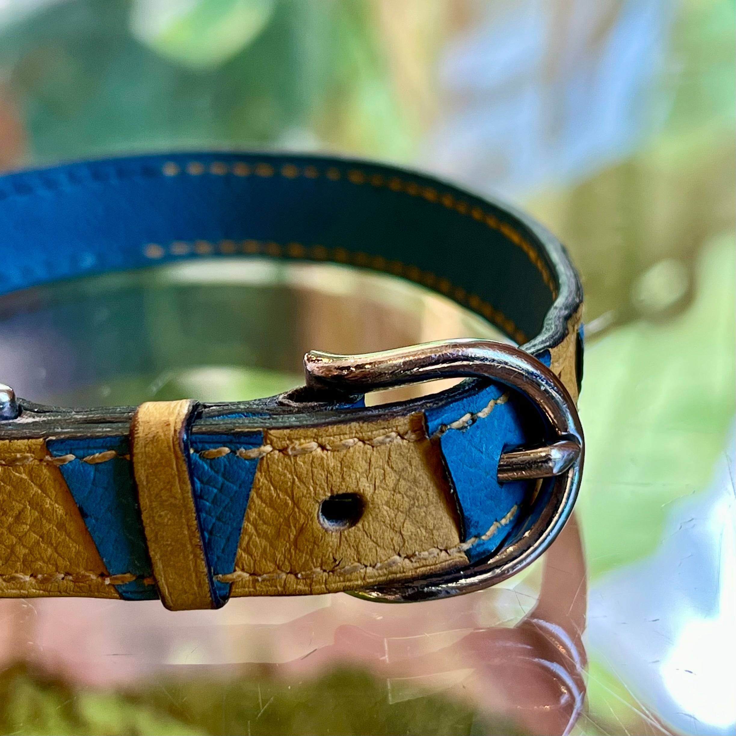 The Hermès Dog Collar features a charming Blue Jean and Jaune Sable colorway in durable Epsom leather, accented by gleaming Palladium hardware. Crafted with meticulous attention to detail, this collar is a sophisticated accessory for your cherished pet. B- Good Overall Condition