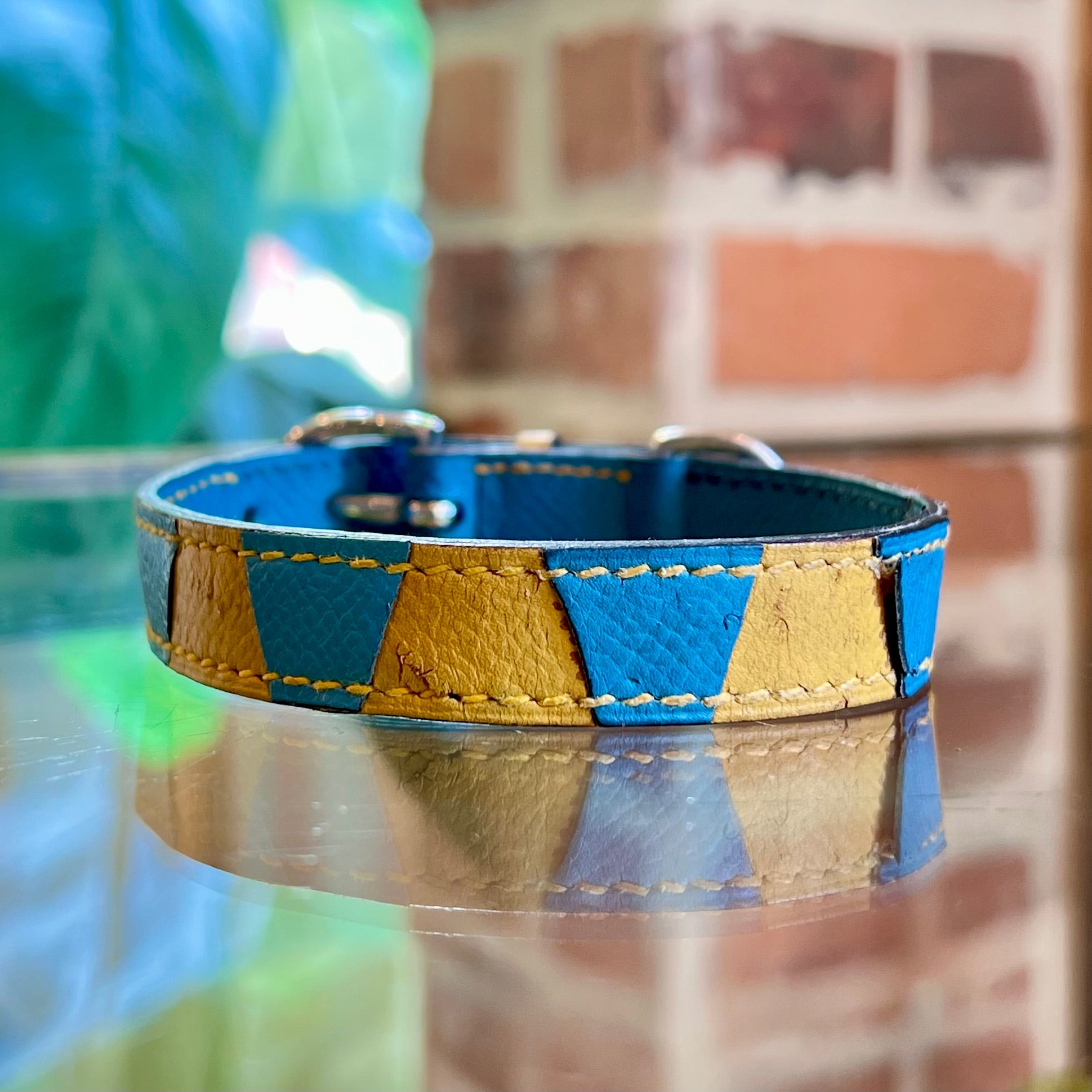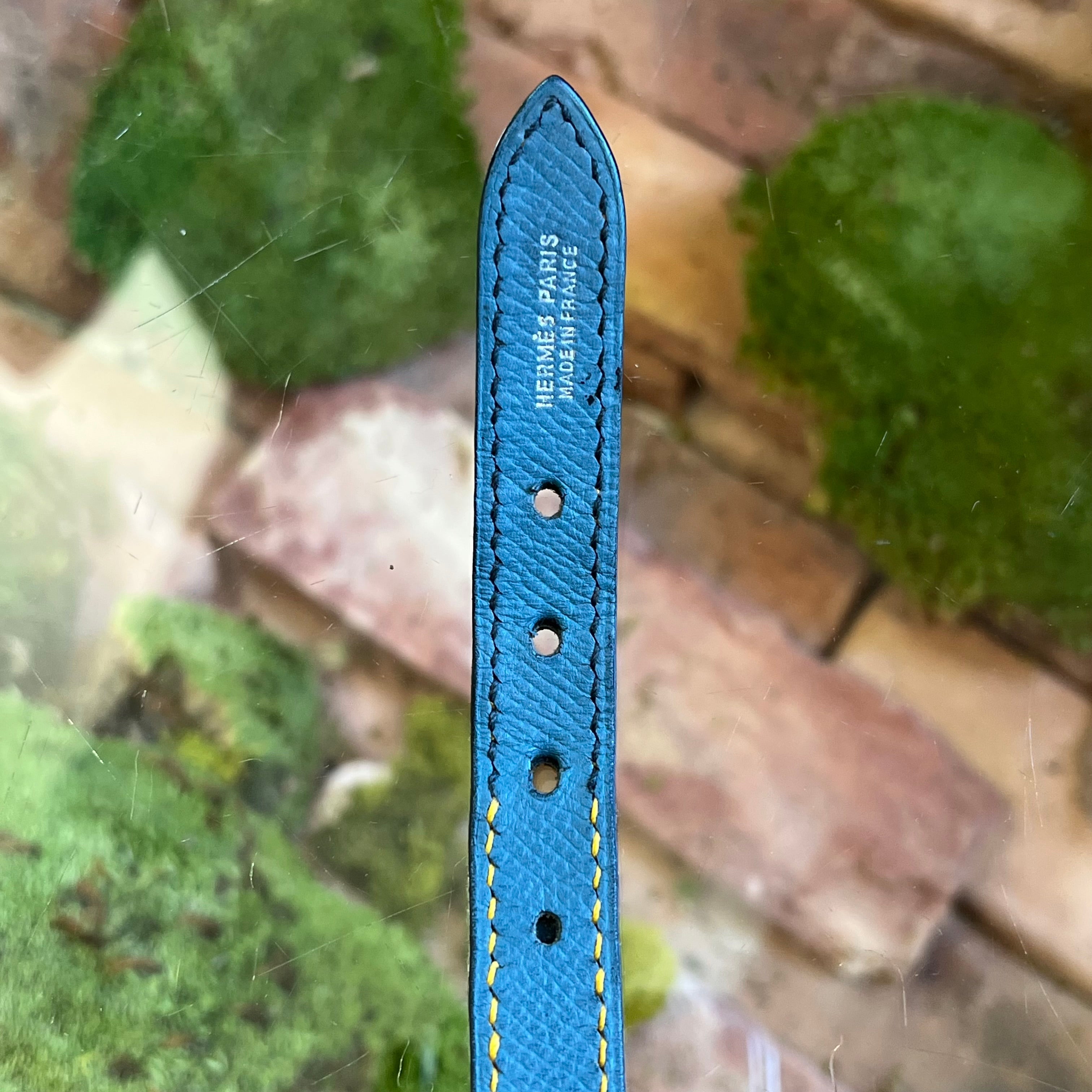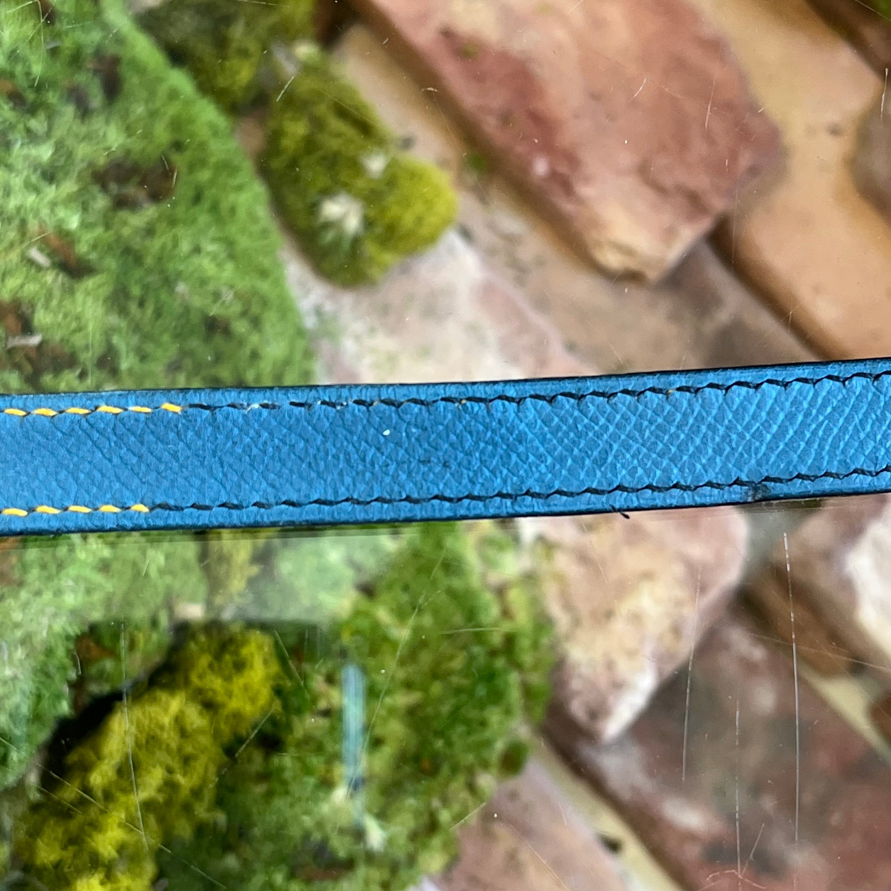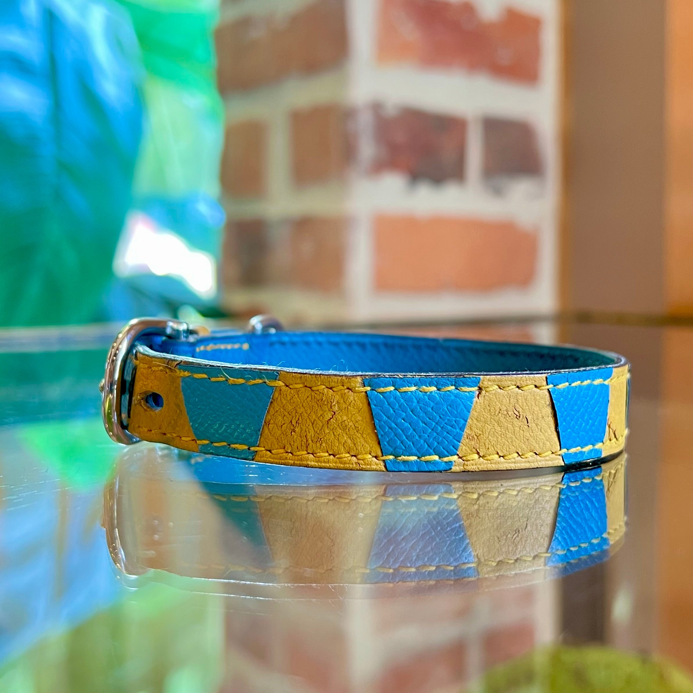 The Hermès Dog Collar features a charming Blue Jean and Jaune Sable colorway in durable Epsom leather, accented by gleaming Palladium hardware. Crafted with meticulous attention to detail, this collar is a sophisticated accessory for your cherished pet. B- Good Overall Condition