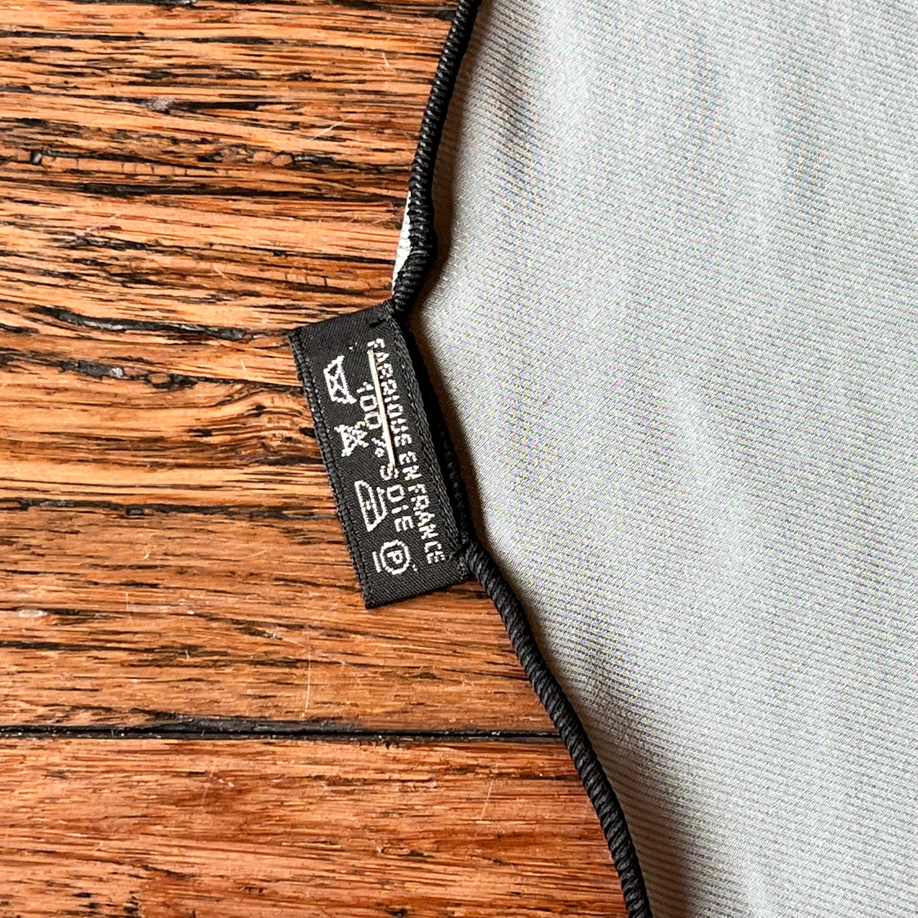 A masterclass in monochrome elegance, this scarf drapes in luminous gray silk with razor-sharp black hand-rolled edges—Hermès' signature precision meeting downtown minimalism. The elongated losange (diamond) shape offers fresh styling possibilities, from asymmetric neck knots to bag adornments, while the subtle sheen whispers quiet luxury. B+ Very Good Condition