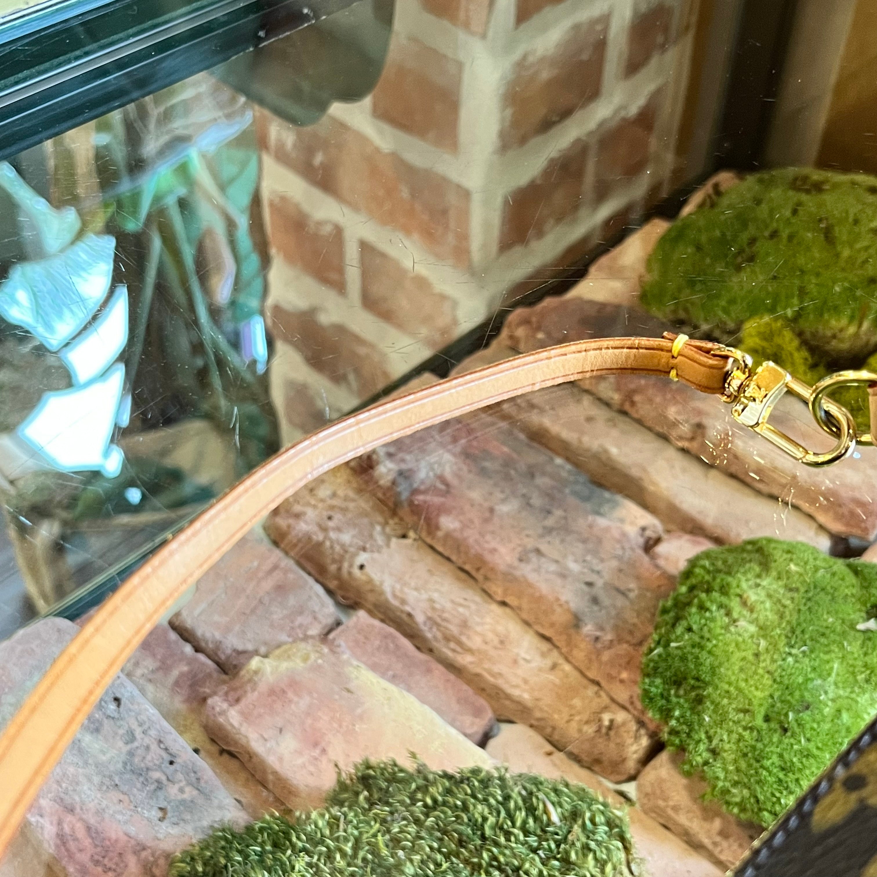 - Handle: The vachetta leather has developed a honey patina with a small crack to the strap and the base of the strap, appearing darker in higher contact areas, and small water/oil marks.