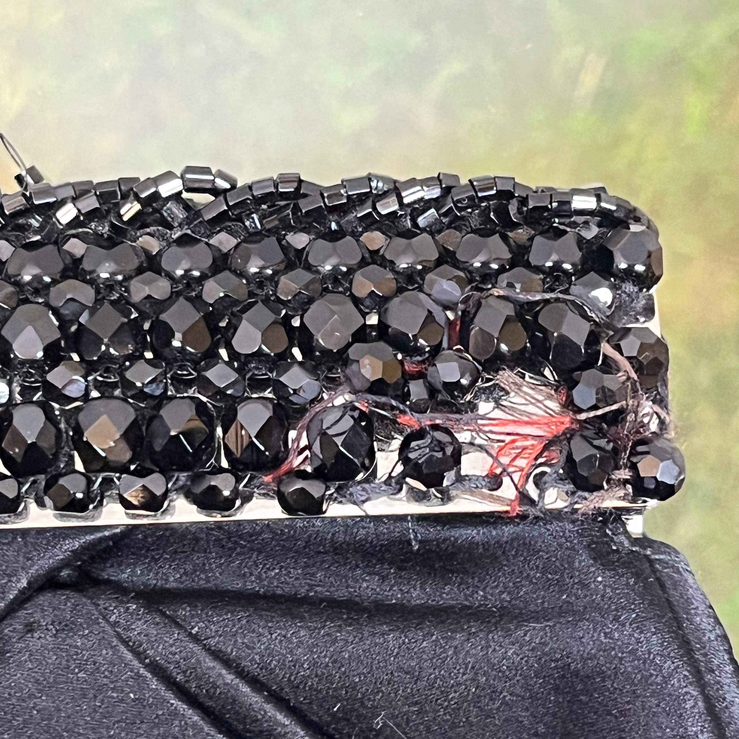 - Exterior: The satin remains vibrant and beautiful, with light rubbing and a couple of gentle runs that add subtle character. The beaded frame closure shows loose threads, beading, and a few missing beads (see photos), yet it remains fully functional as is—ready to bring its timeless charm to any occasion.
