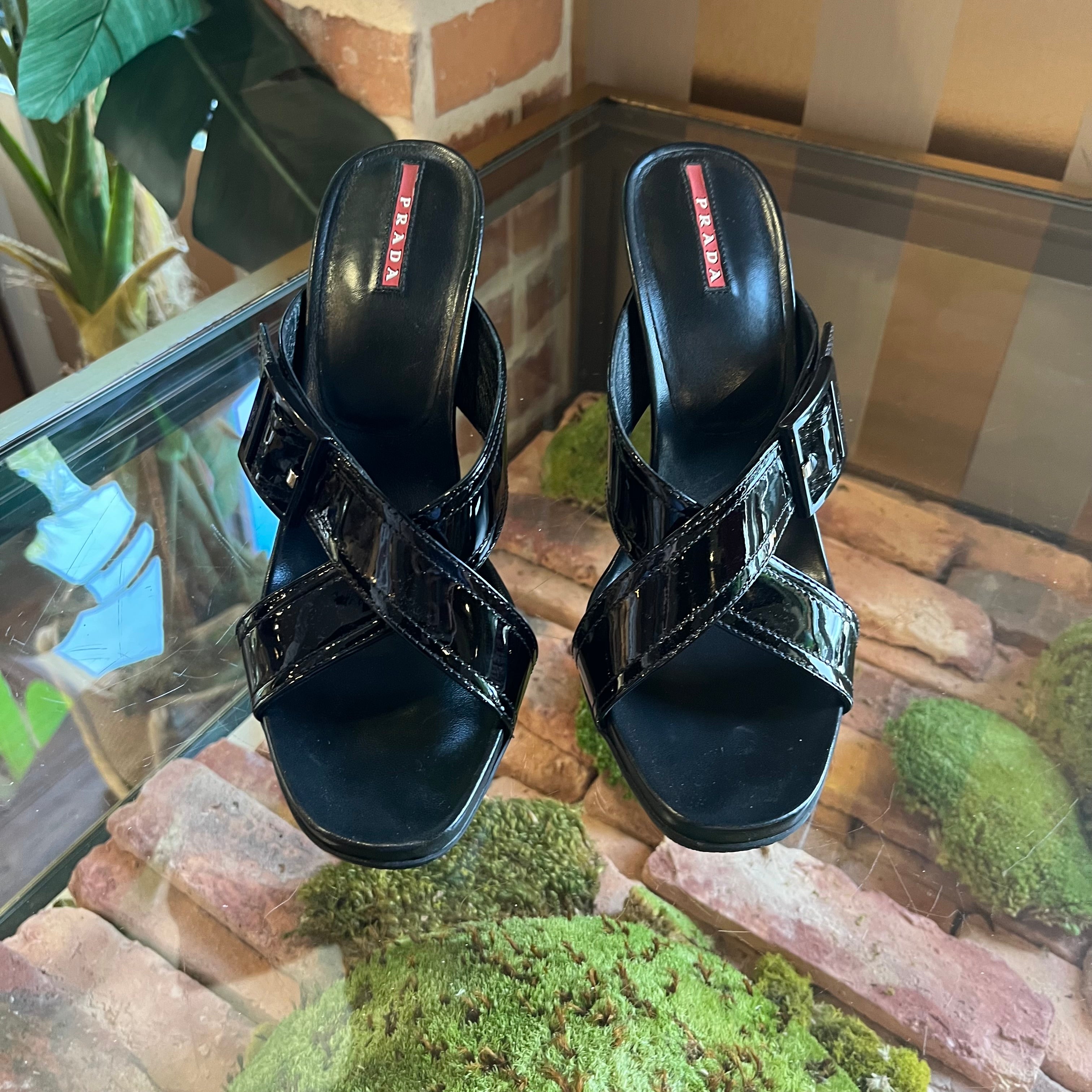 Elevate your ensemble with these PRADA Black Patent Leather Heels in size 40. Crafted from glossy patent leather, they offer a sleek, polished look that complements both formal and chic casual outfits. The refined silhouette and quality craftsmanship ensure lasting comfort and style, making them a timeless addition to your wardrobe. Perfect for occasions where elegance and sophistication are paramount. Very good condition.