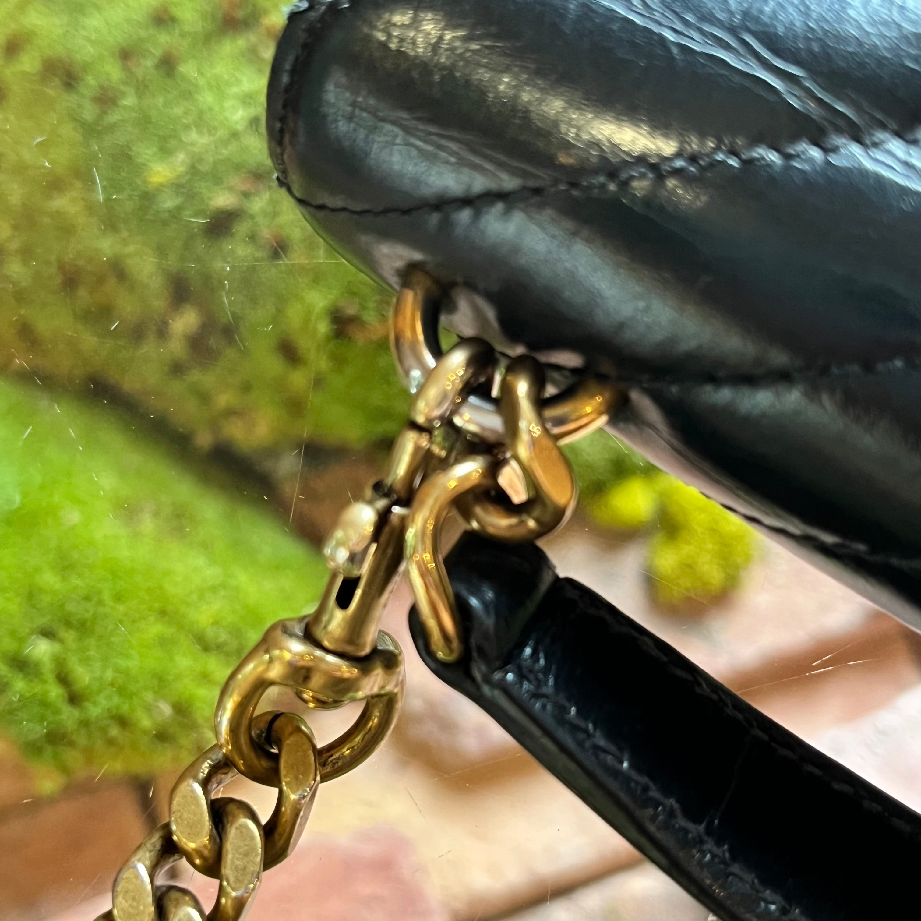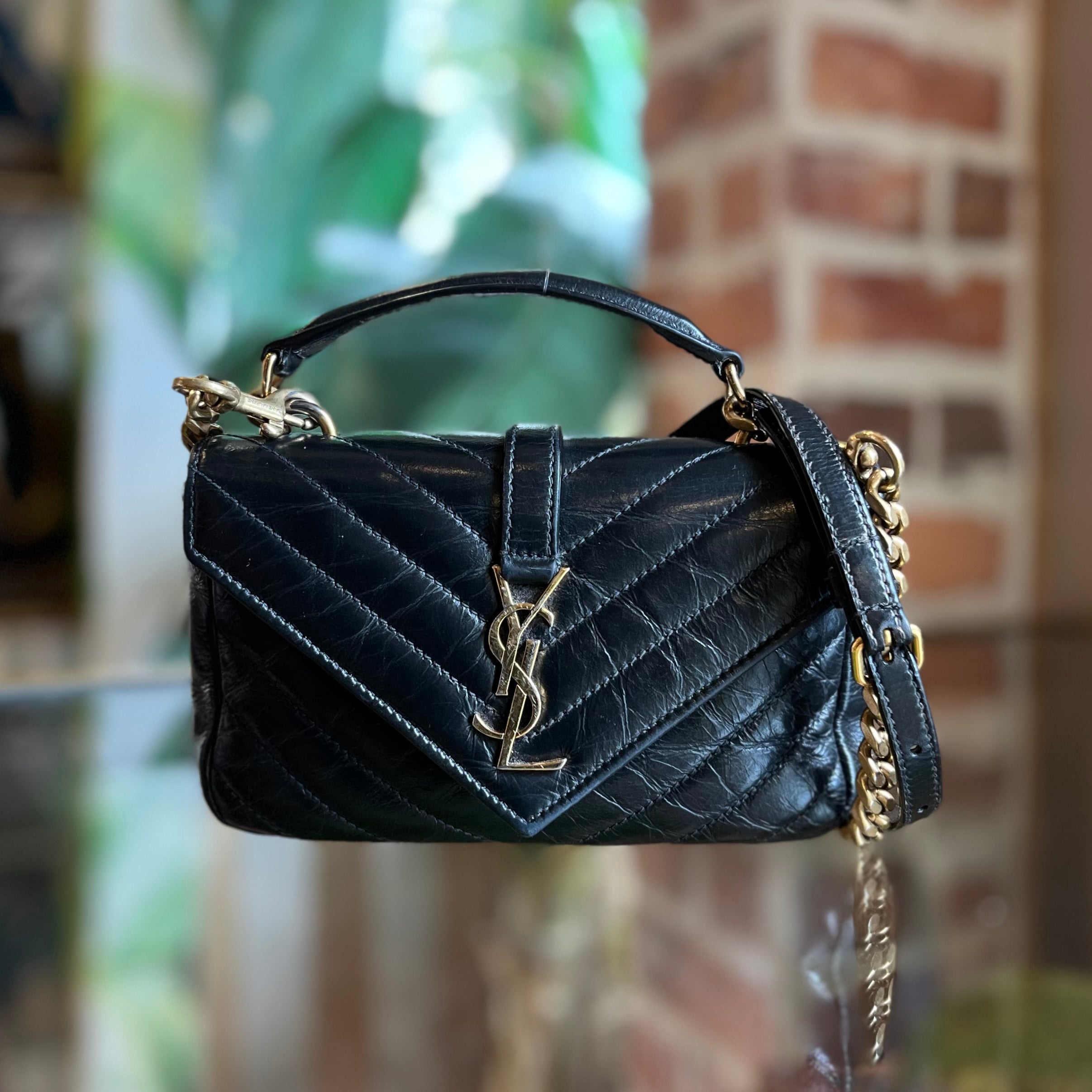 Elevate your style with the SAINT LAURENT College Mini Shoulder Bag, crafted from luxurious shiny crackled leather. Its compact silhouette blends elegance and modern edge, perfect for carrying essentials with a refined touch. The shoulder strap offers comfortable wear, while the distinctive texture adds a unique statement to any outfit. A timeless accessory designed to enhance your sophisticated look. B+ Very Good Condition