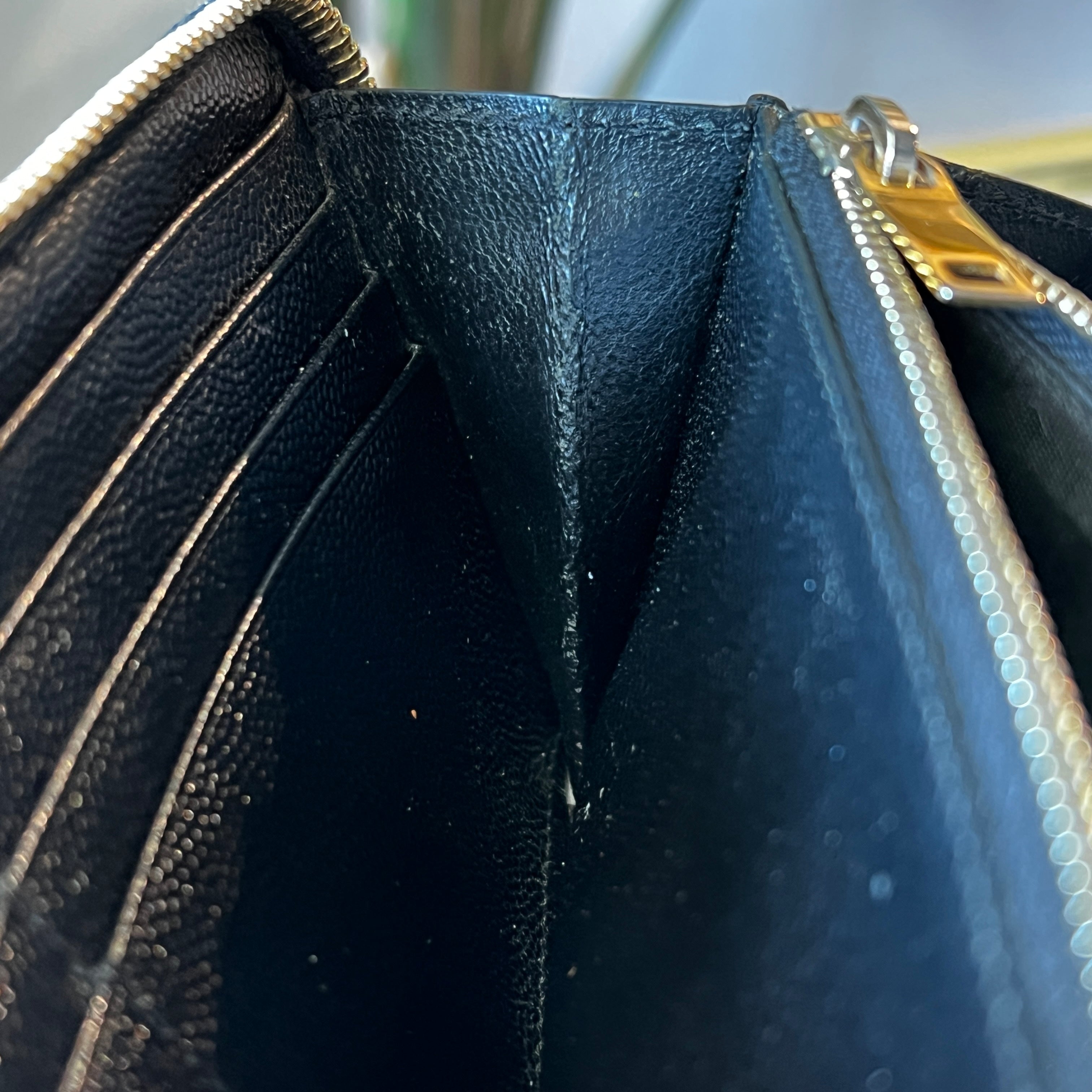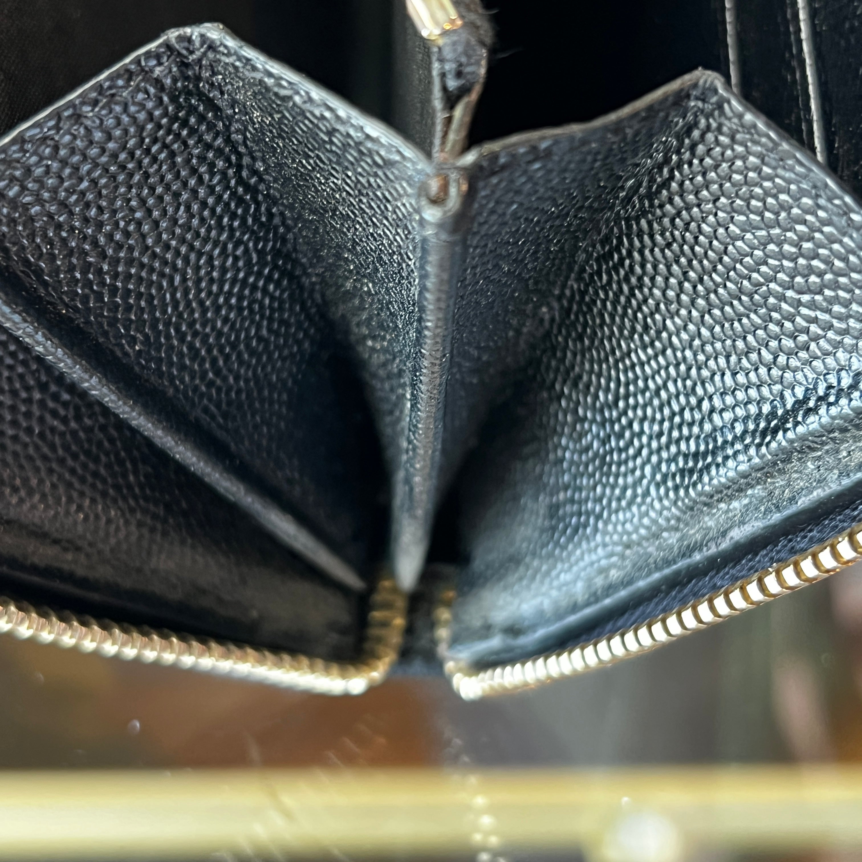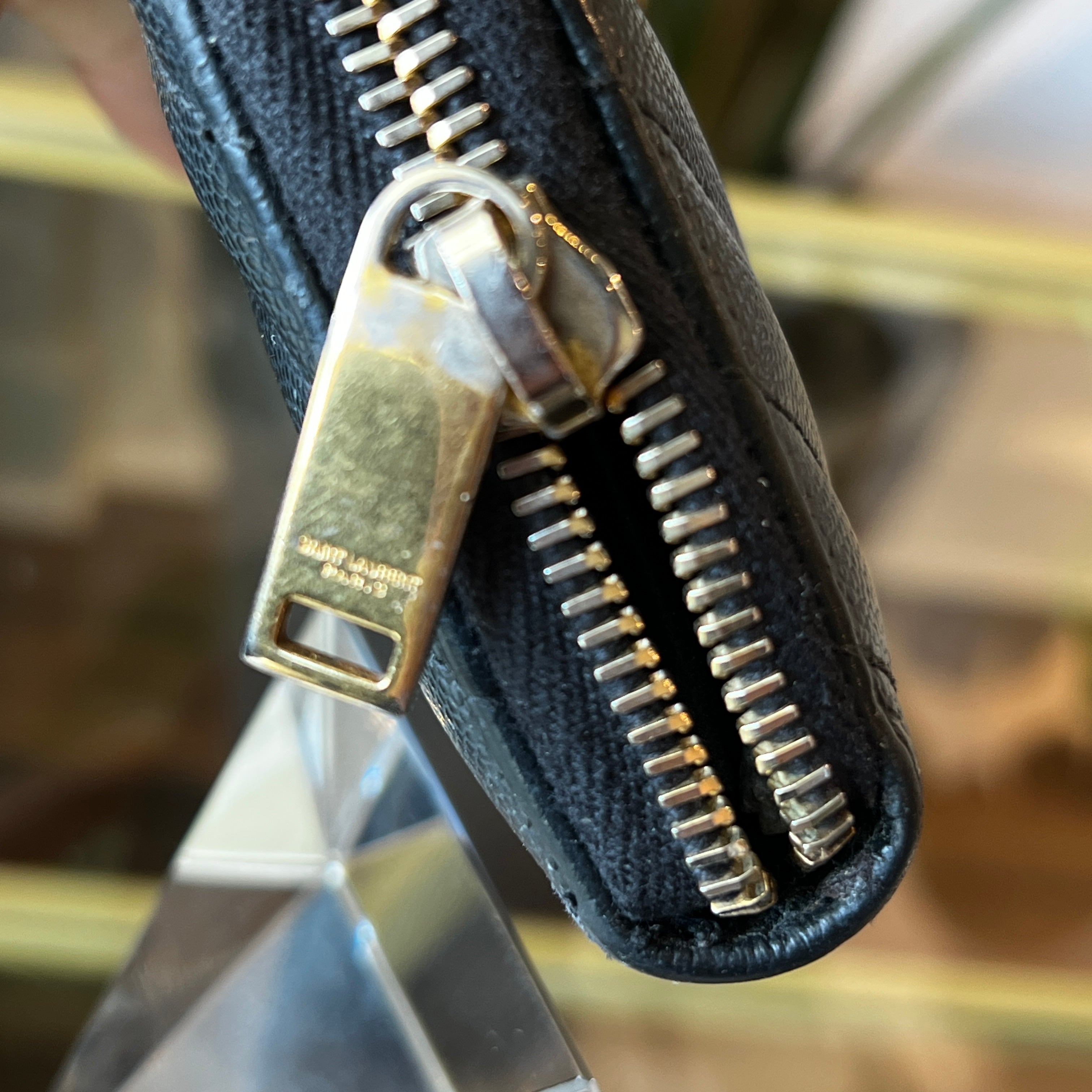 - Saint Laurent pebbled calfskin wallet with matelassé stitching.