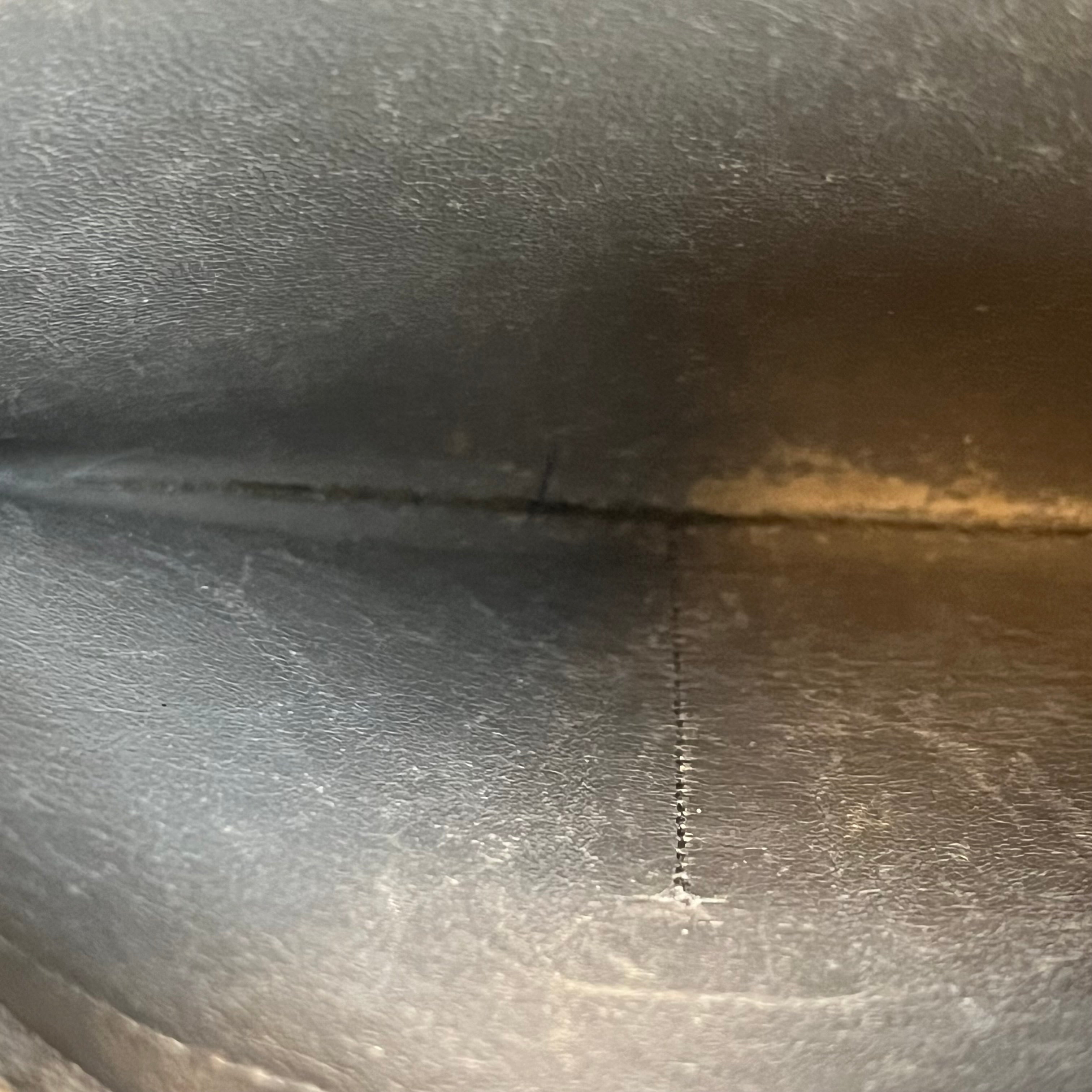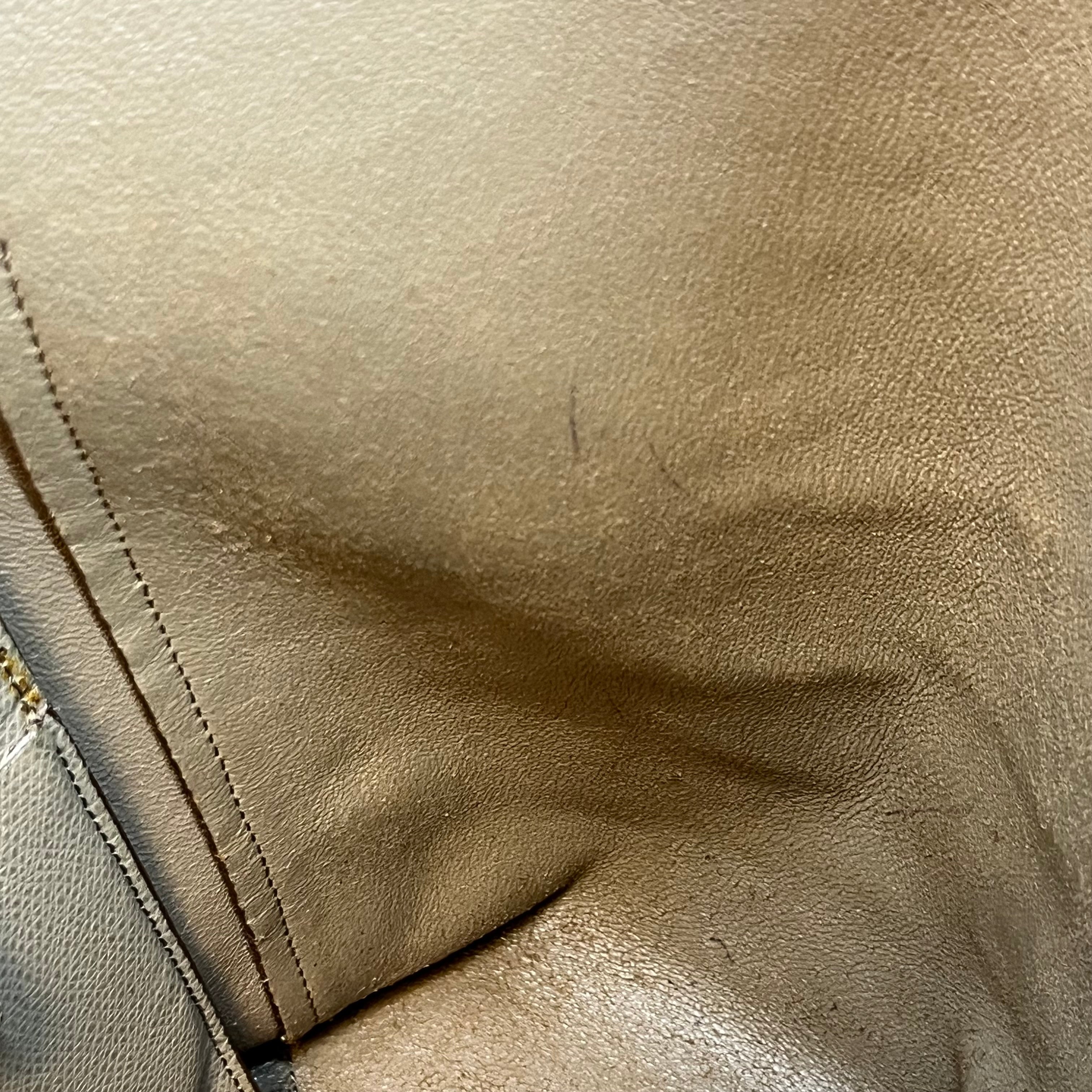 - Exterior: The leather is rich and supple with heavy scuffing, darkening, misshapenness, creasing, marks, and prominent glazing wear. A well-traveled piece full of character, it still has plenty of life left for many more adventures.