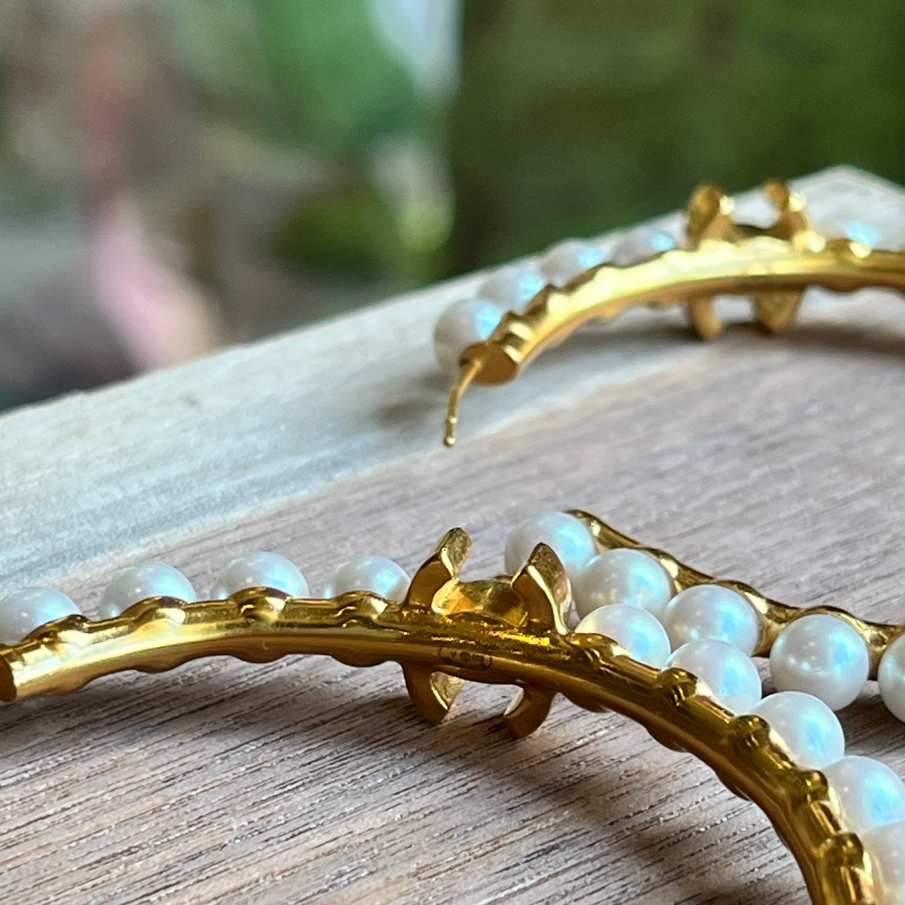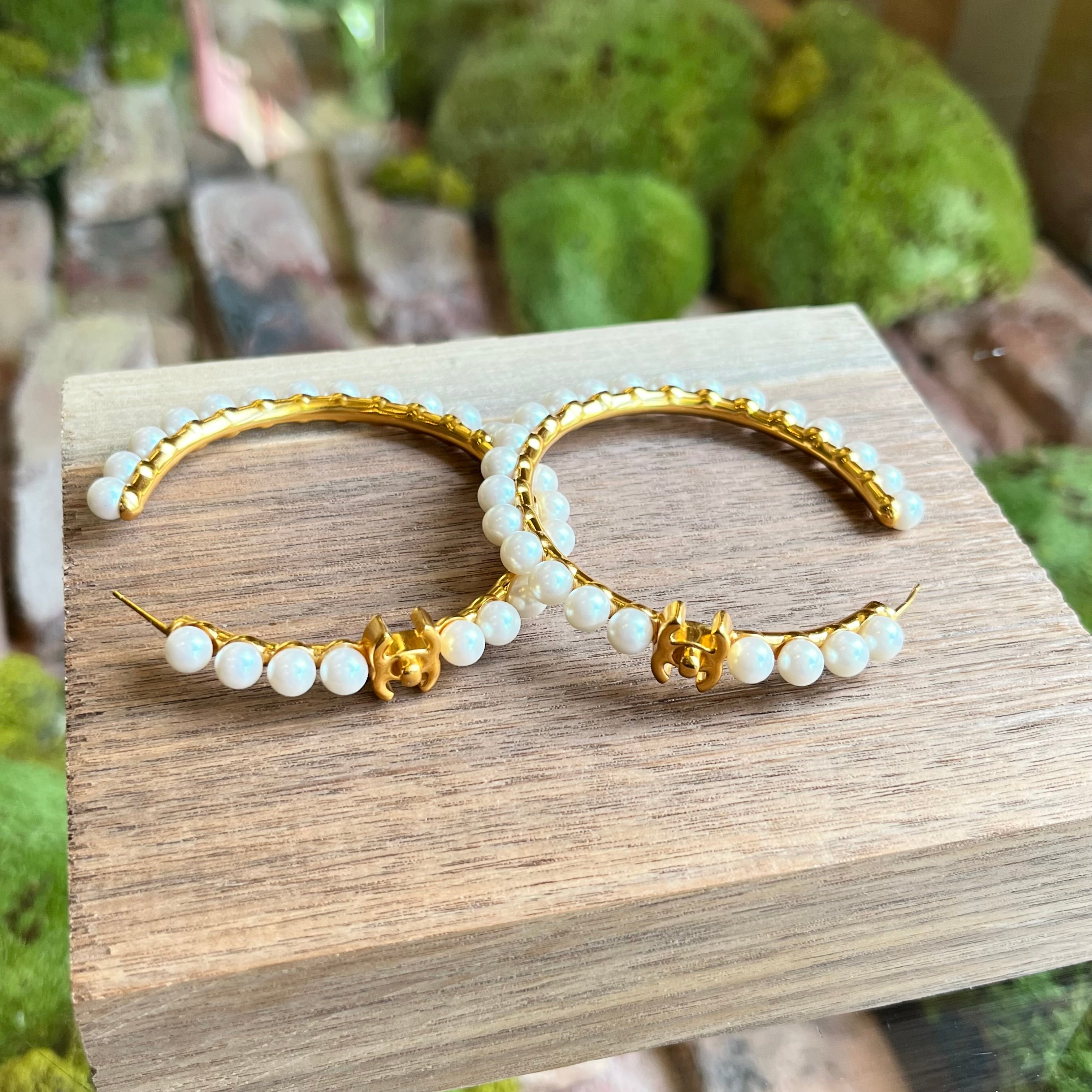A bold ode to maximalist glamour, these hoops feature Chanel's iconic CC logo encrusted with lustrous pearls for unapologetic opulence. The oversized silhouette and high-shine finish ensure head-turning impact, while the intricate detailing nods to the maison's love of couture-level accessories—perfect for those who believe more is never enough. B+ Very Good Condition