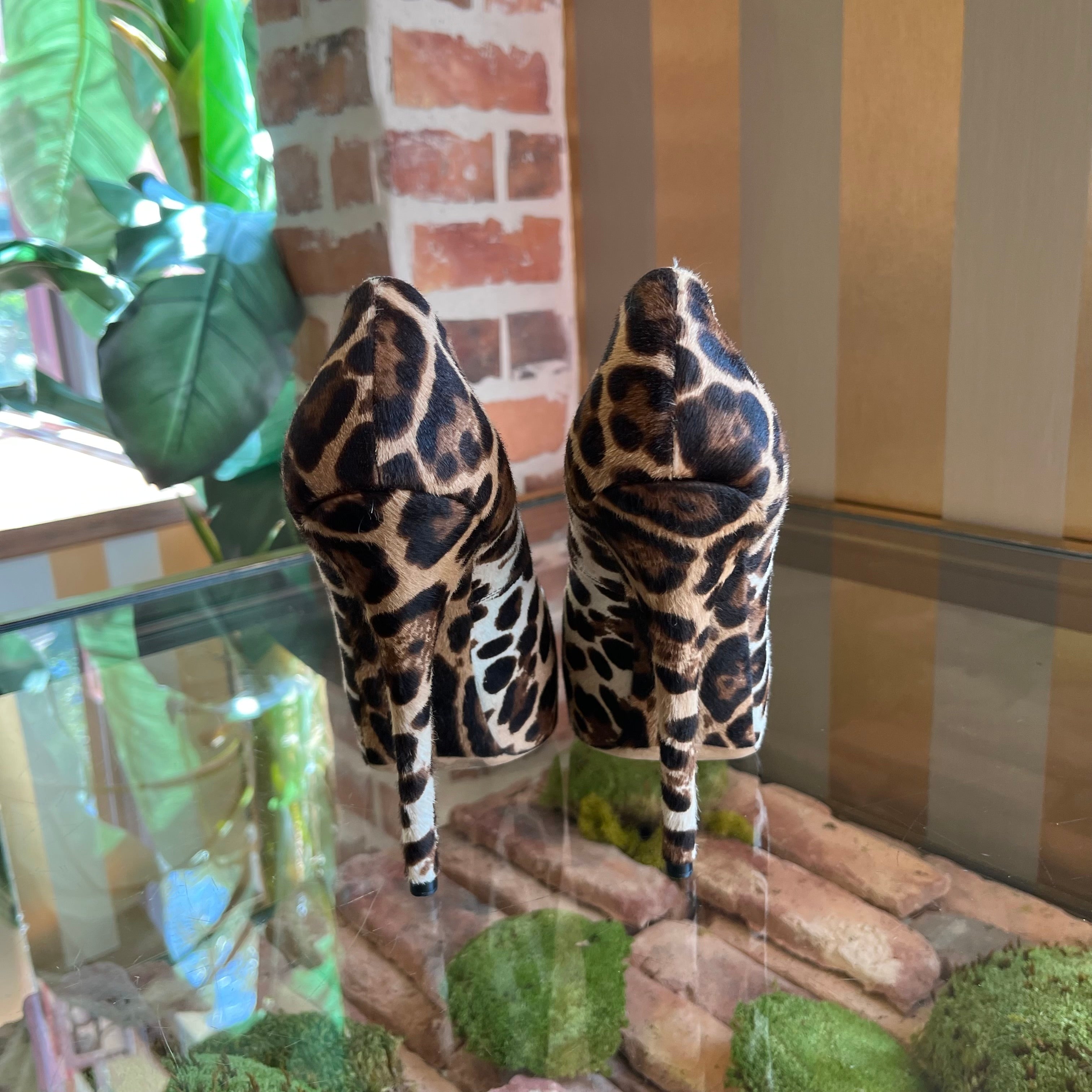 A wild eruption of untamed glamour, these pumps showcase lustrous pony hair in a bold leopard print, mounted on a daring platform and stiletto heel for maximum impact. The absence of hardware keeps the focus purely on the primal texture and seductive silhouette—Sicilian drama at its most elemental. B+ Very Good Condition