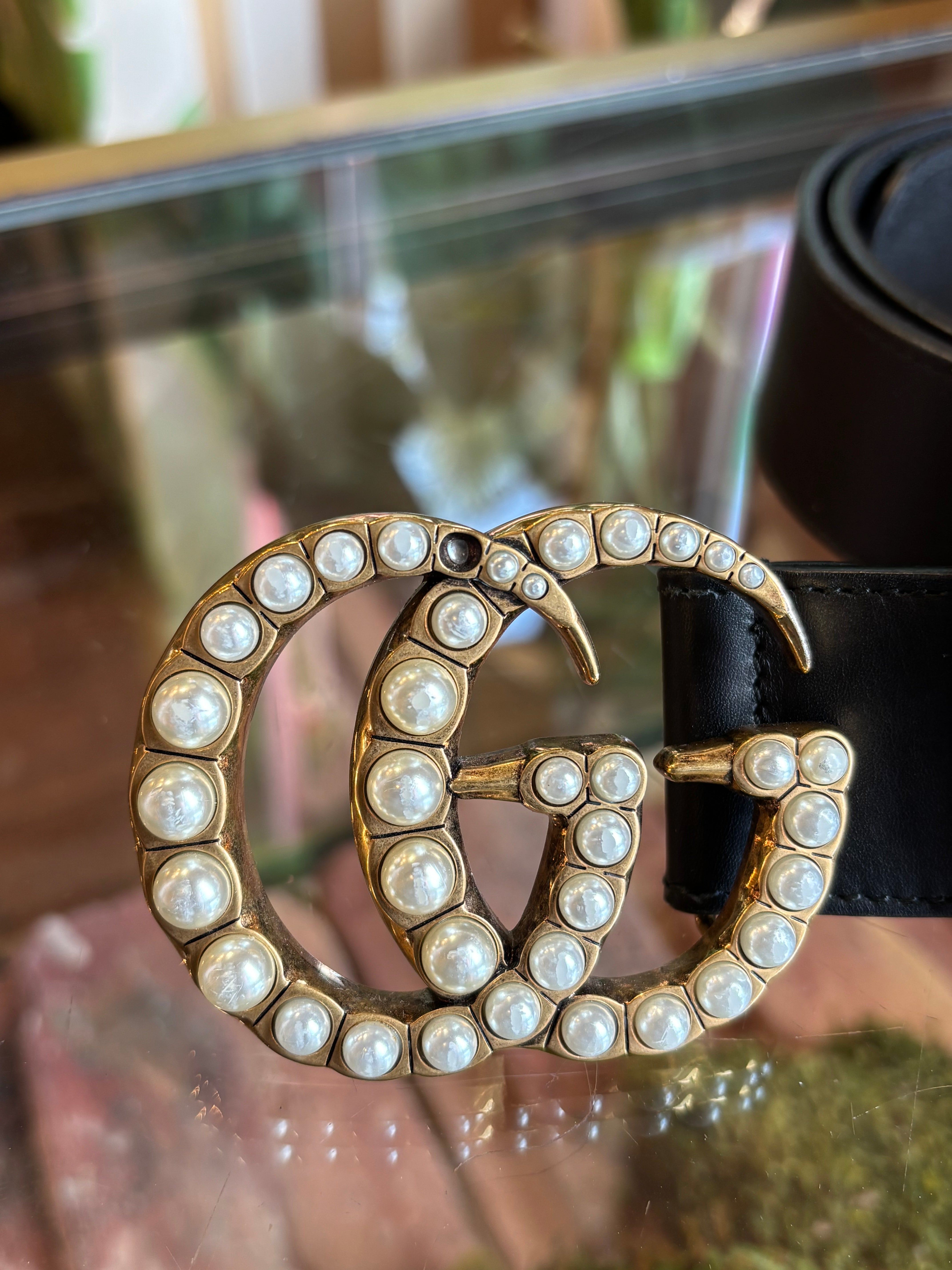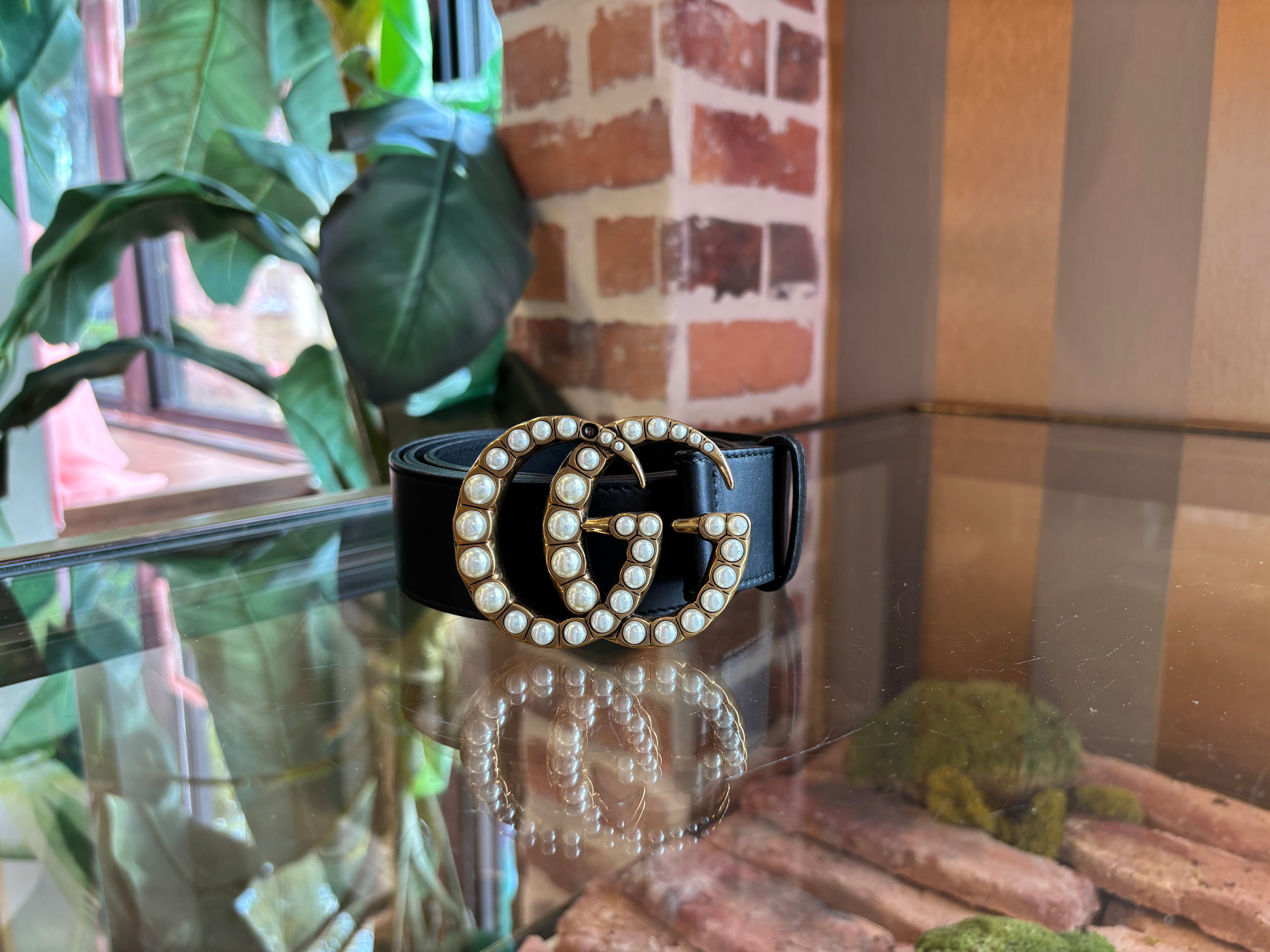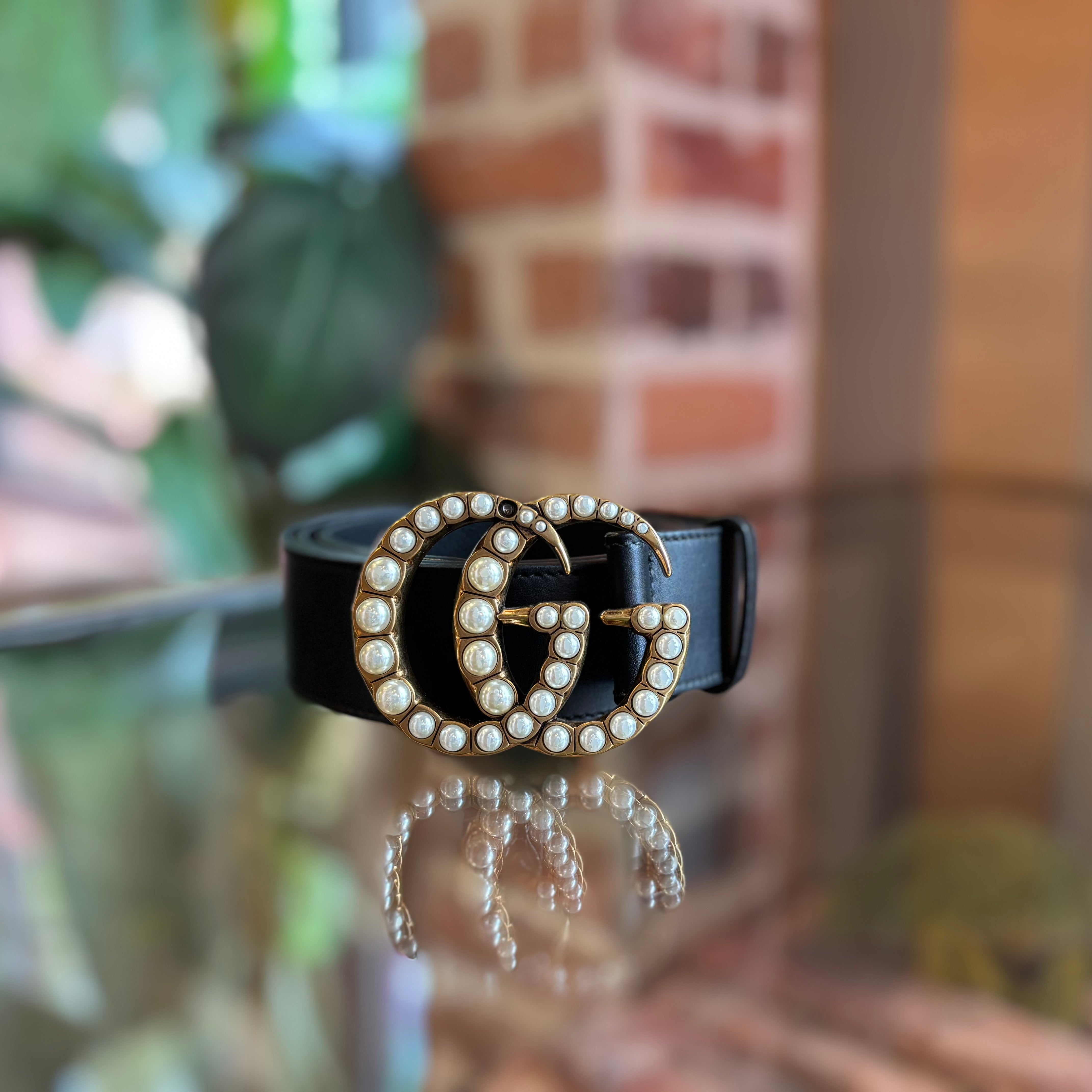 Step up your style game with the GUCCI Black GG Marmont Pearl Belt. Crafted with premium materials, this luxurious belt features a signature GG logo and delicate pearl details. Overall in Very Good Condition. B+