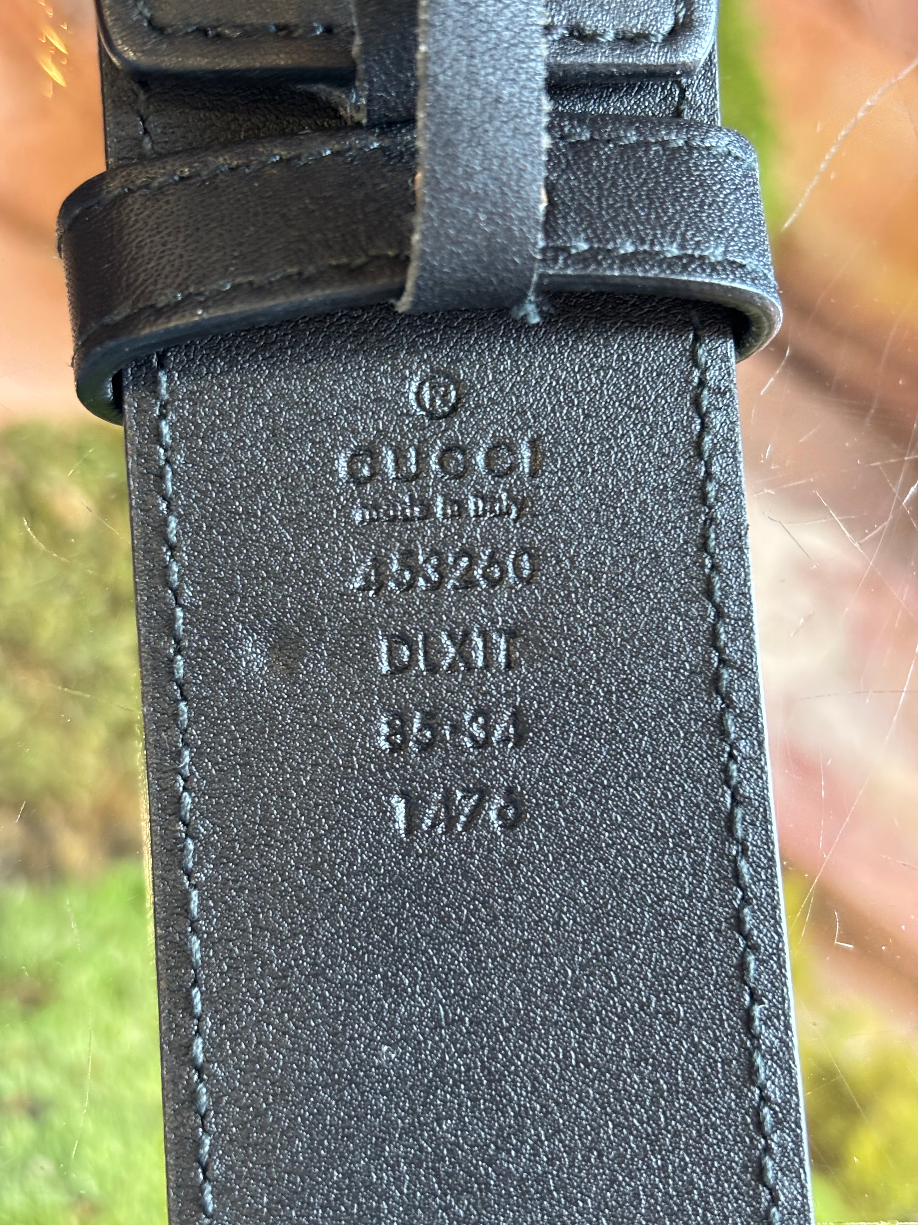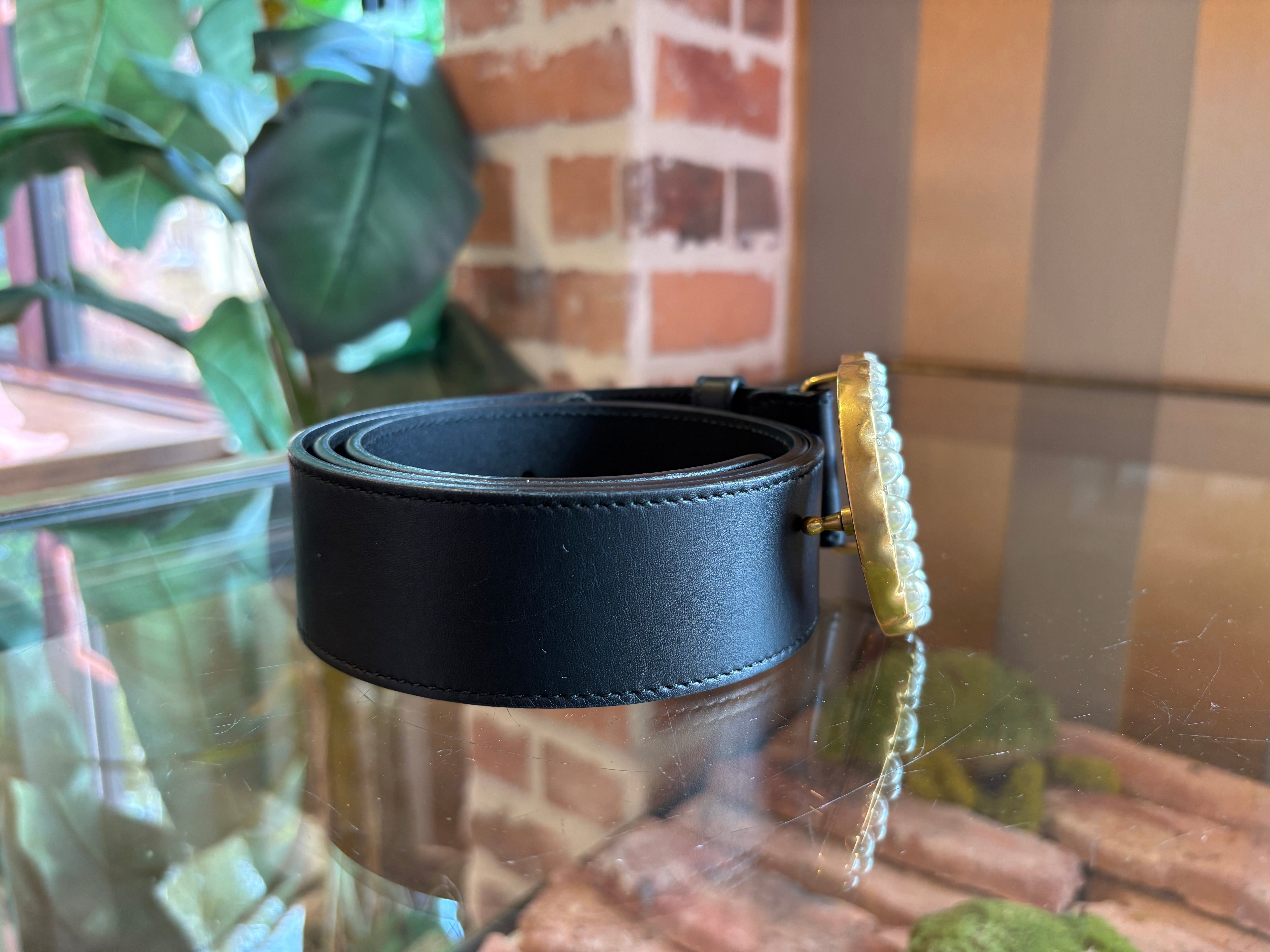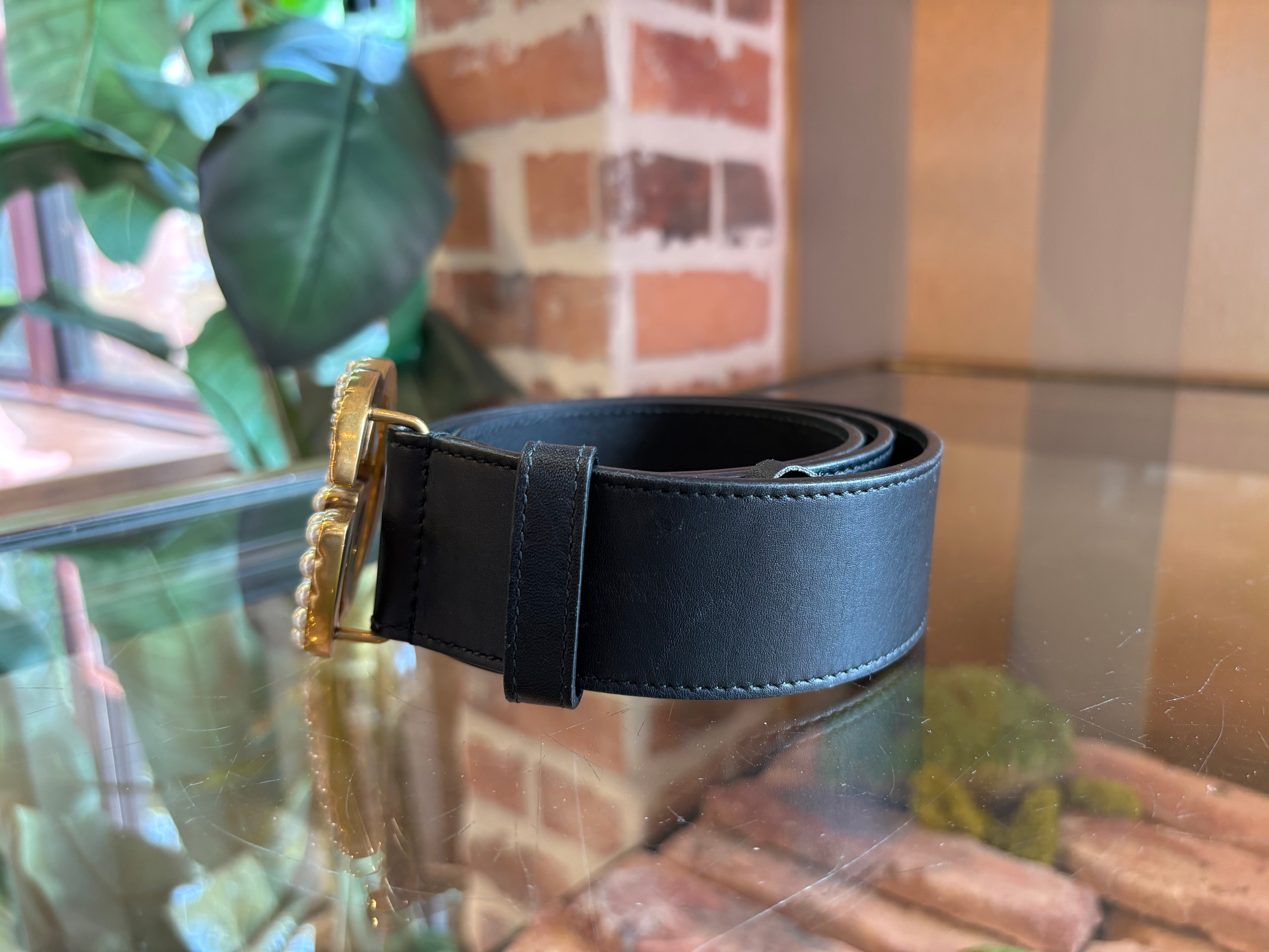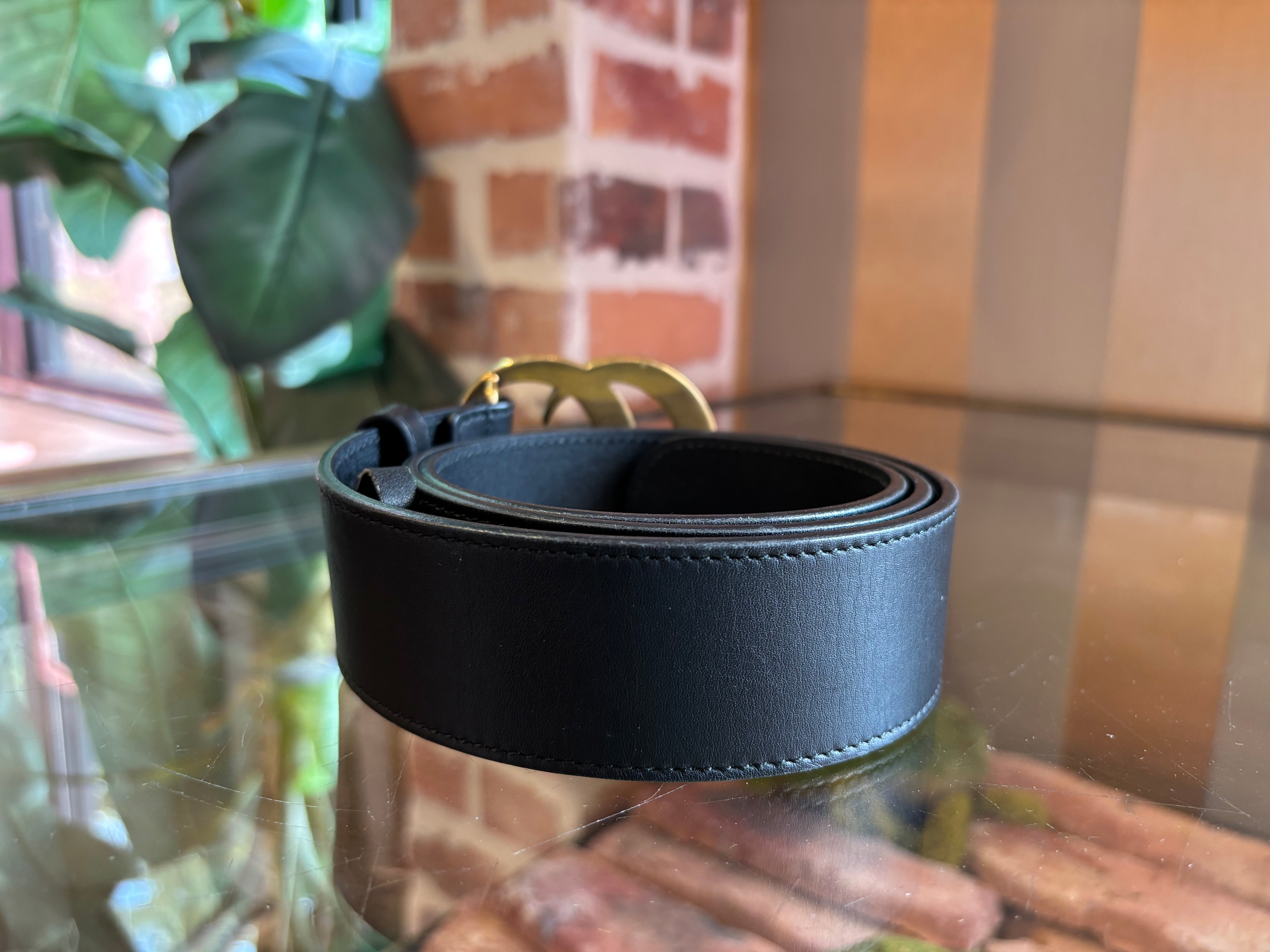 Step up your style game with the GUCCI Black GG Marmont Pearl Belt. Crafted with premium materials, this luxurious belt features a signature GG logo and delicate pearl details. Overall in Very Good Condition. B+
