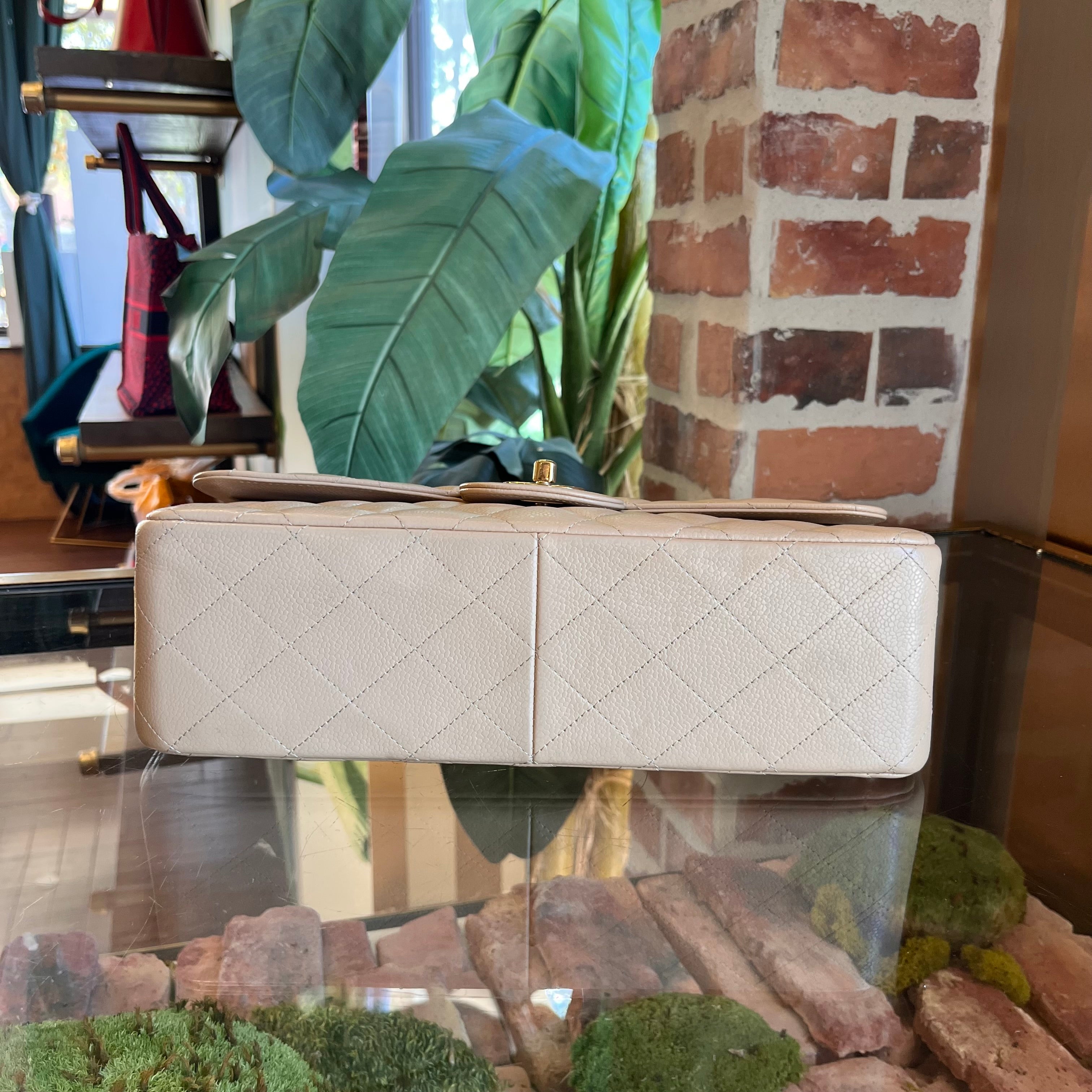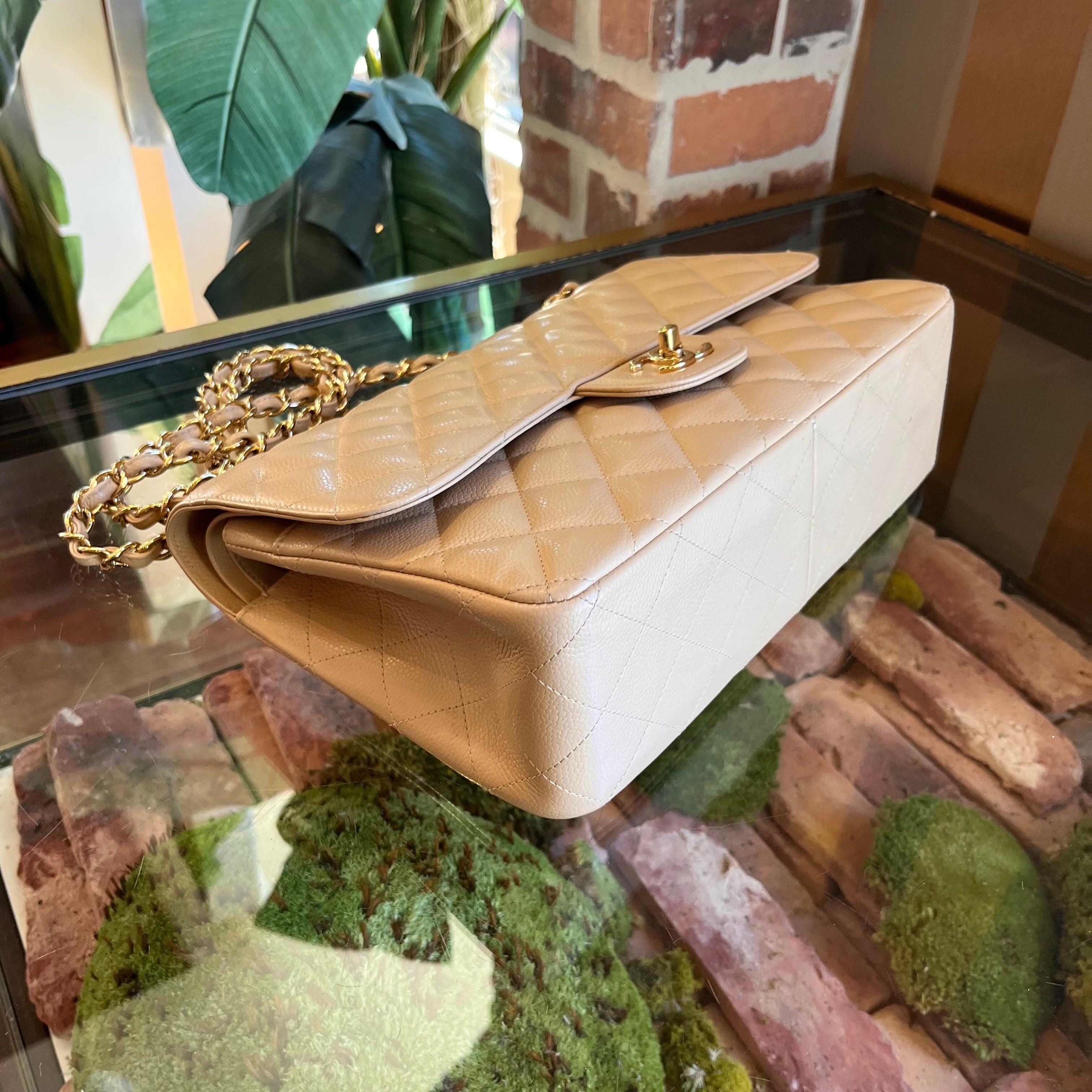 CHANEL Classic Jumbo Double Flap Beige Quilted Caviar Shoulder Bag