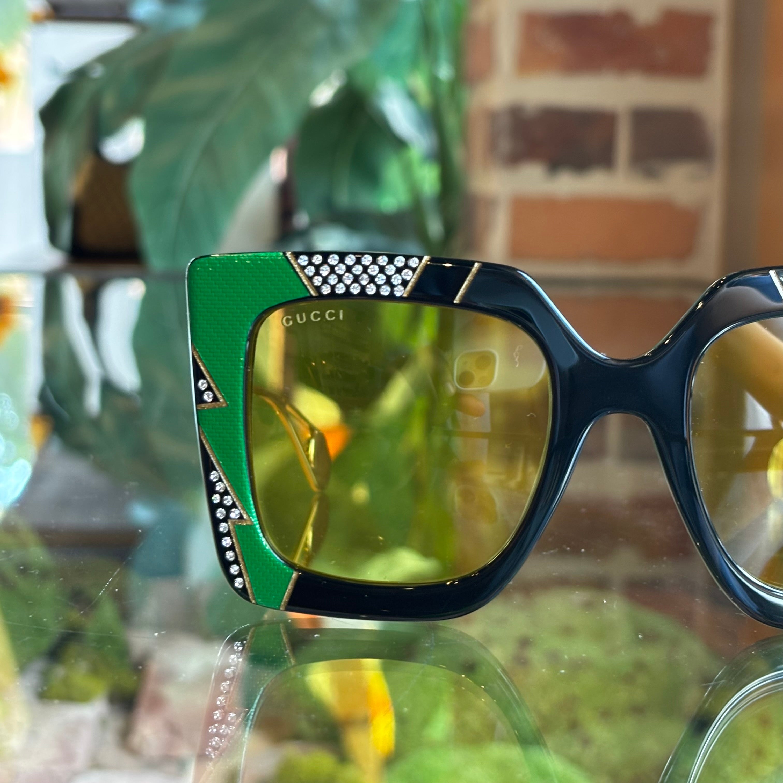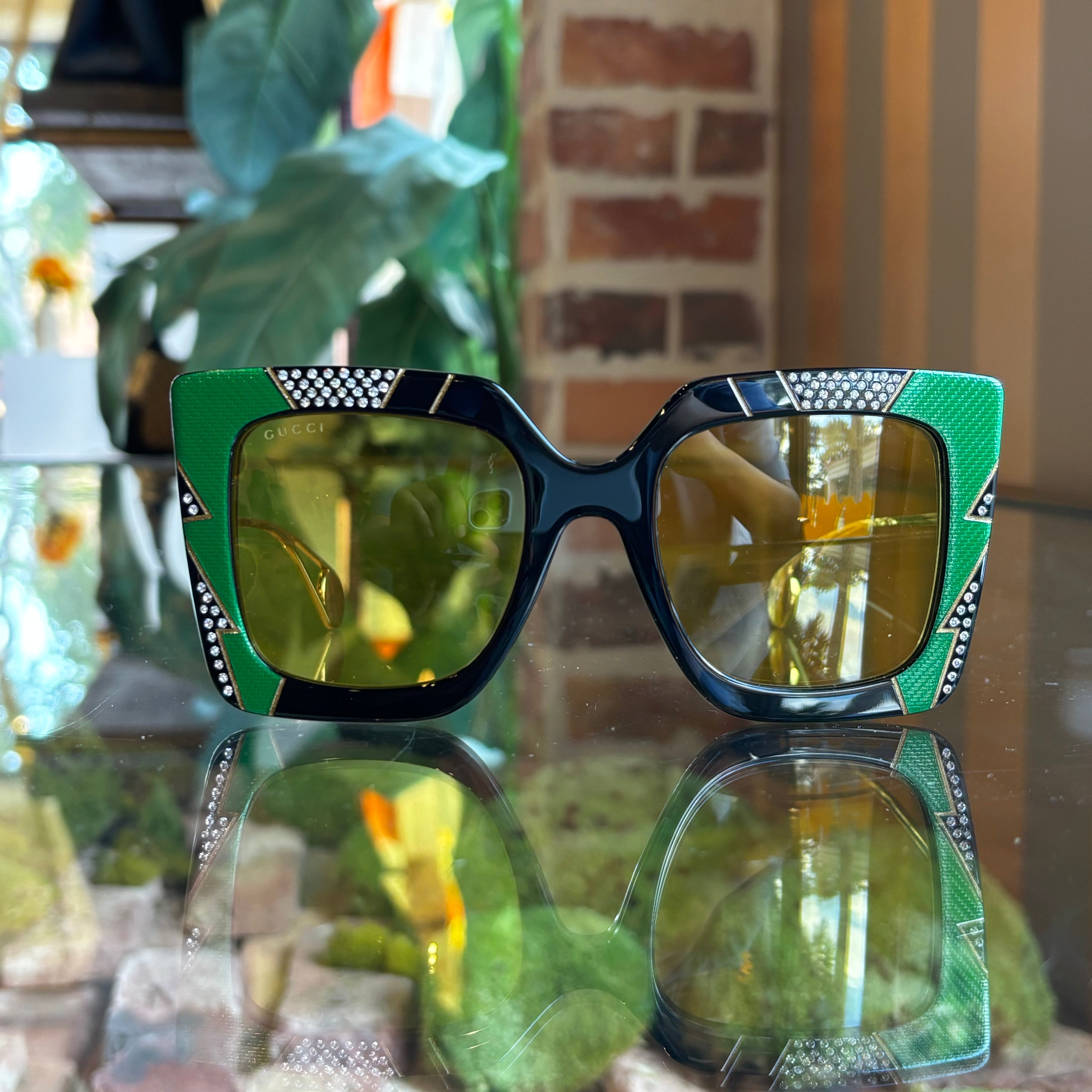 GUCCI GG0435/S Black Crystal Embellished Green Snake Skin Acetate Square Sunglasses