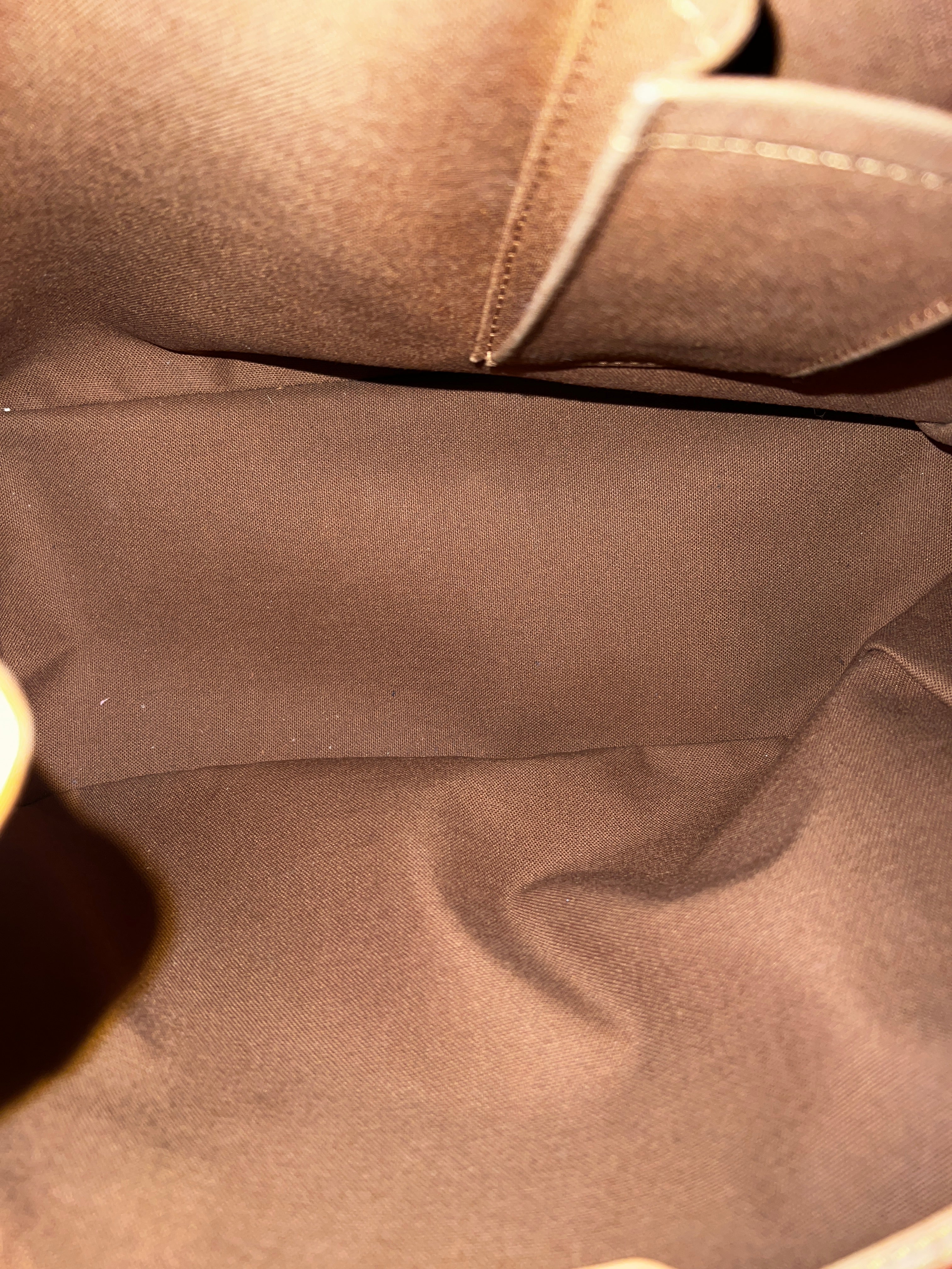 • Vachetta Leather: The vachetta leather has developed a light honey patina with creasing, cracking, appearing darker in high contact areas, creasing, water/oil spots, scuffing and rubbing