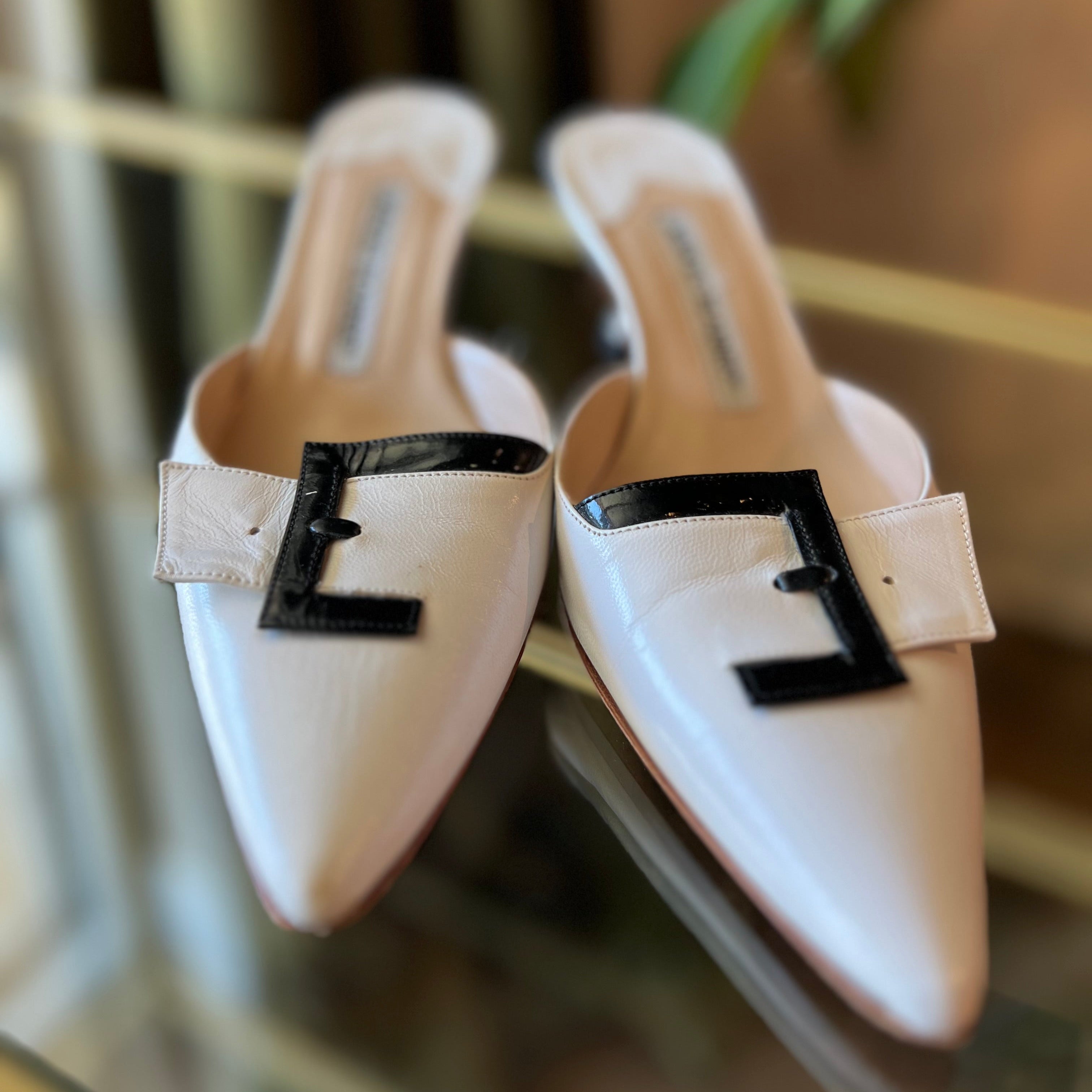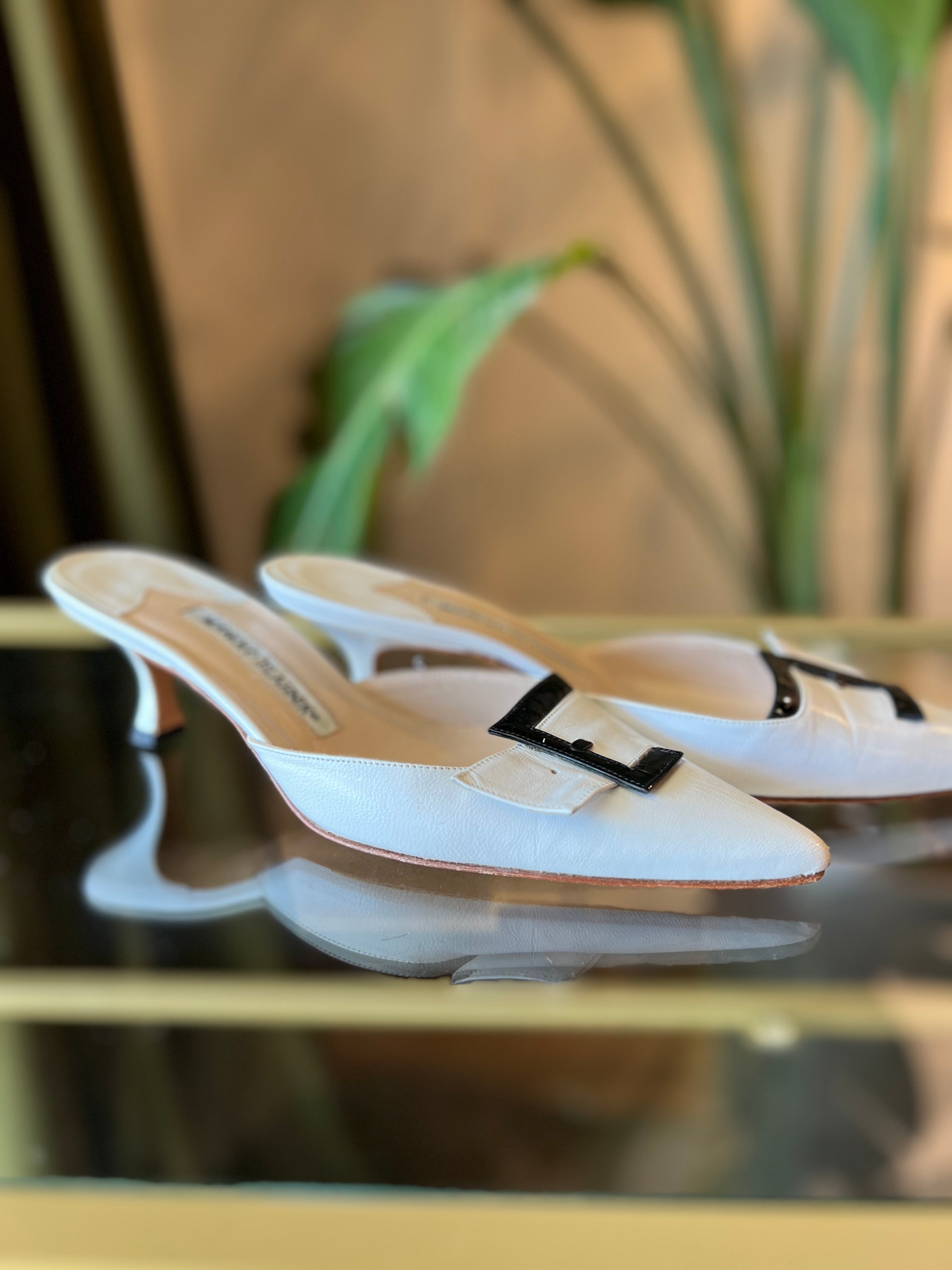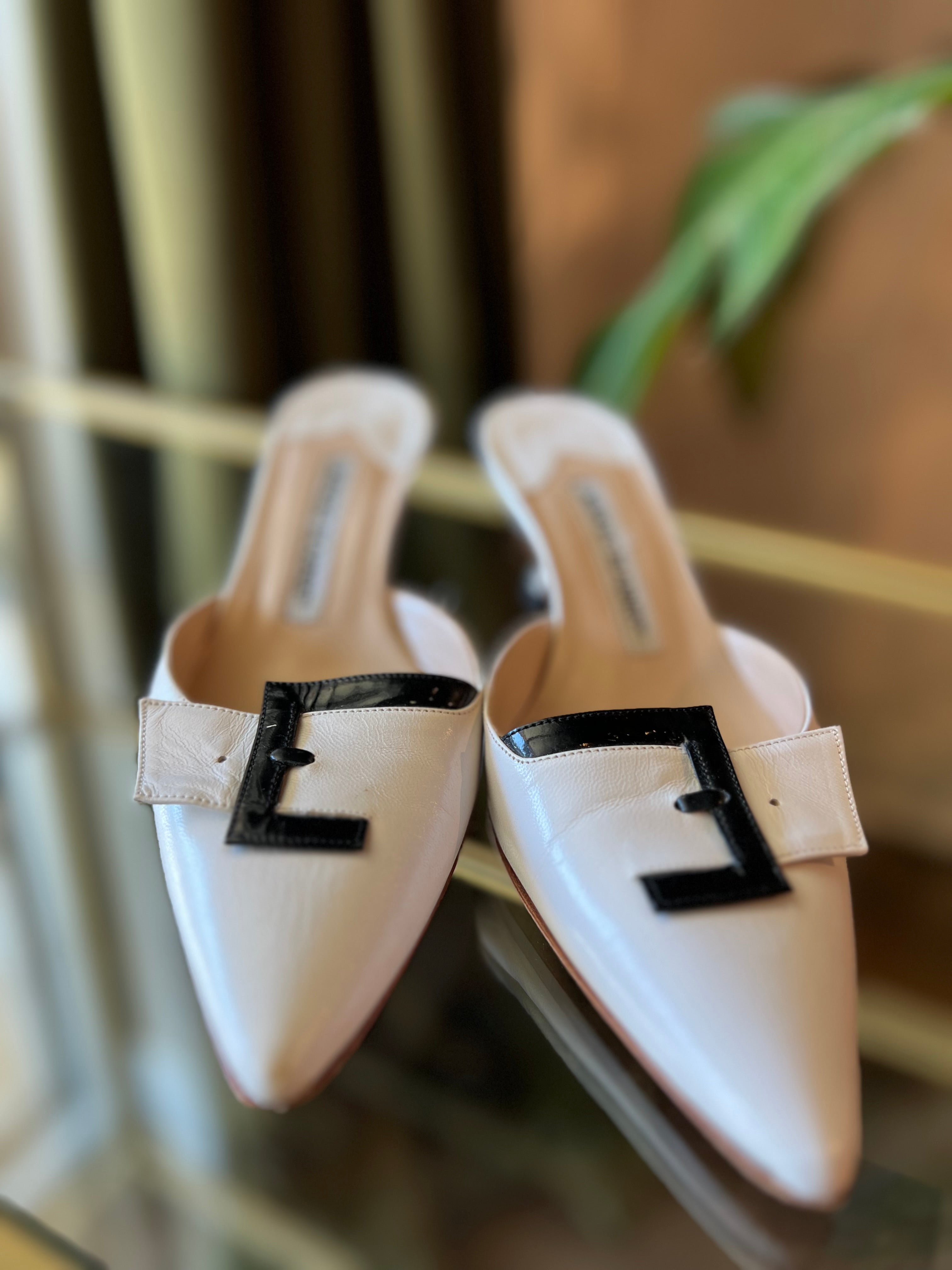 MANOLO BLAHNIK White Patent Leather Buckle Mules SZ36 (6US)