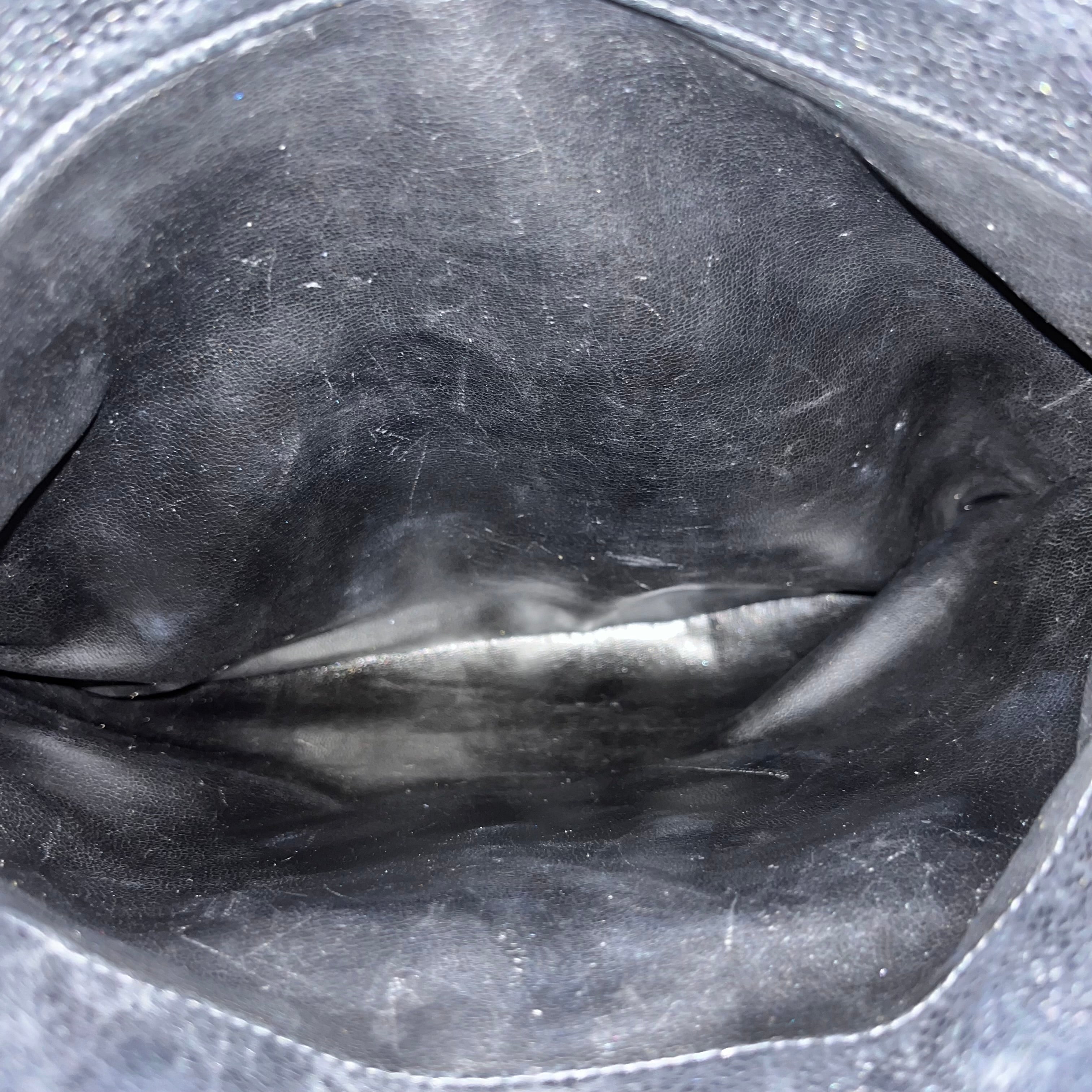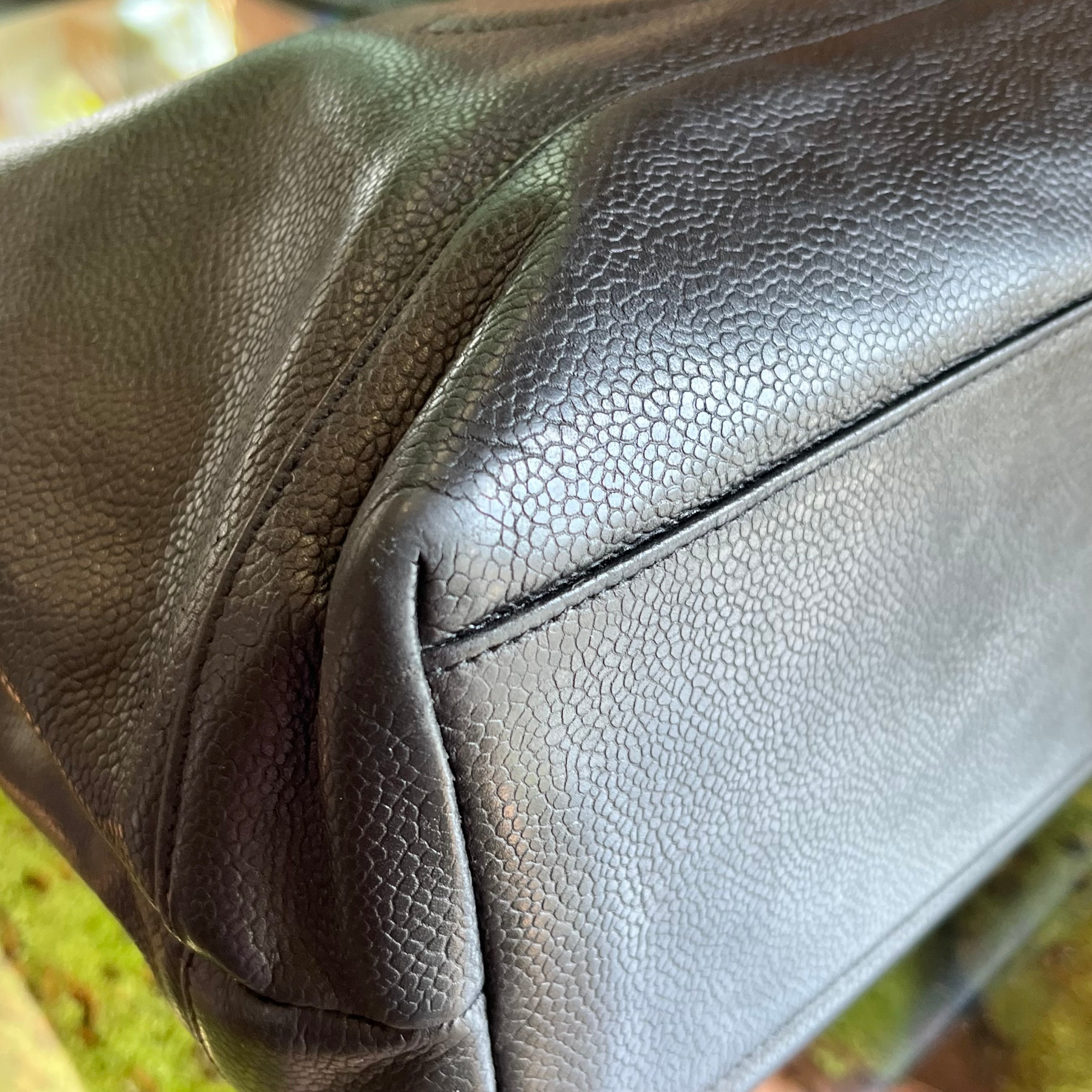 A classic tote in Chanel's durable caviar leather, featuring the iconic CC logo for timeless elegance. The structured silhouette and double top handles offer polished sophistication, while the spacious interior fits daily essentials with ease. Perfect for those who appreciate understated luxury with everyday functionality. B+ Very Good Condition