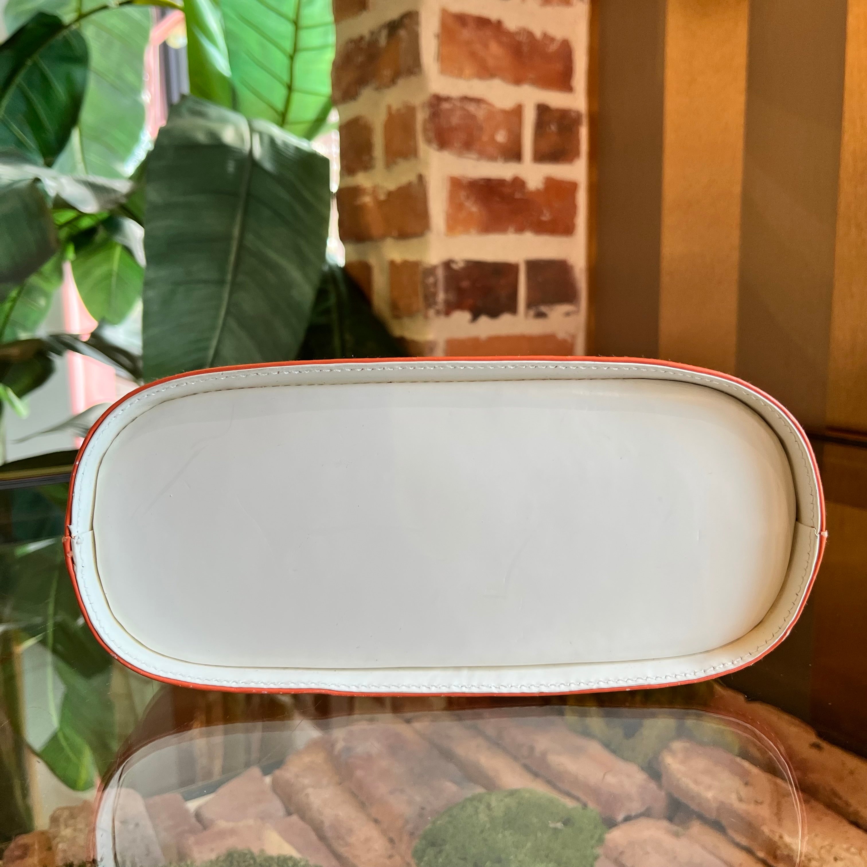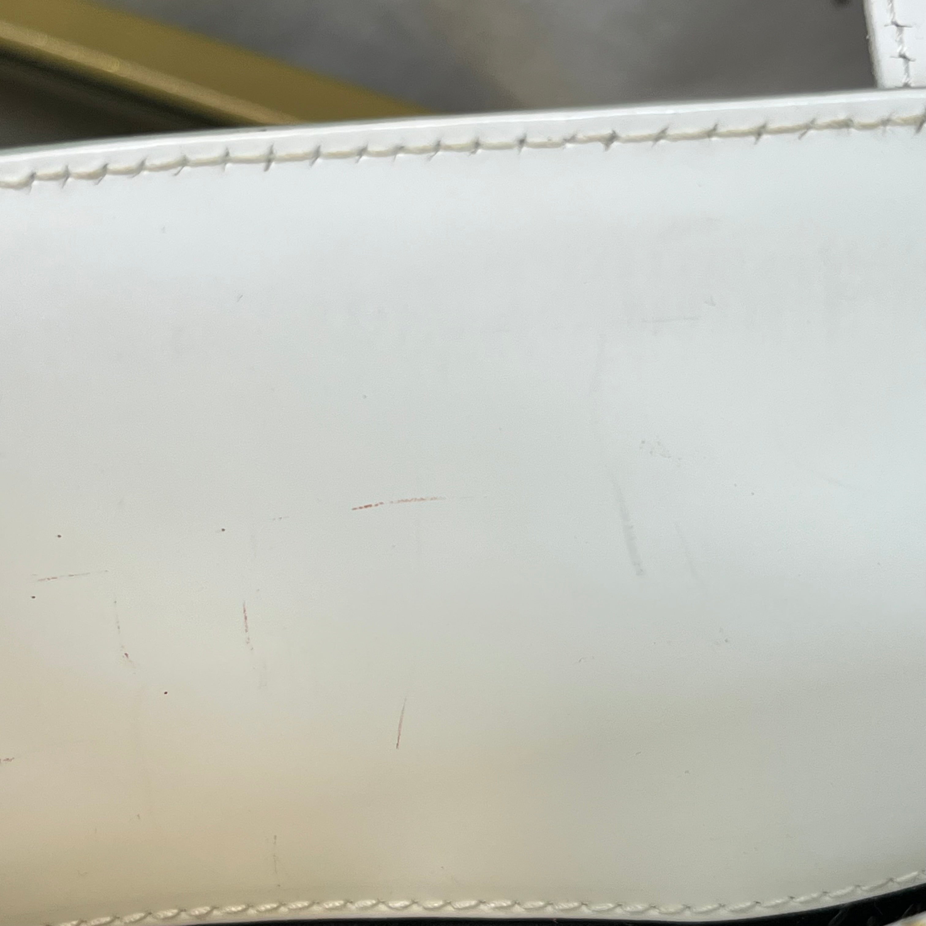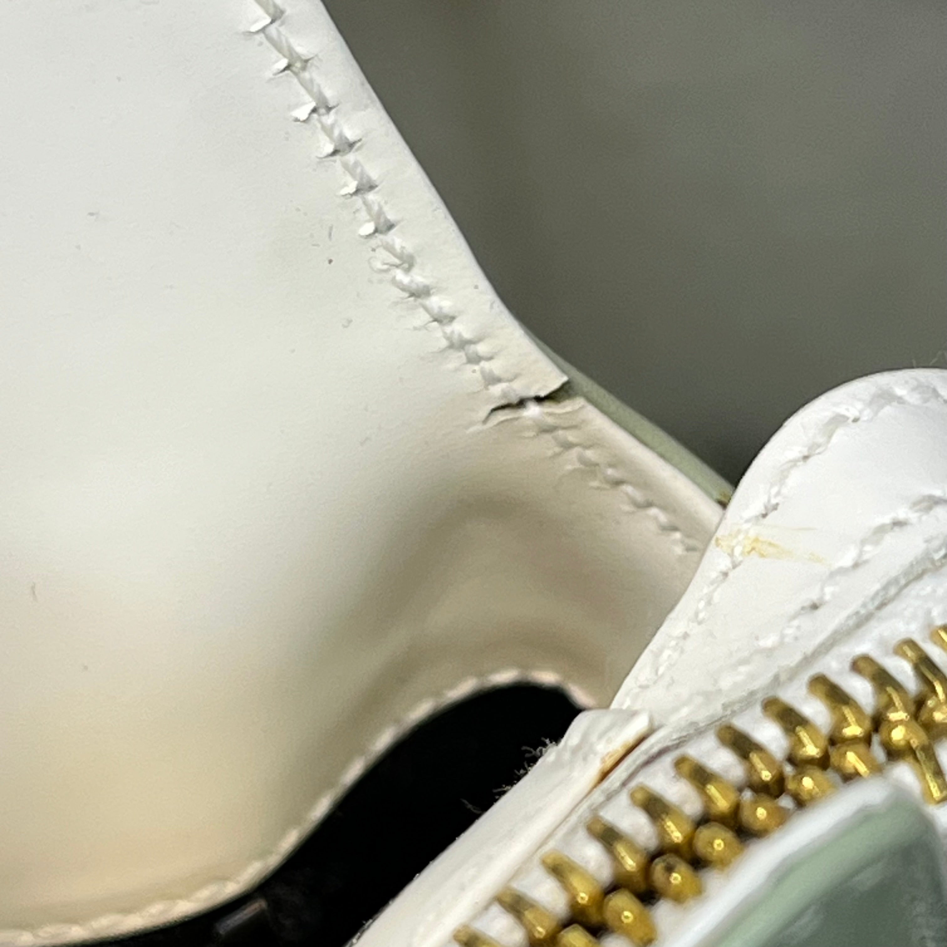 - Interior: The textile interior lining is clean and well-maintained, offering a fresh and vibrant backdrop. The white leather trim, however, displays subtle hardware marks, a small crack (please refer to photos), light scratches, and pen marks—details that add a touch of character and history. Despite these signs of use, the piece remains fully functional and stylish, maintaining its timeless appeal.