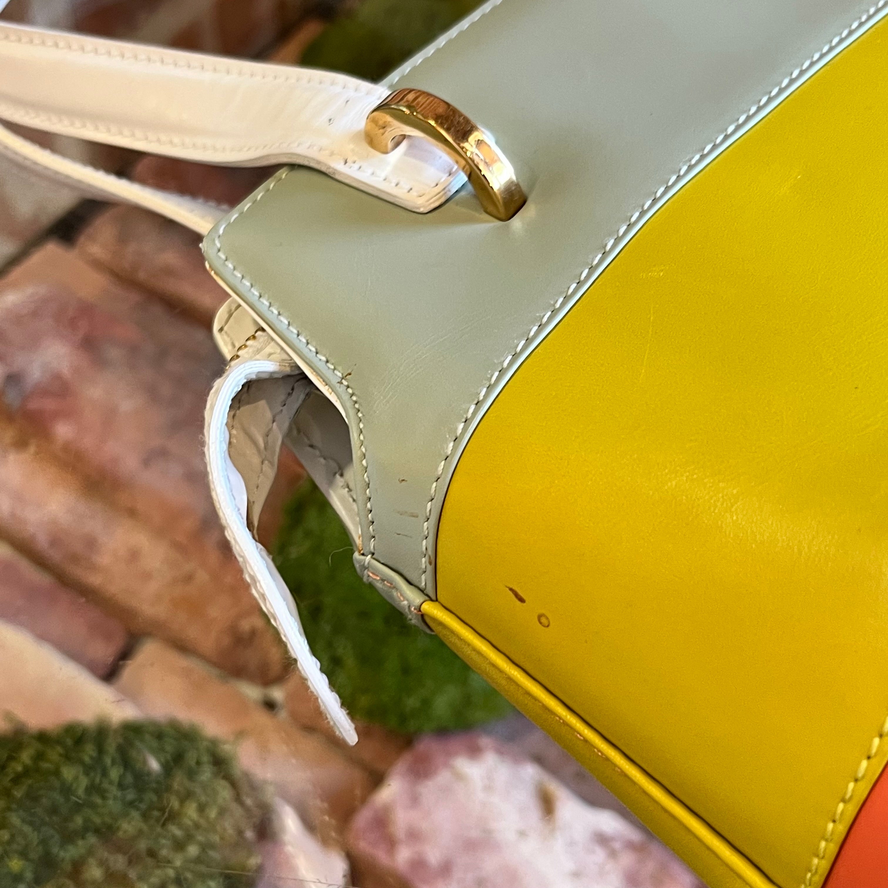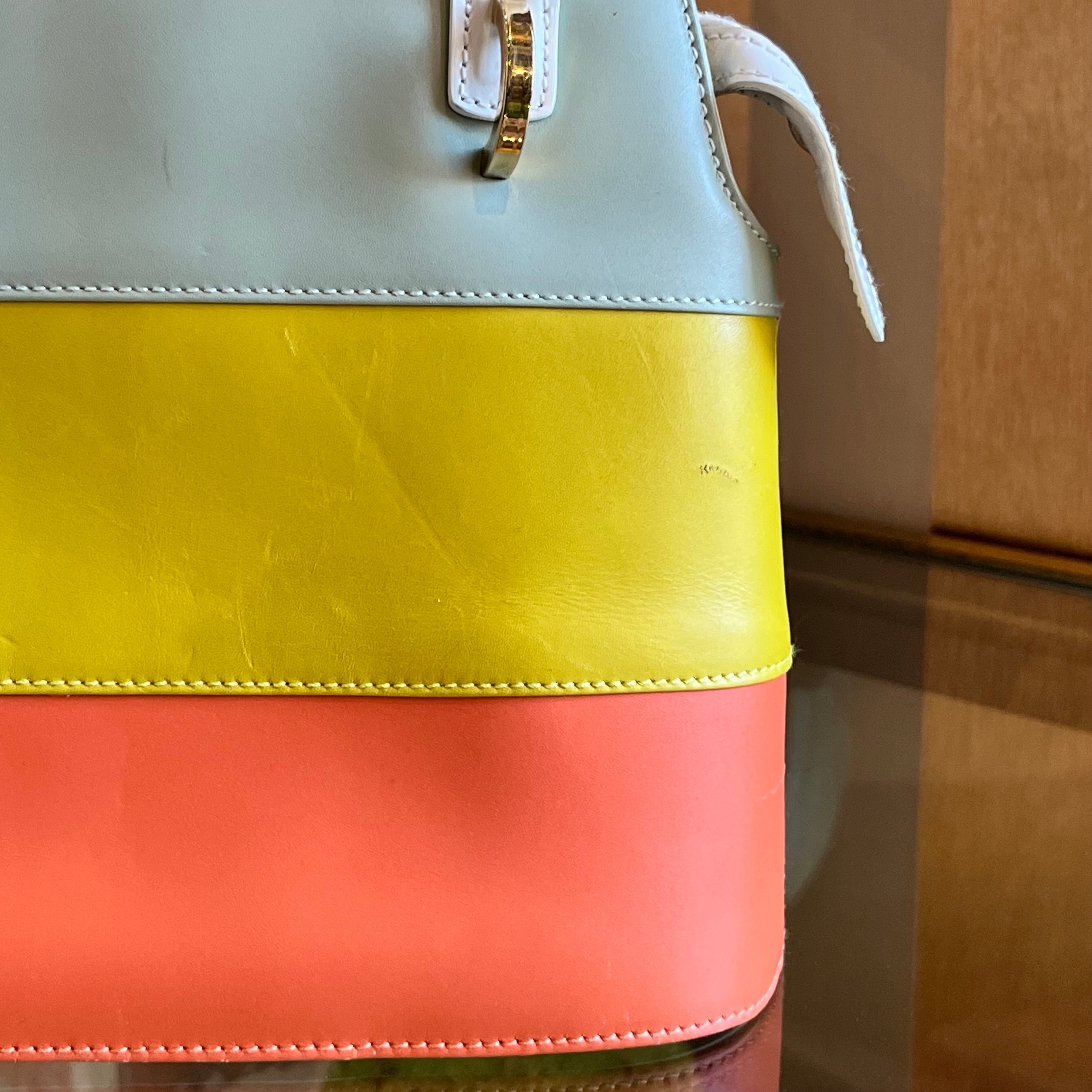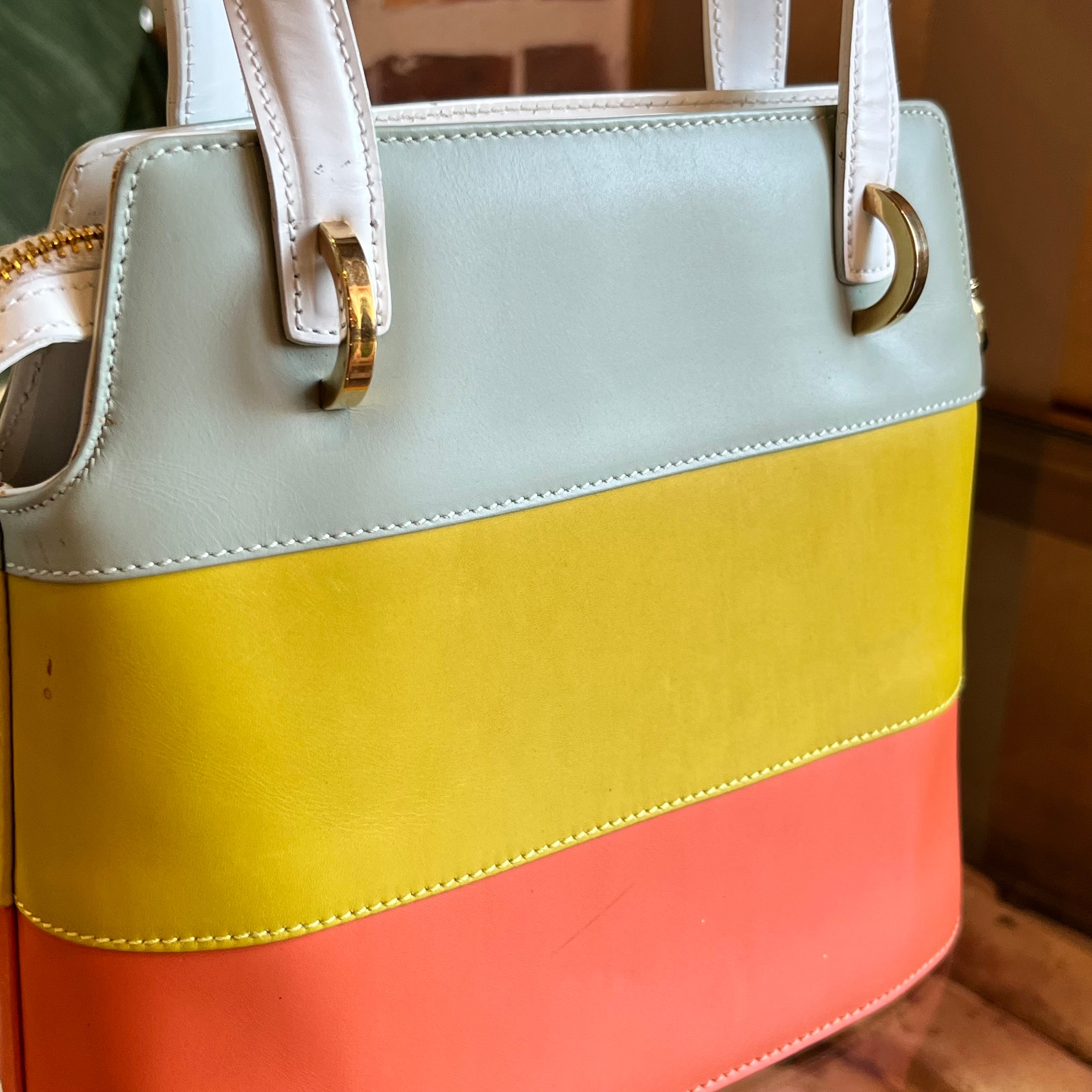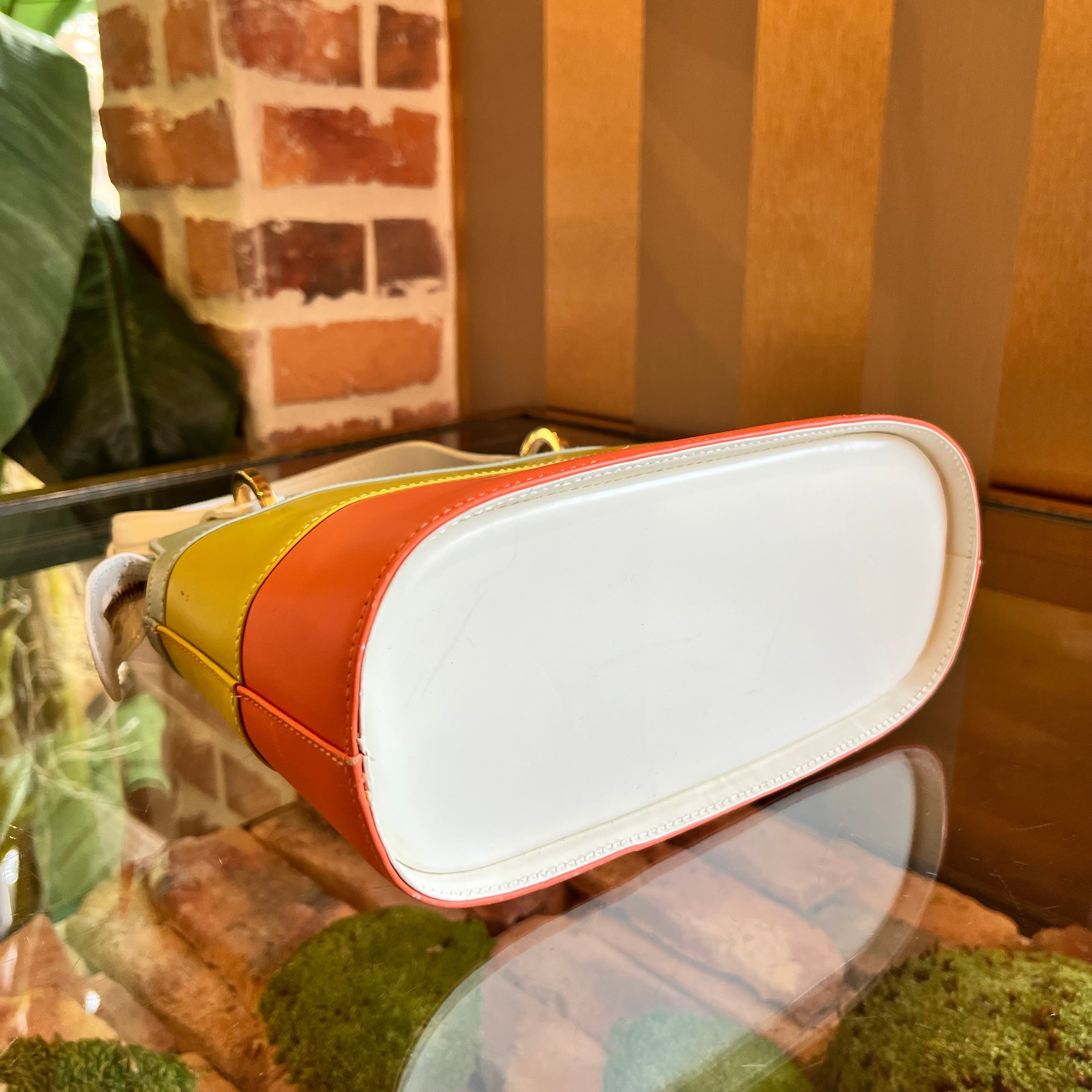 A vibrant and nostalgic statement, this tote bag features a playful striped design in blue, green, and orange, offering a touch of retro charm. Its spacious interior and timeless appeal make it a perfect blend of functionality and high-fashion allure, ideal for those who love to infuse their style with a hint of vintage flair. B+ Very Good Condition
