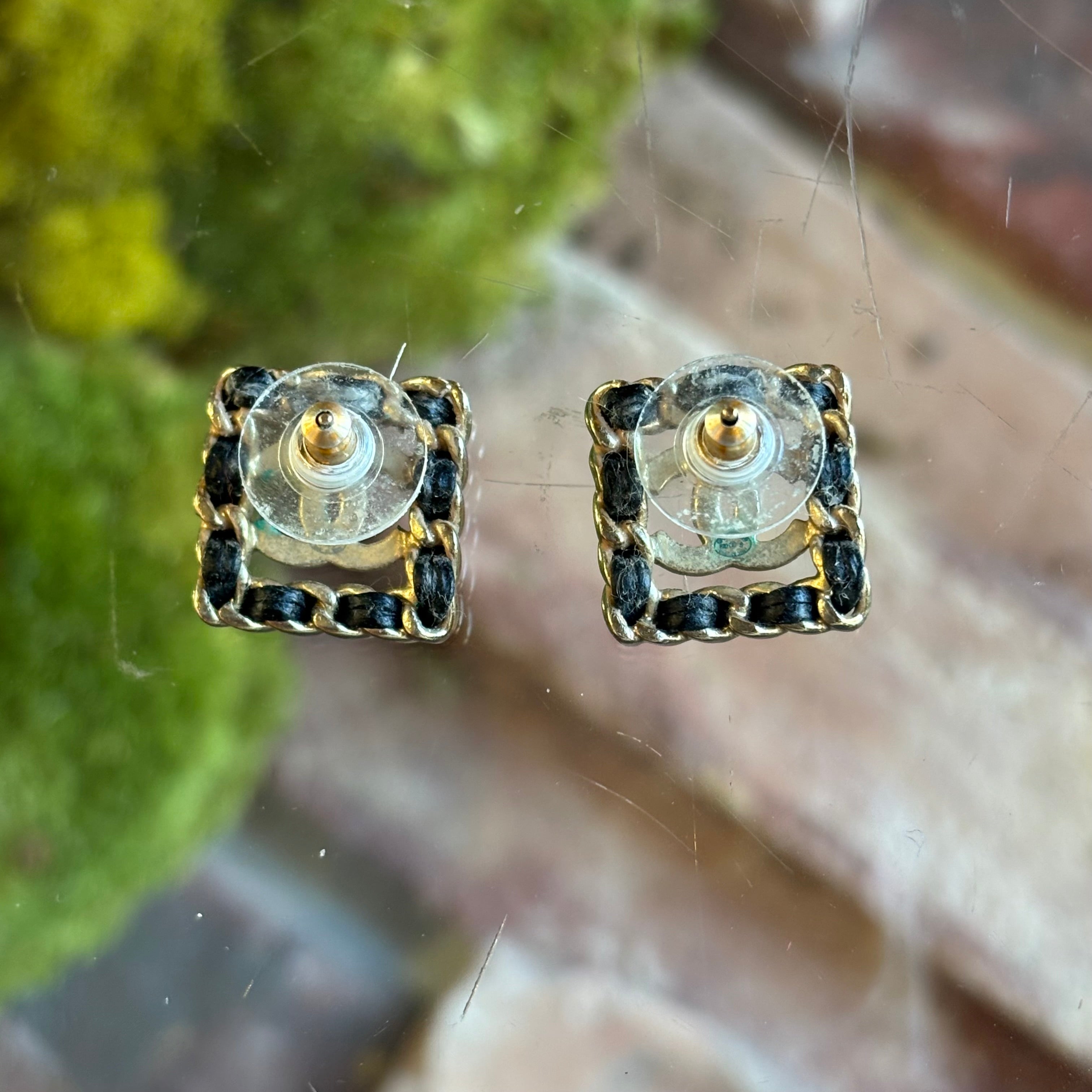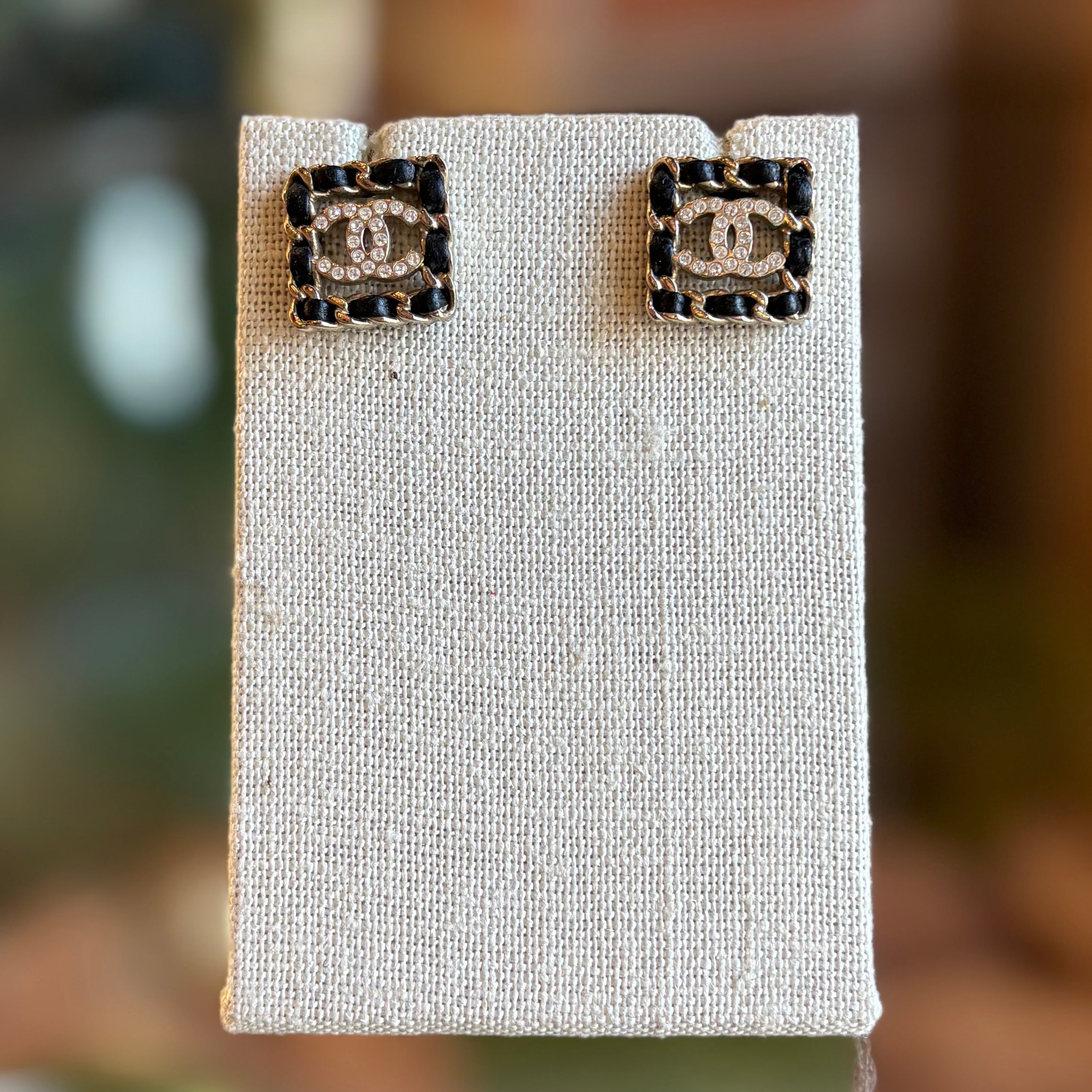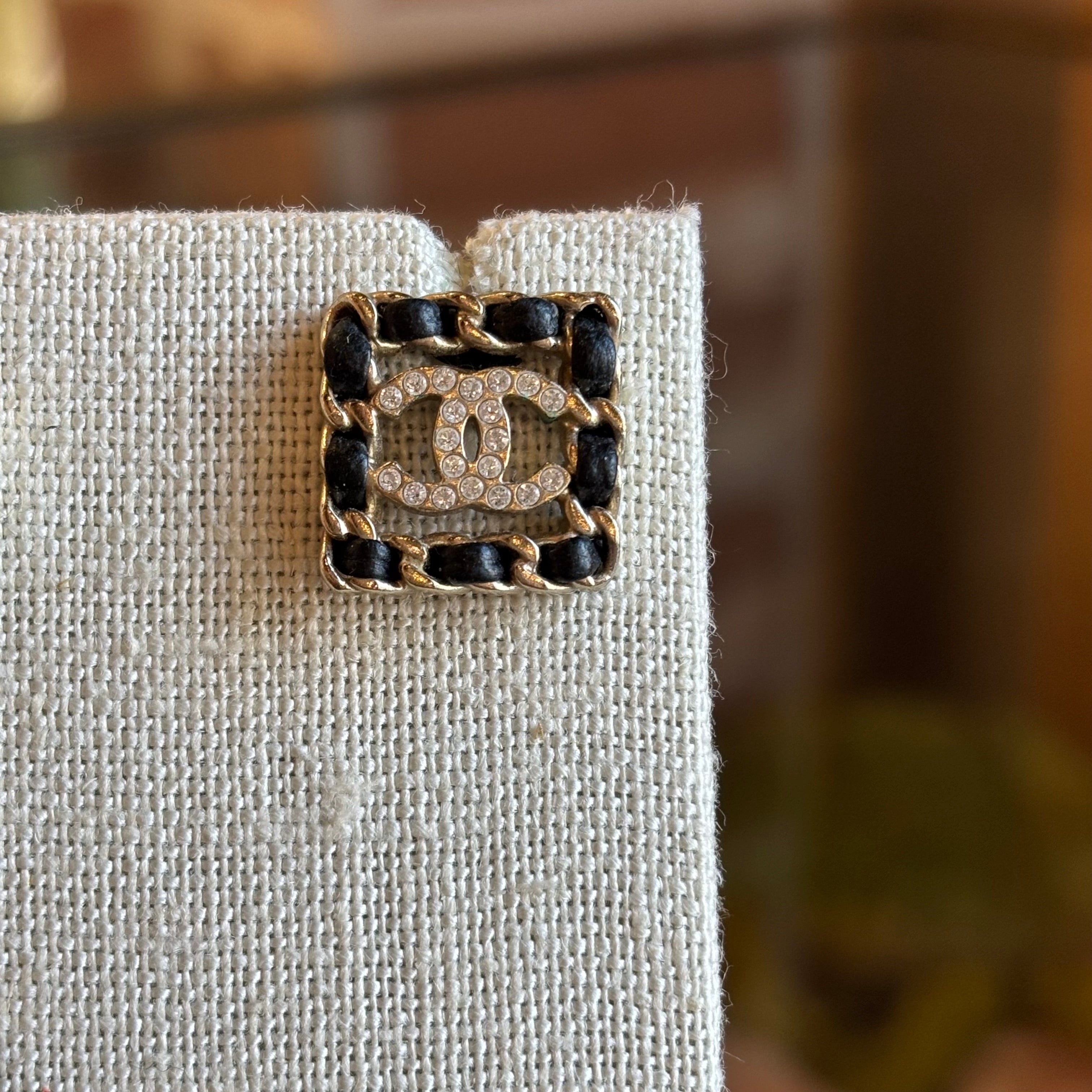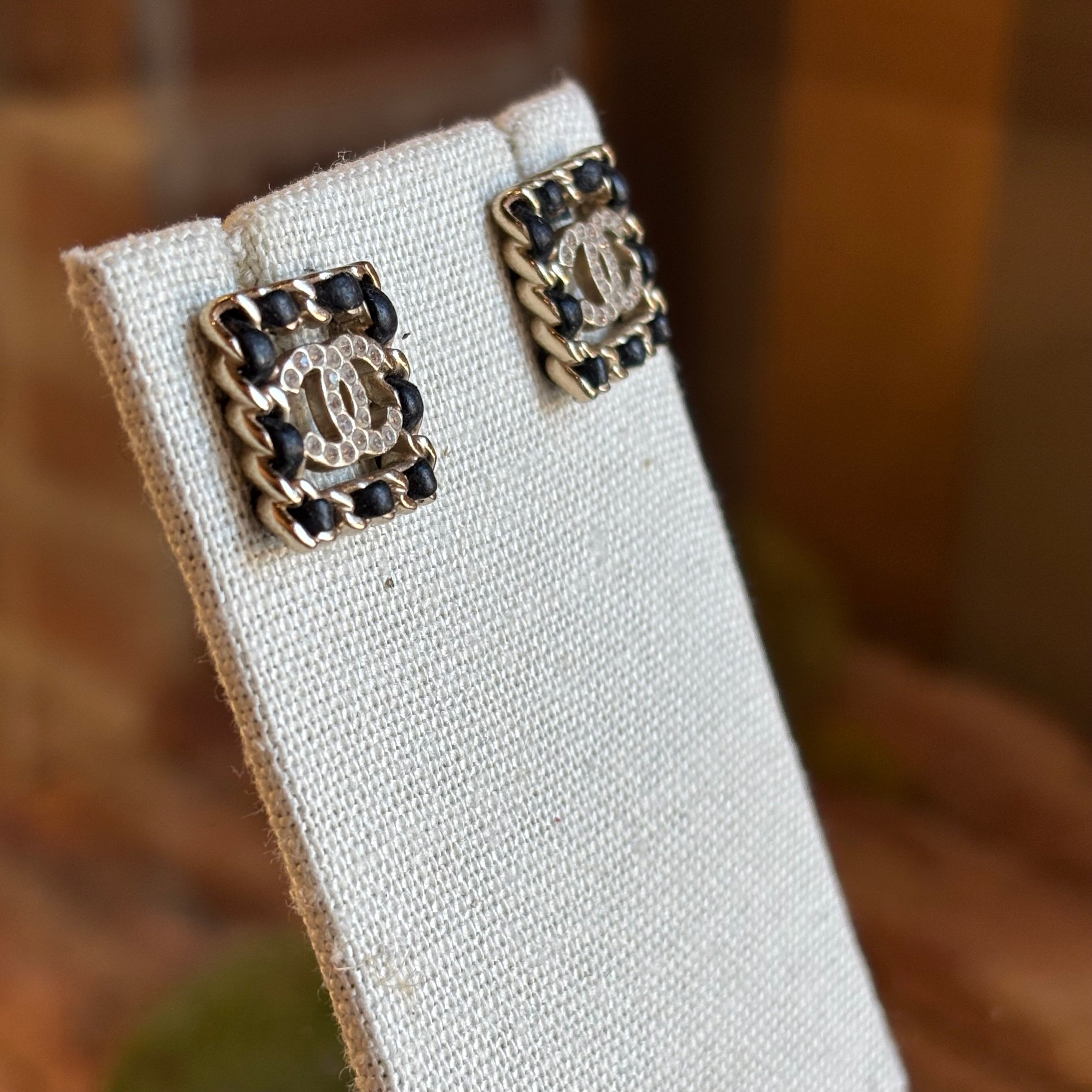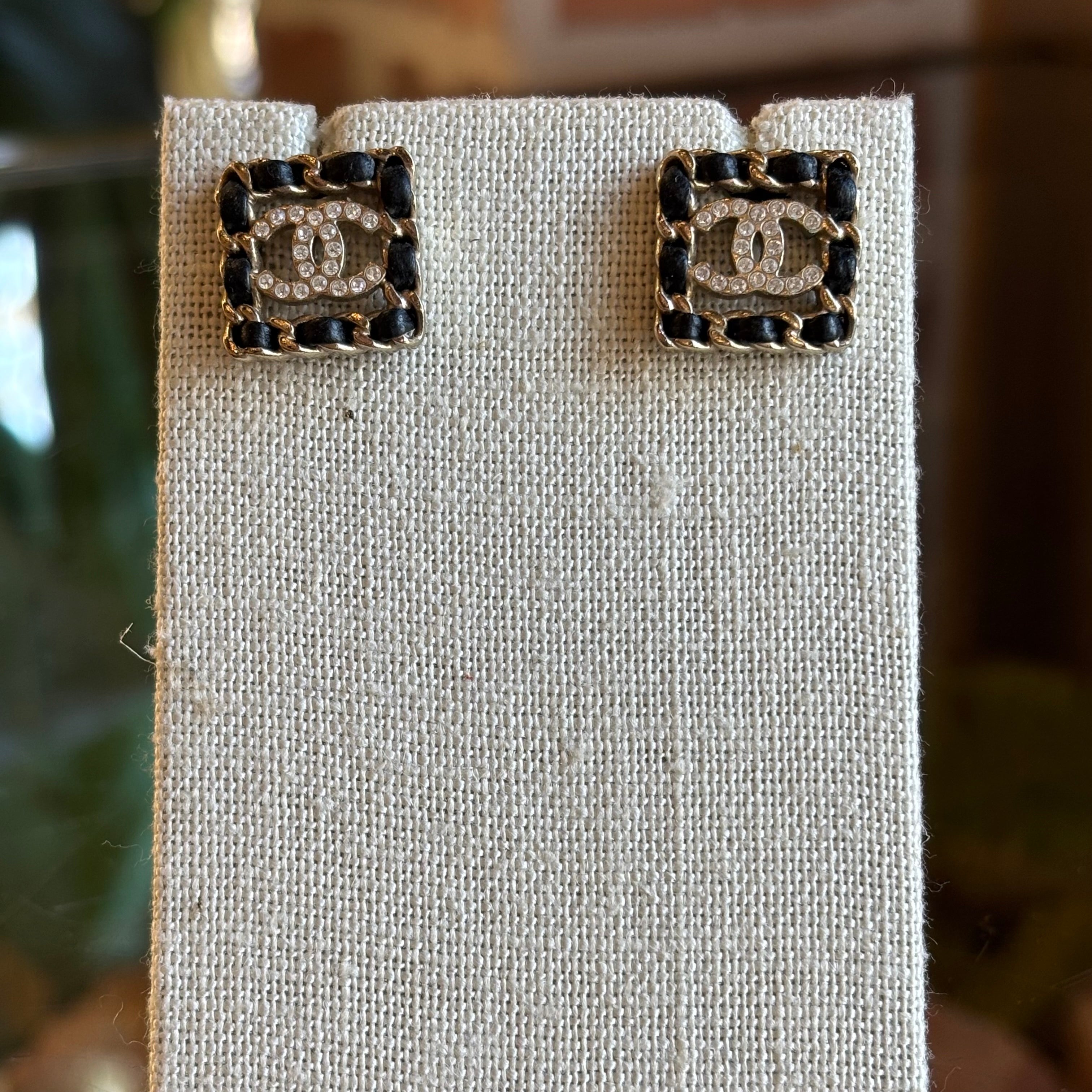 CHANEL Leather & Strass Square Woven CC Stud Earrings
