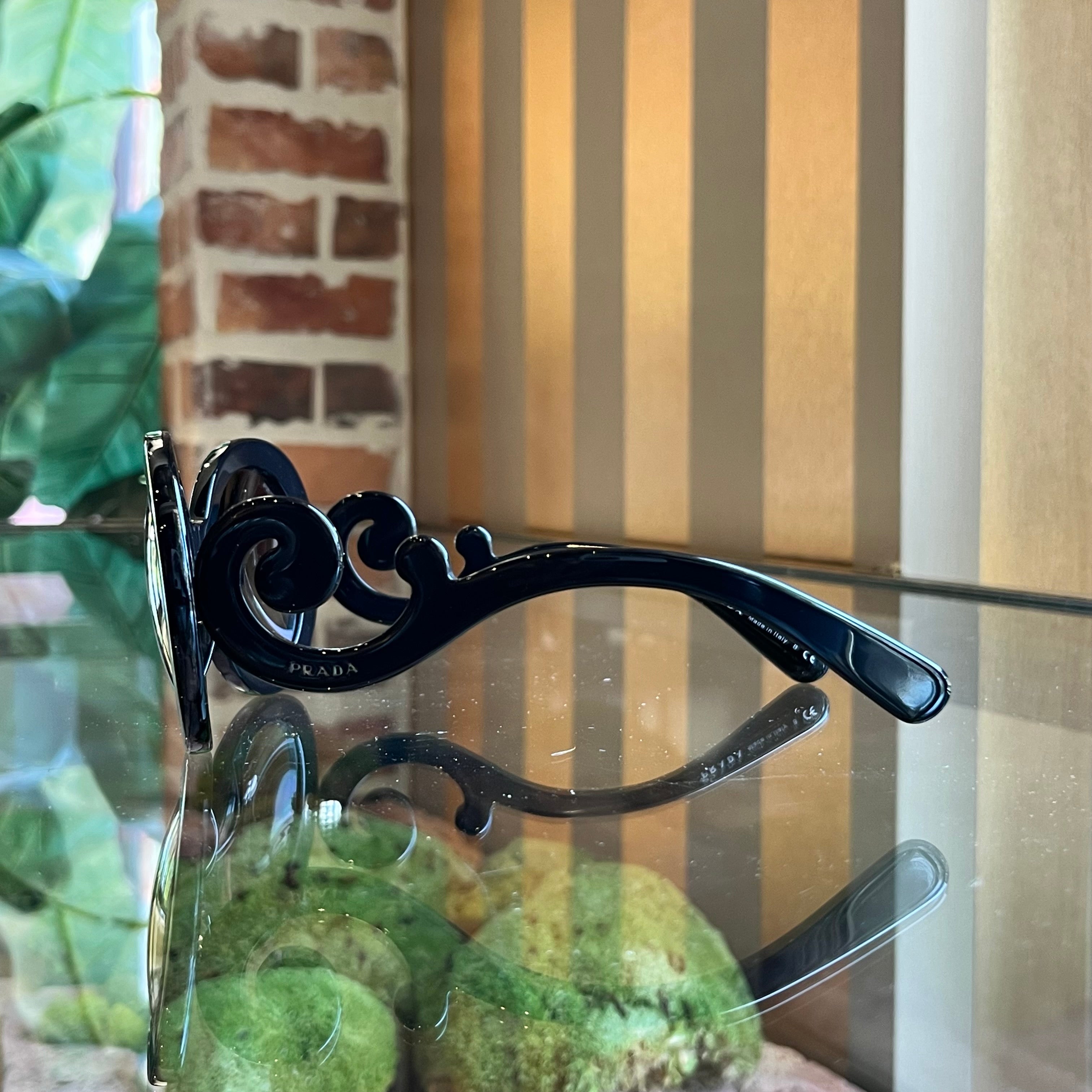These Prada Black Acetate Baroque Round Sunglasses exude bold elegance with their iconic swirling temples and round frames. A statement accessory, they elevate any look with a touch of timeless glamour. B+ Very Good Condition