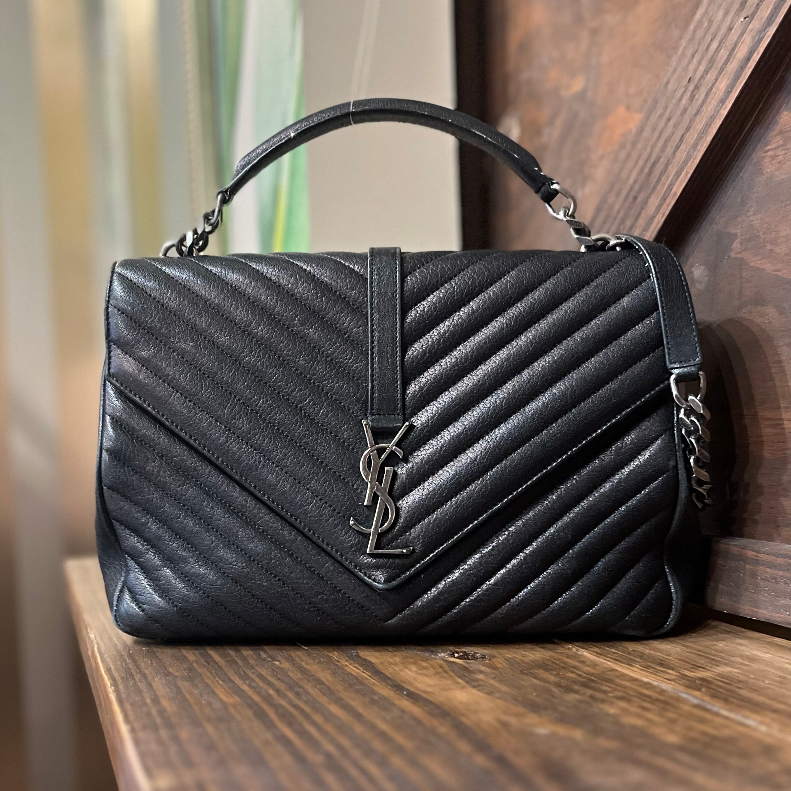 SAINT LAURENT YSL College Black Sheepskin Matelassé Chevron Monogram Shoulder Bag
