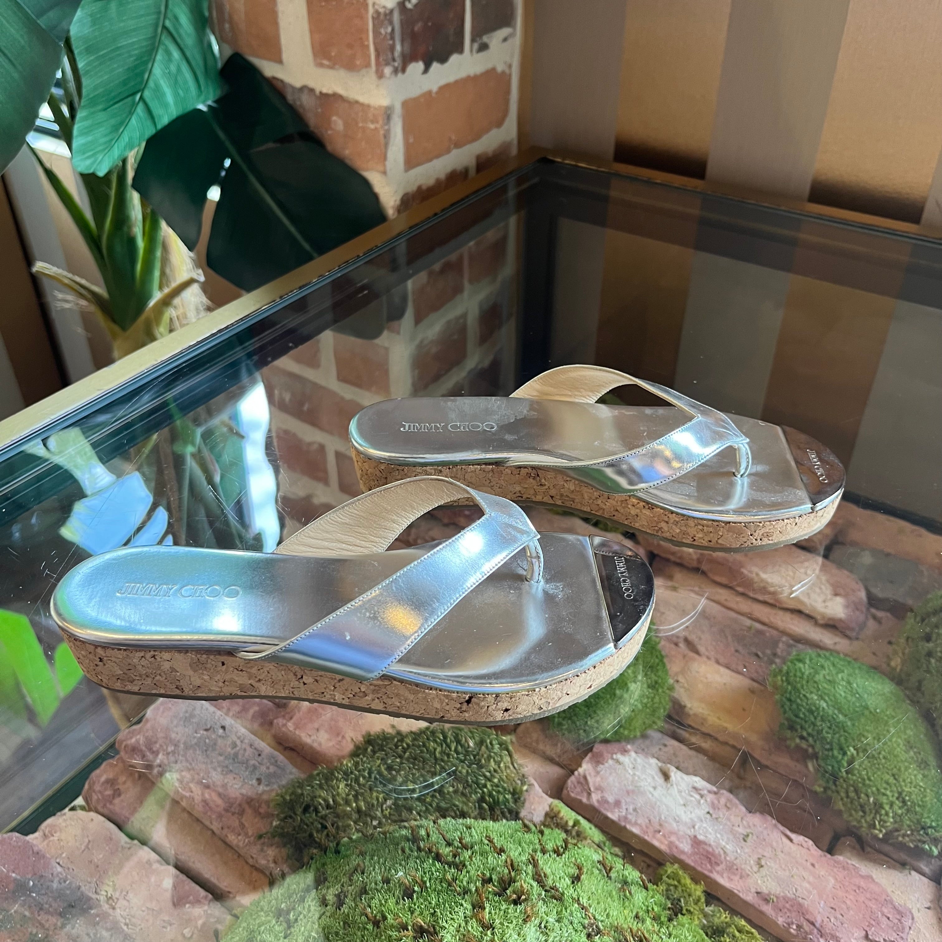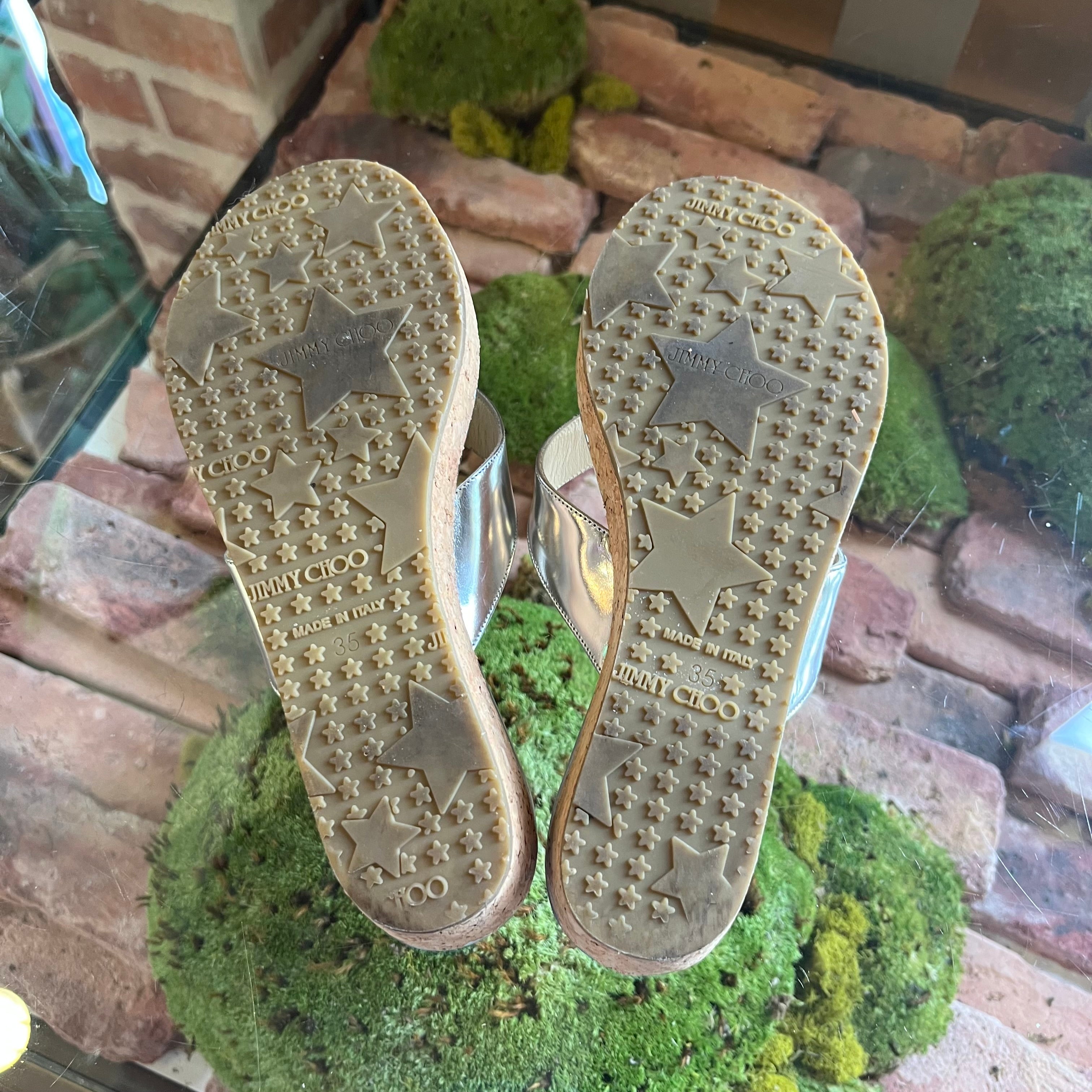 Elevate your summer style with these JIMMY CHOO Silver Platform Flip Flops in size 35. Featuring a sleek silver finish and a comfortable platform sole, they blend luxury with effortless ease. Perfect for adding a refined touch to casual looks while ensuring all-day comfort. Very good condition.